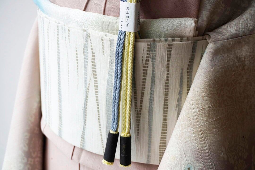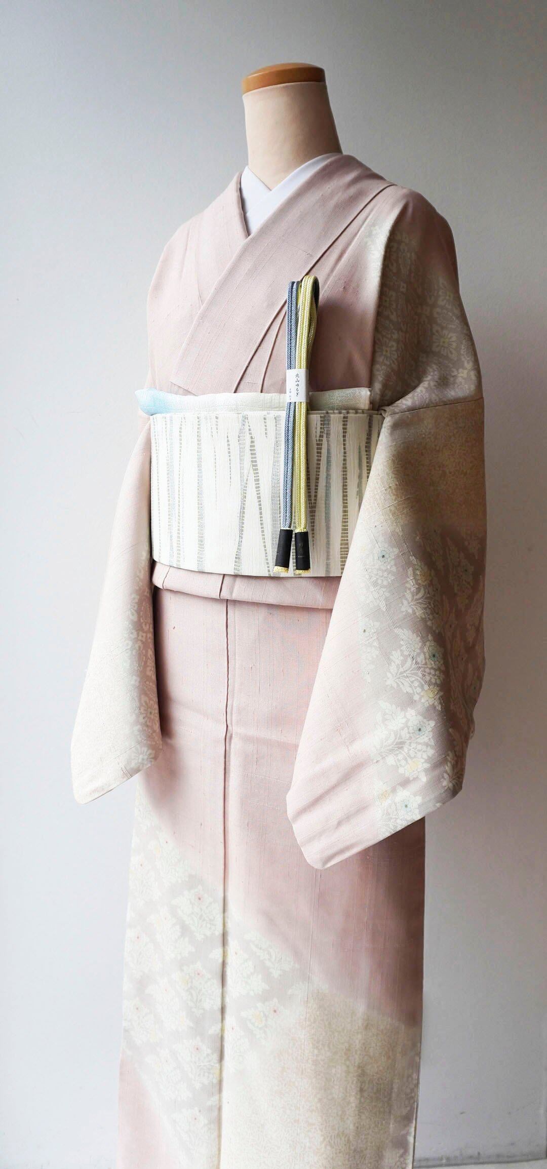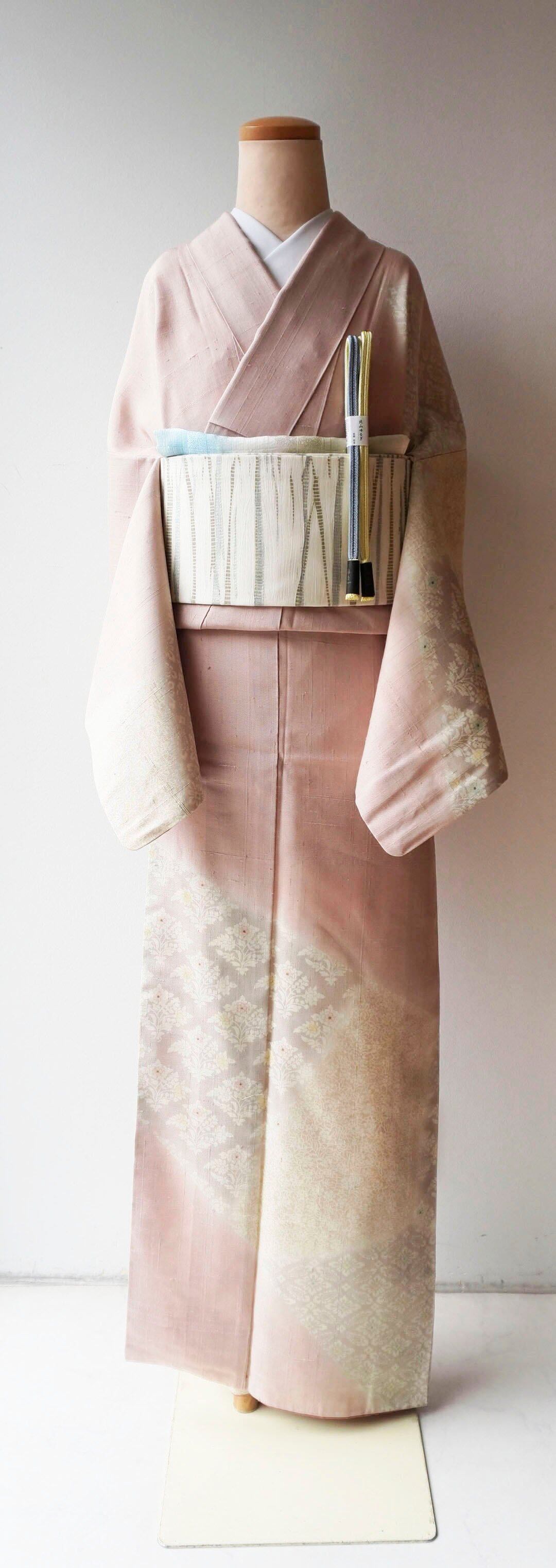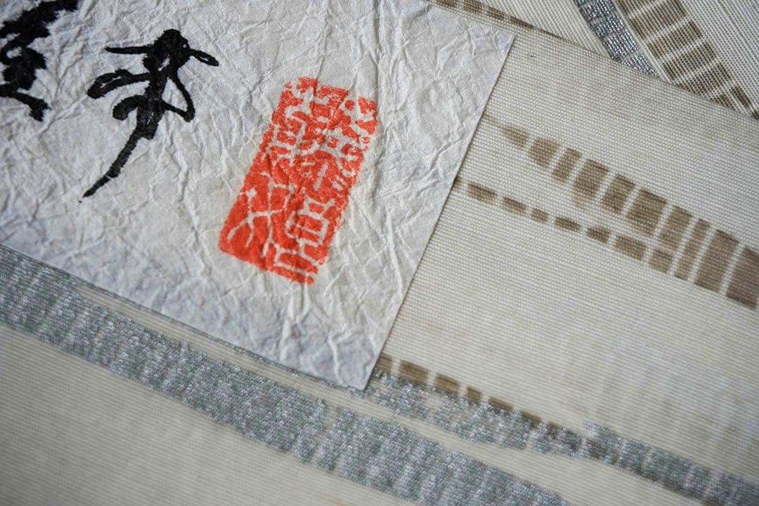 白い紬地にマットな金・控えめなラメ感のある銀の三色使い。