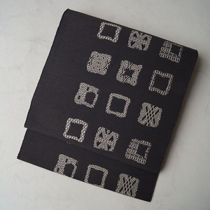 【なごや帯】墨黒地 四角に幾何学文 八寸かがり なごや帯