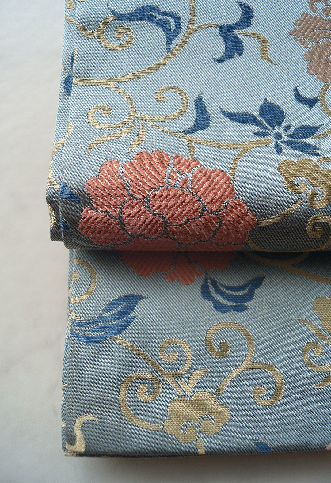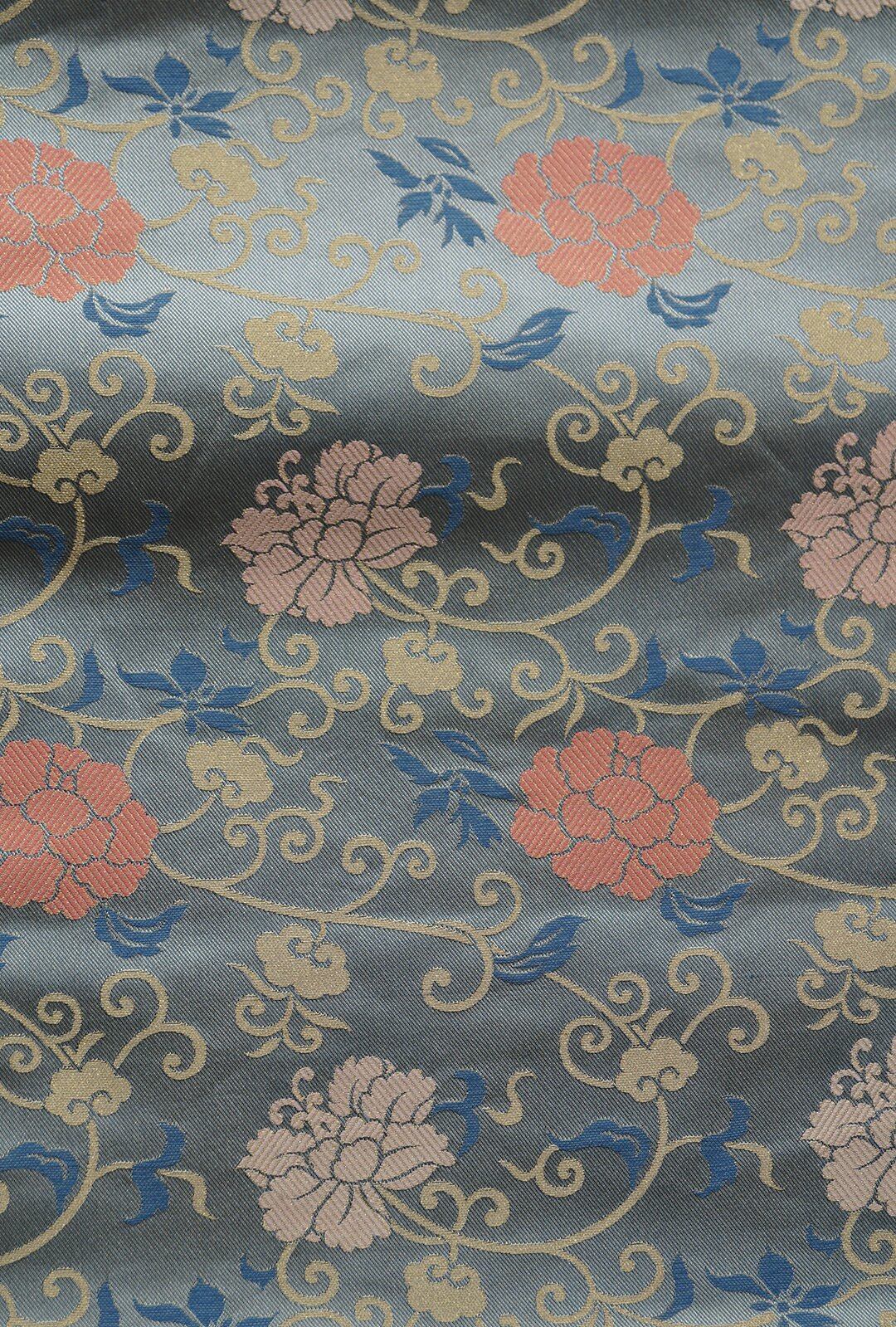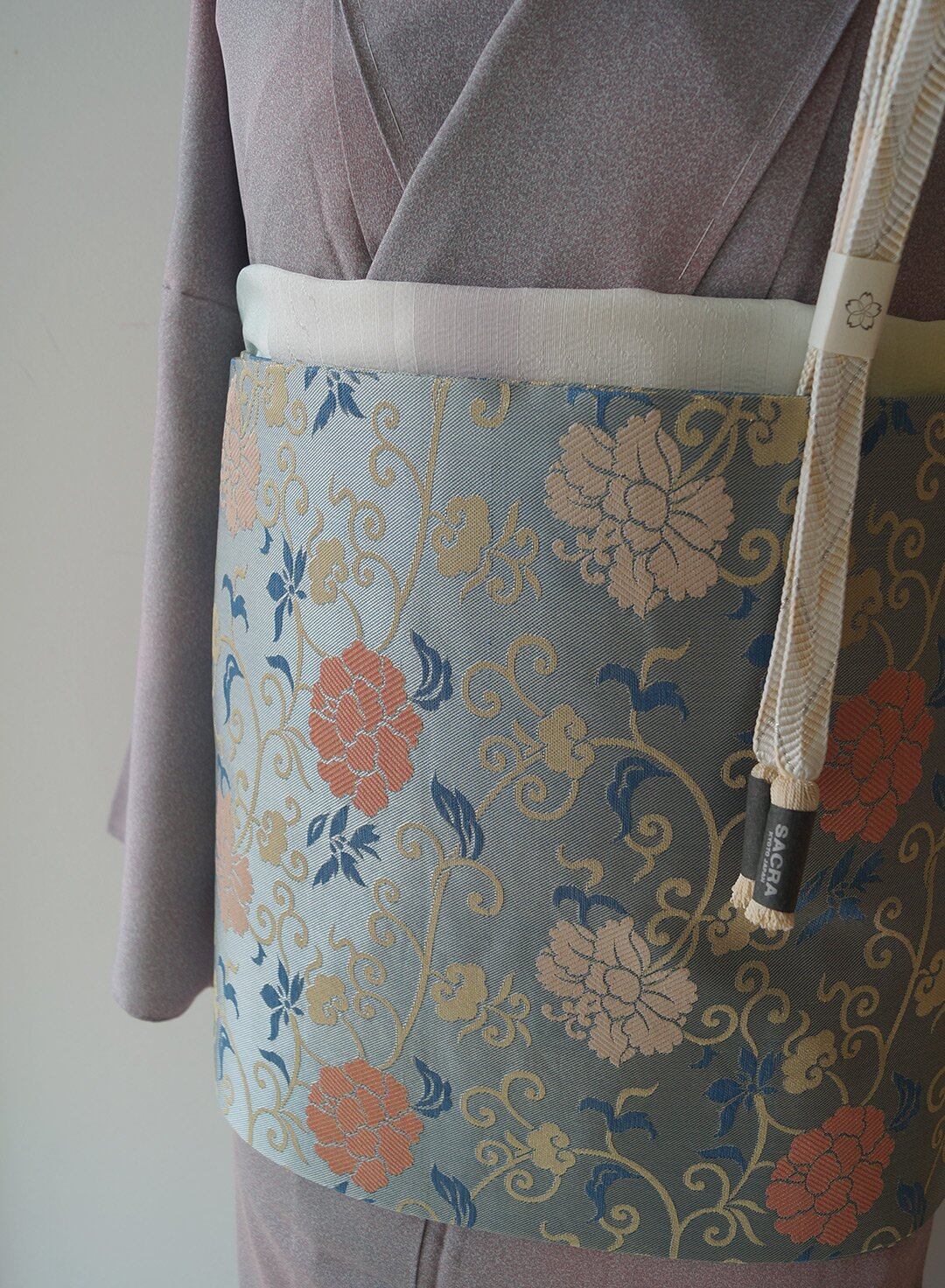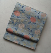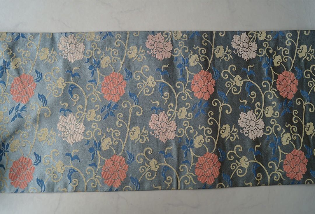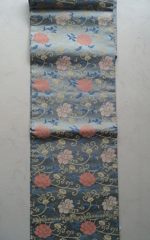 【なごや帯】青磁鼠色 牡丹唐草文 開きなごや帯