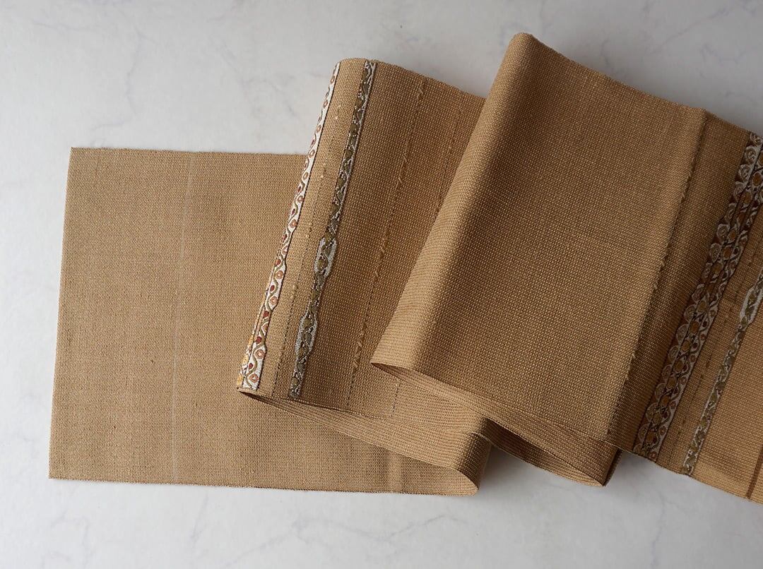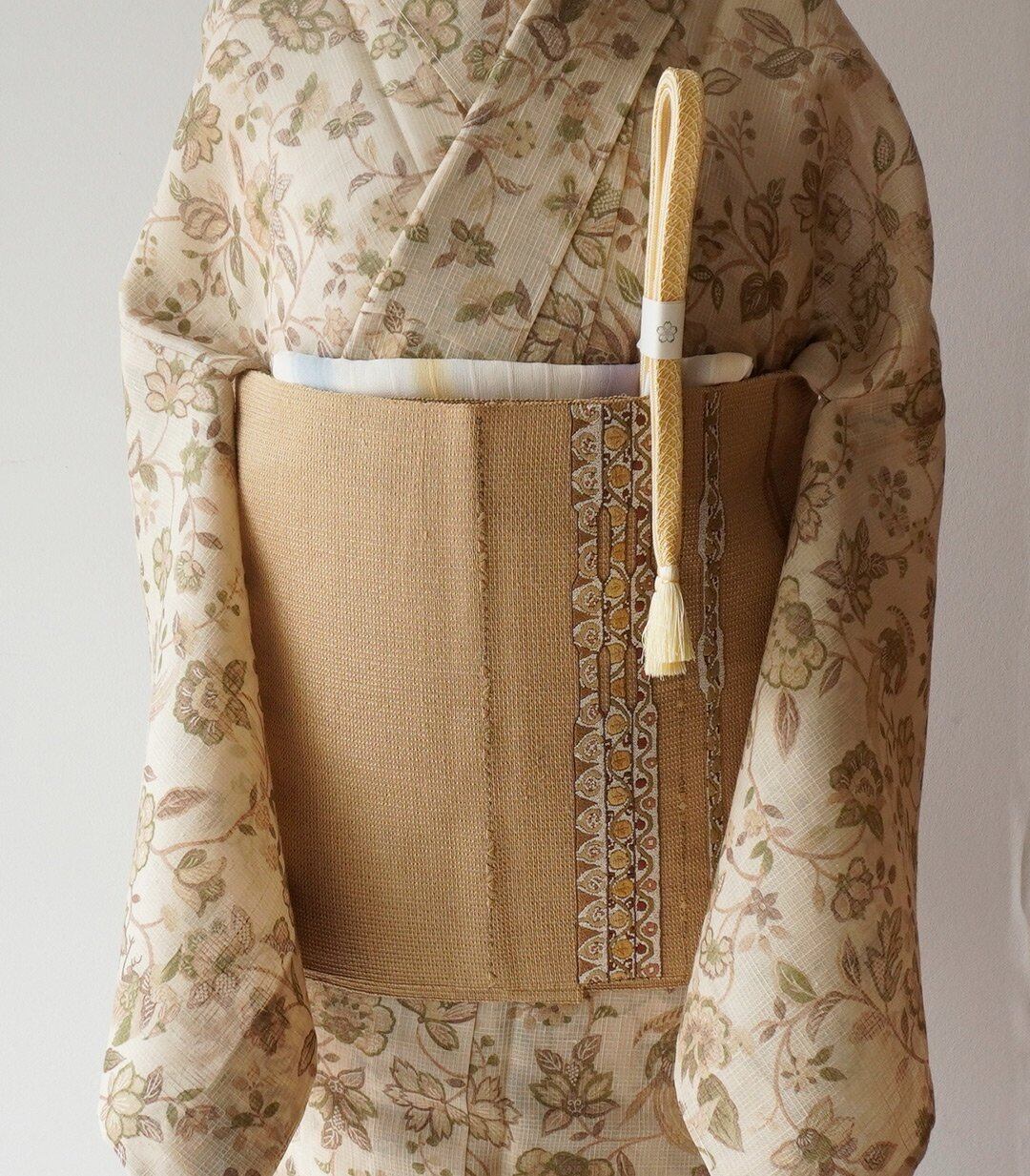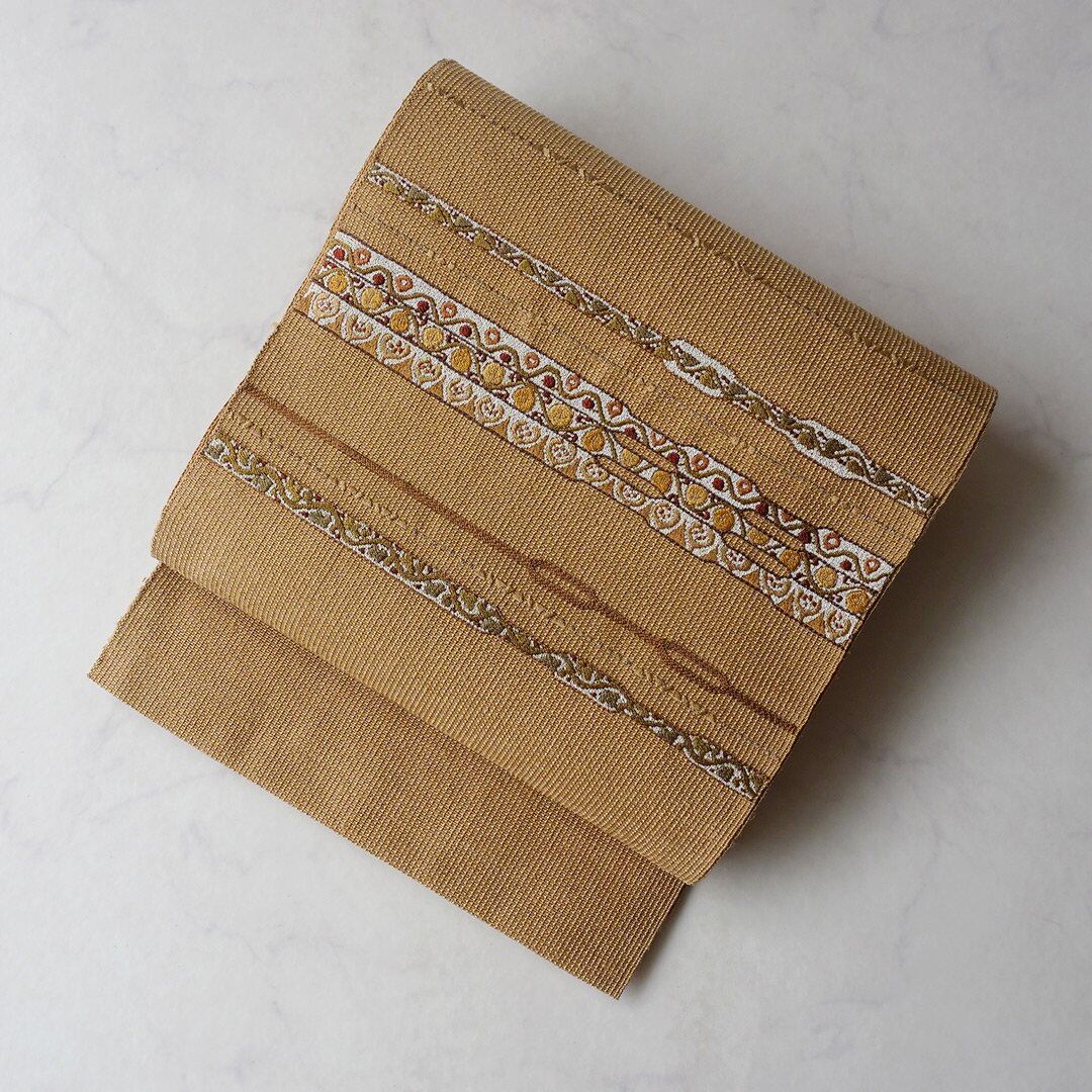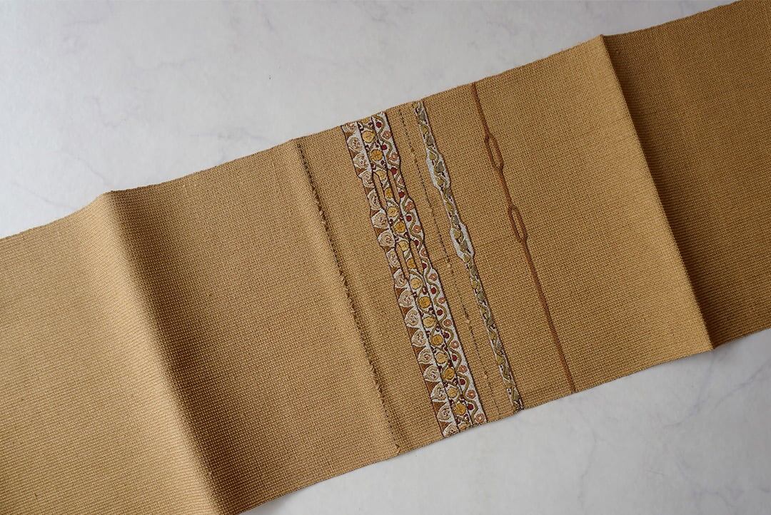 【夏なごや帯】黄唐茶地 刺繍横縞文 八寸なごや帯