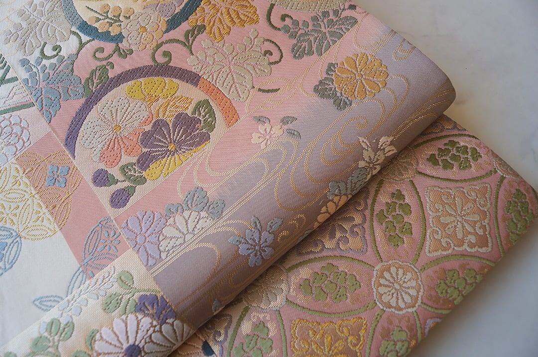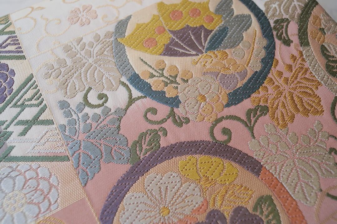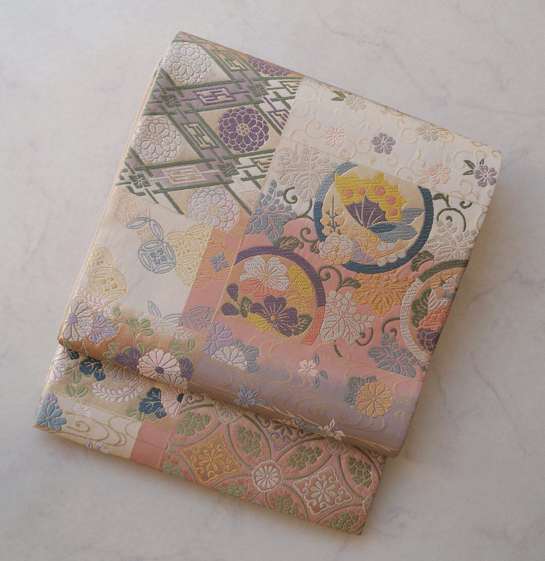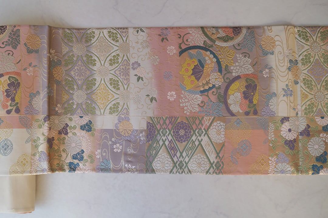 【ふくろ帯】パステル調 吉祥文様ブロック分け 唐織りふくろ帯