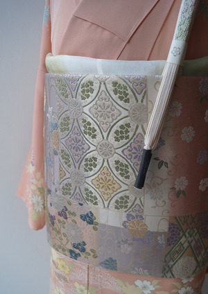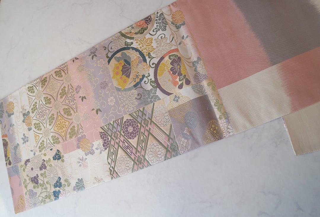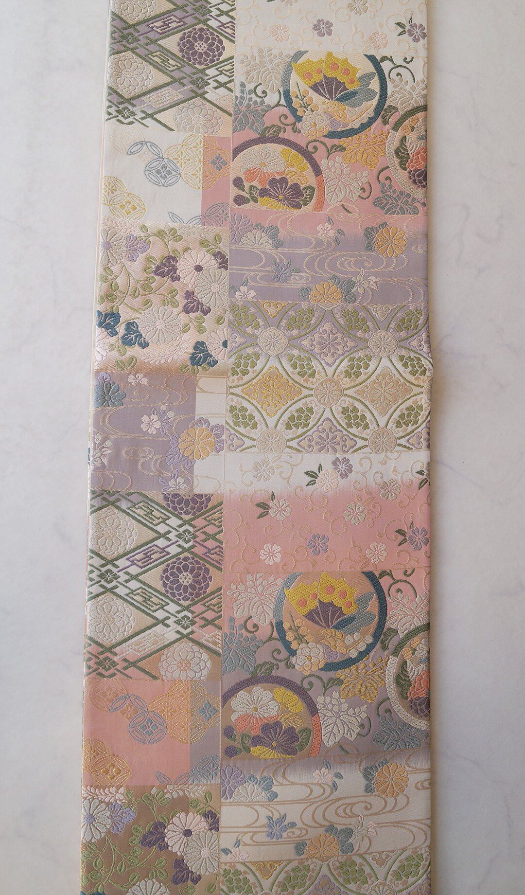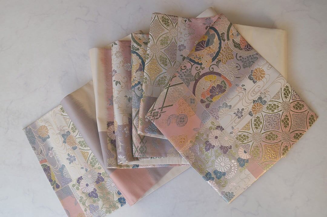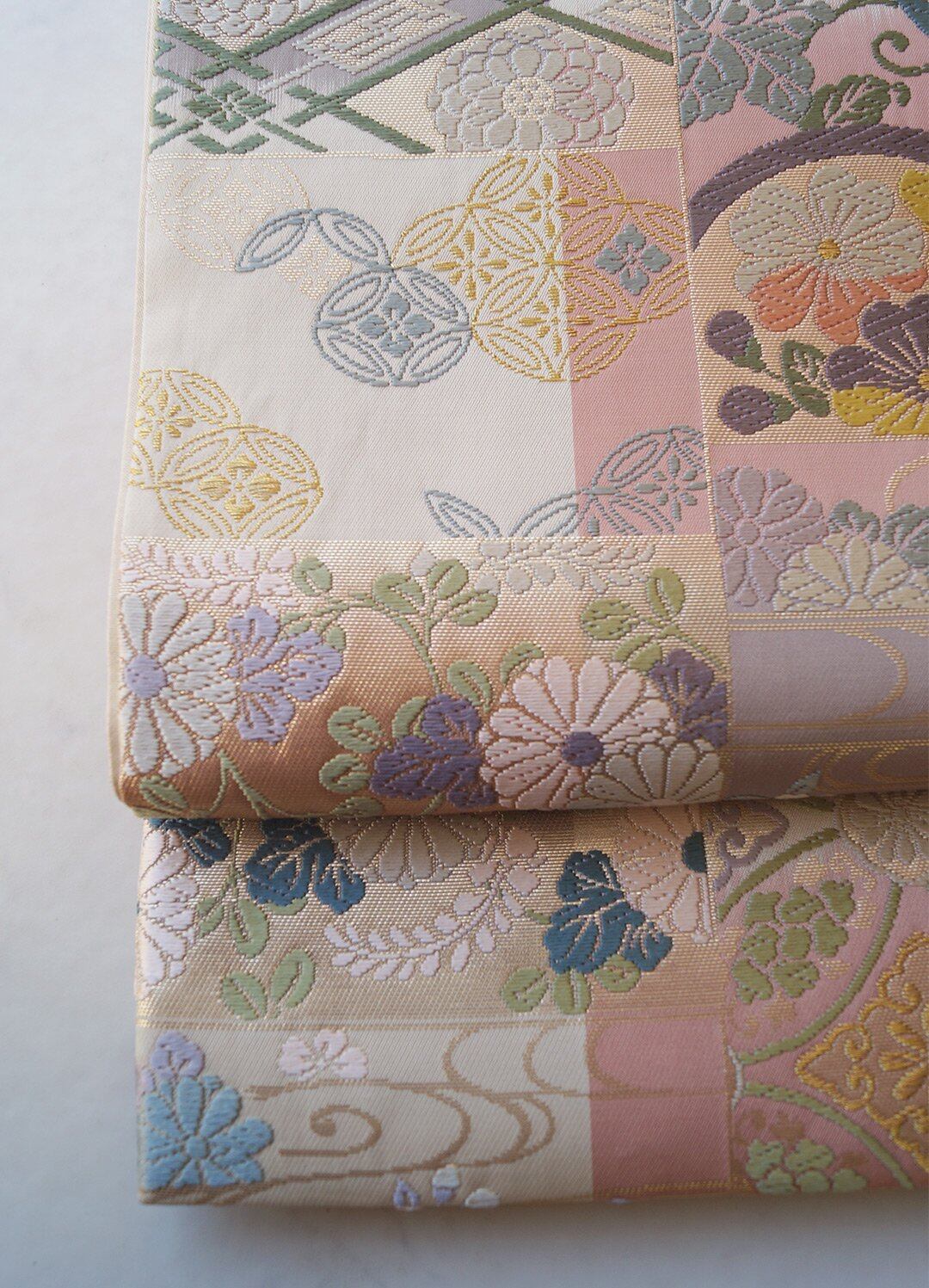 【ふくろ帯】パステル調 吉祥文様ブロック分け 唐織りふくろ帯