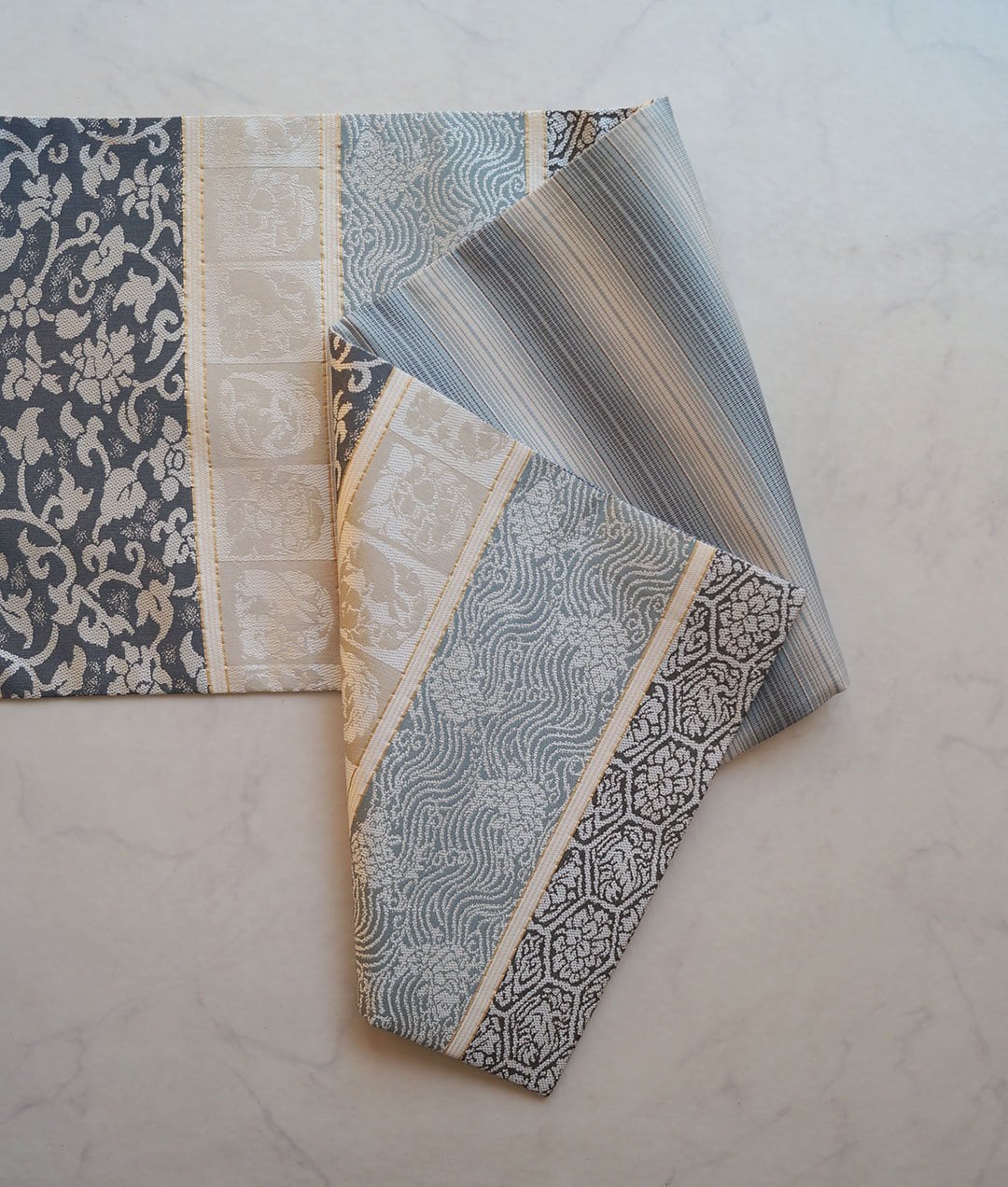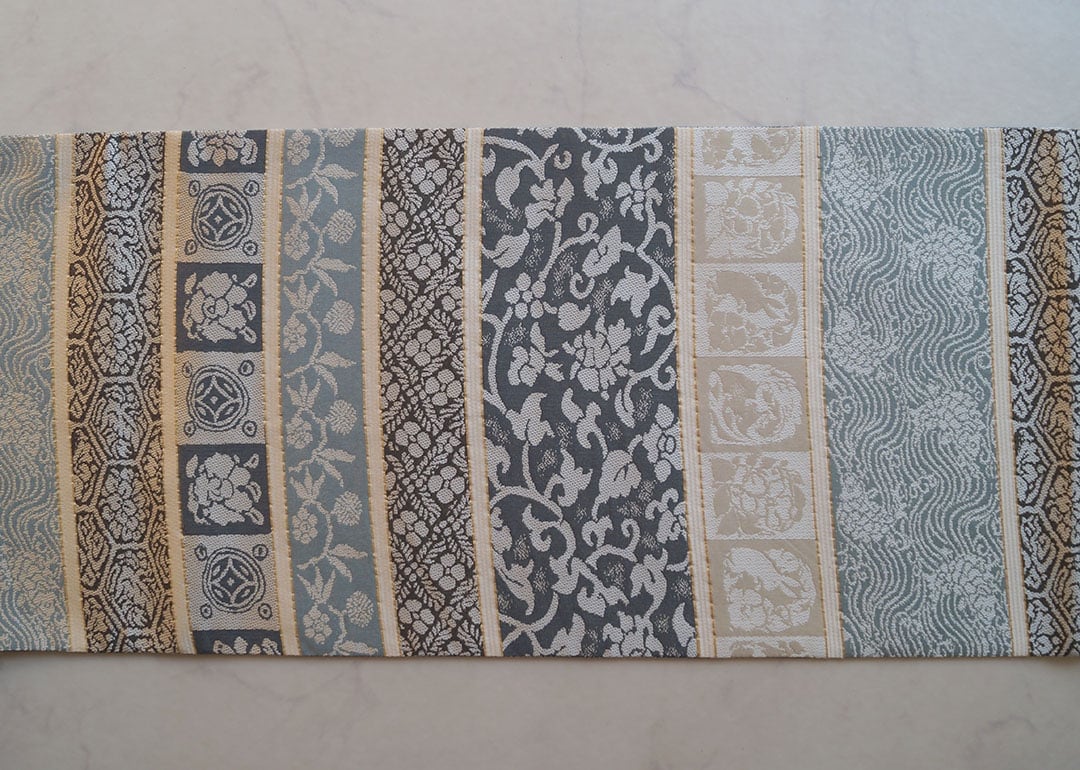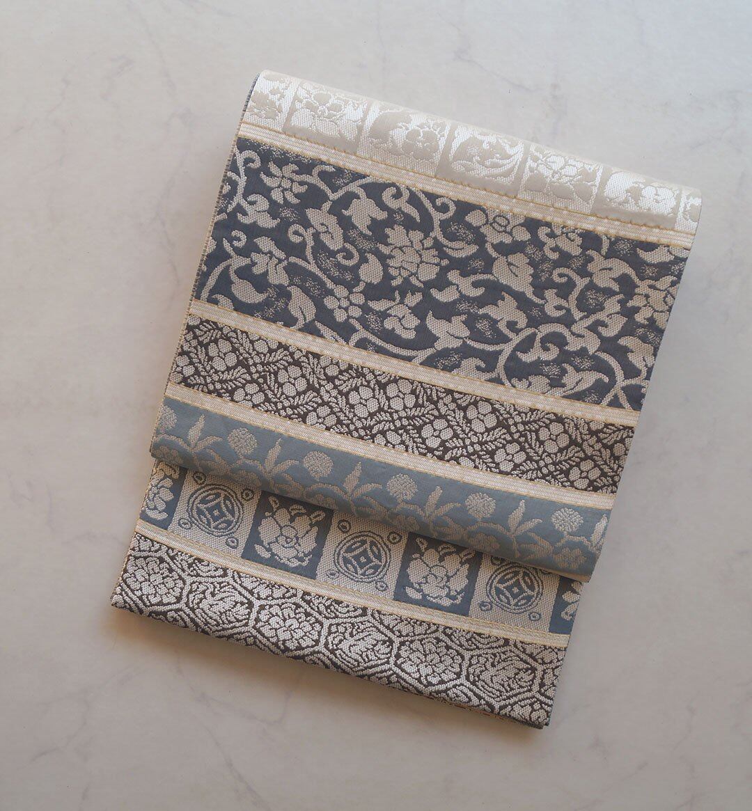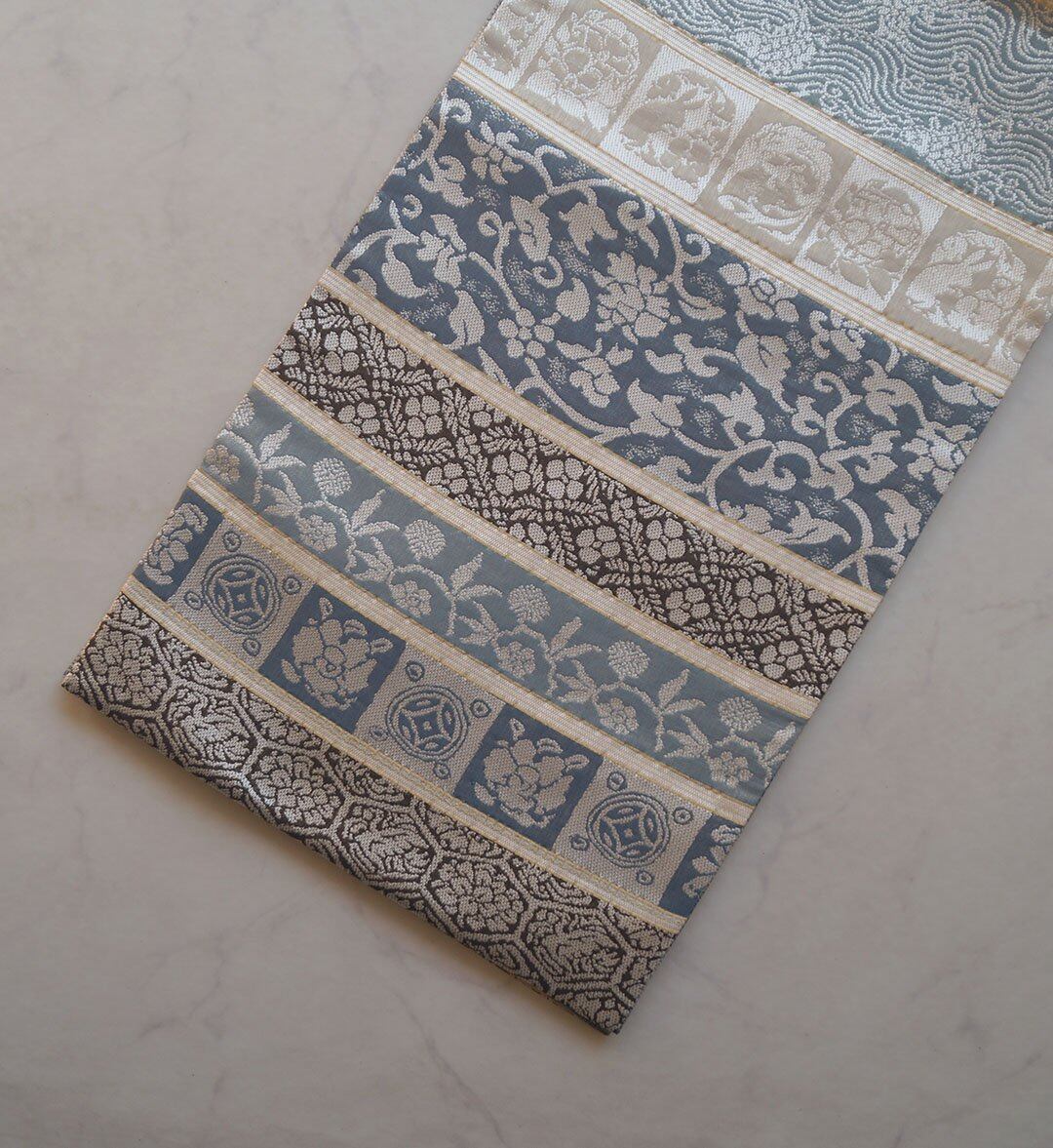 【ふくろ帯】ブルーグレー系 名物裂横段文 ふくろ帯