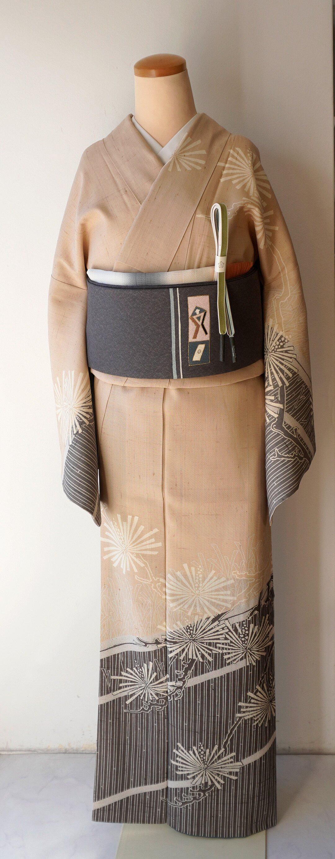 【袷】鈴乃屋扱い 生成り色地 竹垣文に松文 紬訪問着