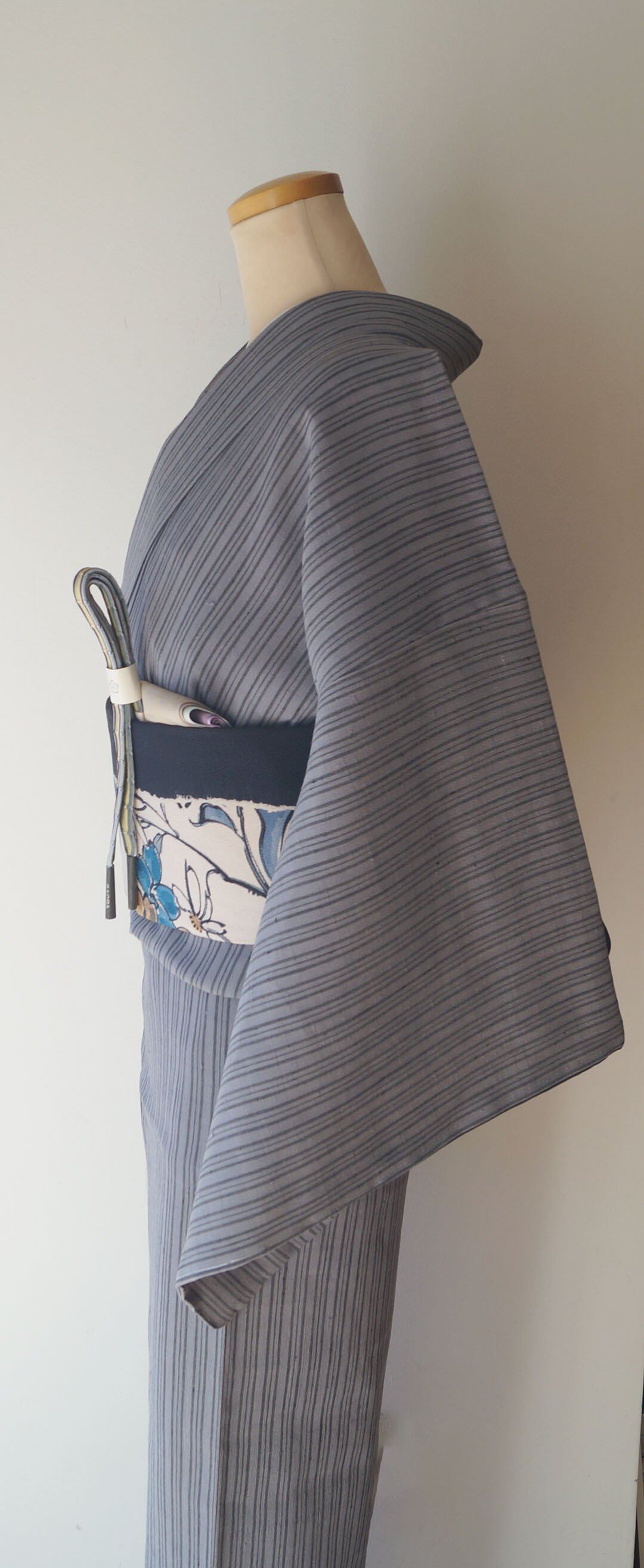 【袷】グレー系 縞文 紬