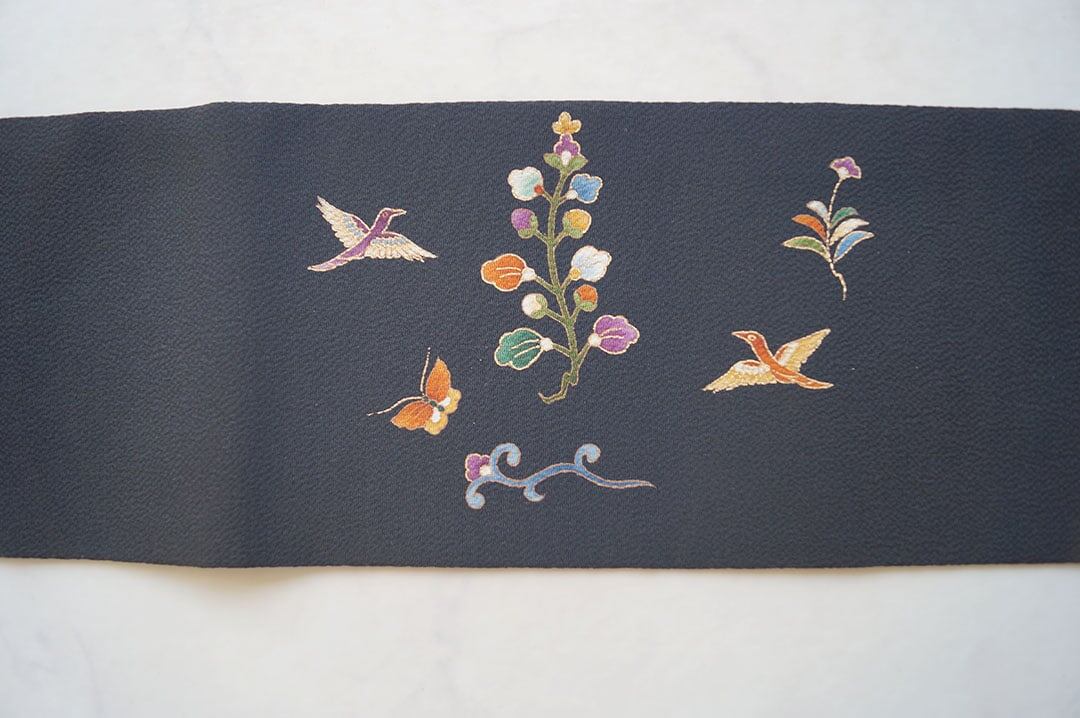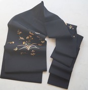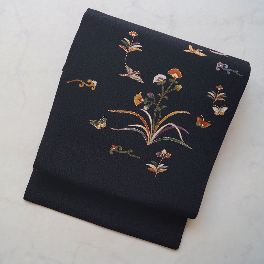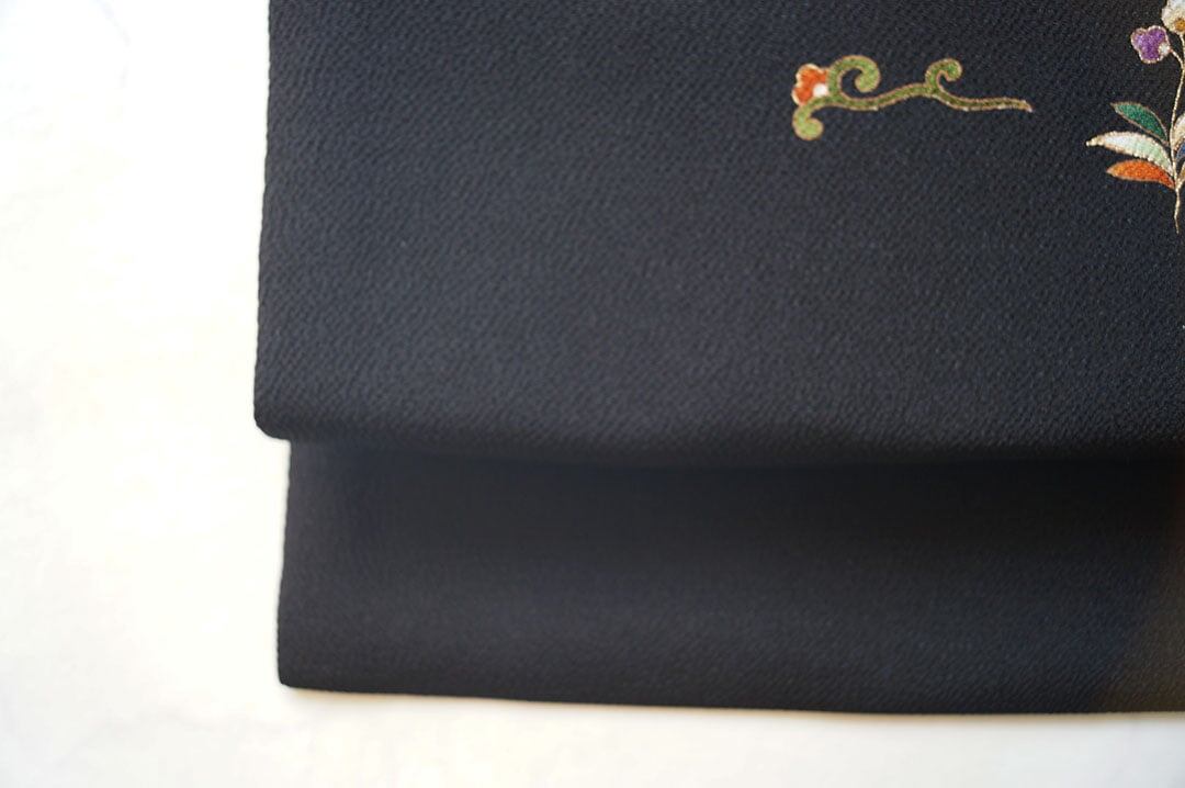 黒地の抽象花文の名古屋帯です。