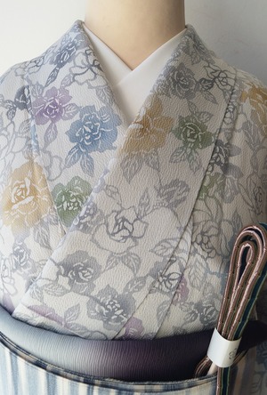 【袷】紫水晶色 薔薇柄 ちりめん小紋 ゆとりサイズ