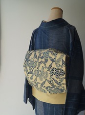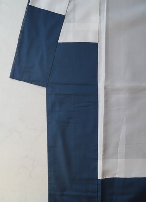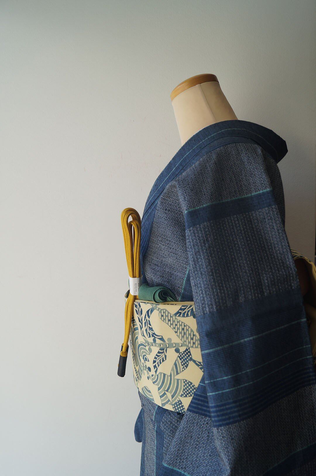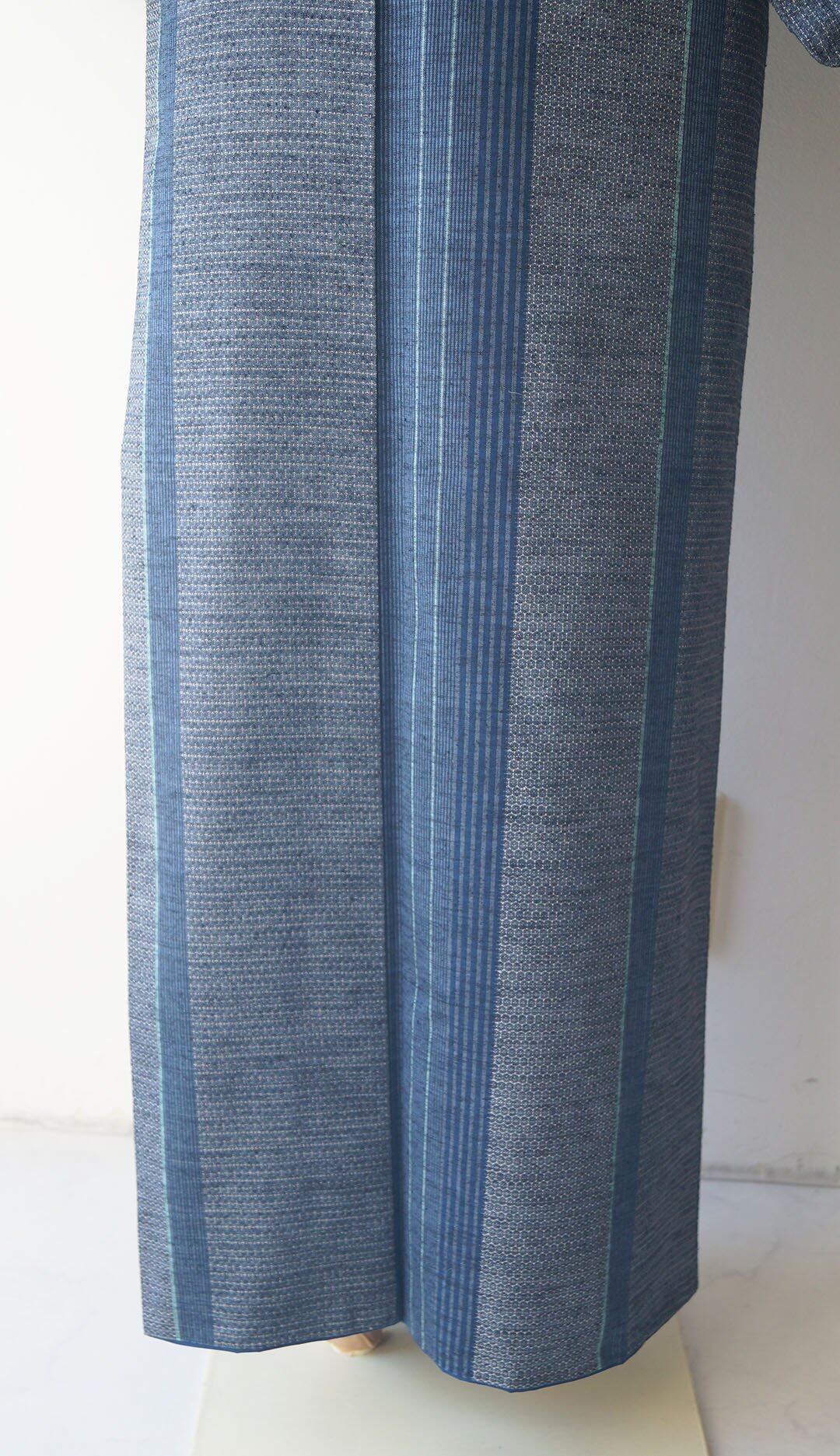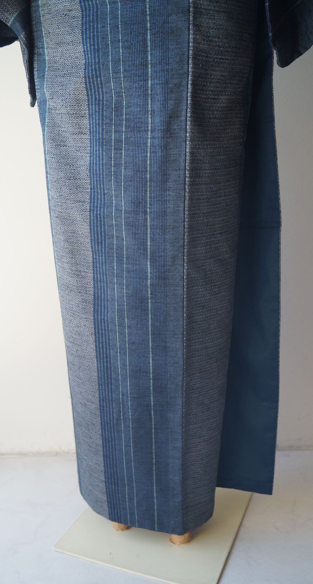 【袷】藍色系 縦縞に亀甲格子絣文 古紬結城