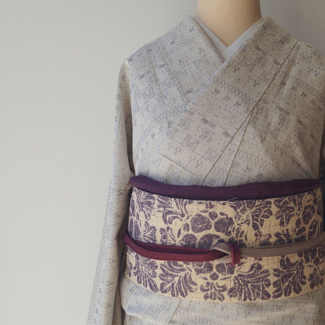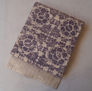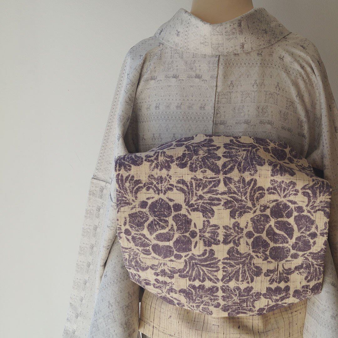 【なごや帯】生成りに滅紫色地 抽象草花文 紬地なごや帯