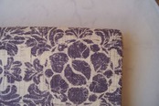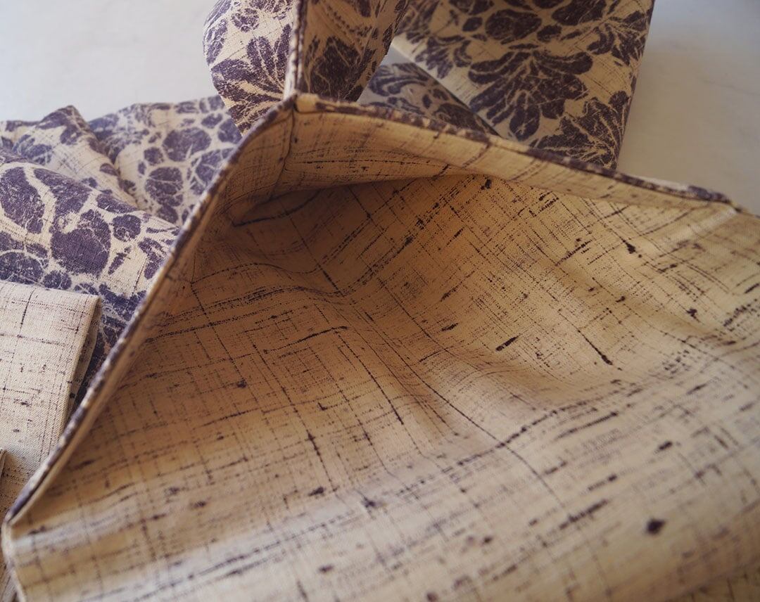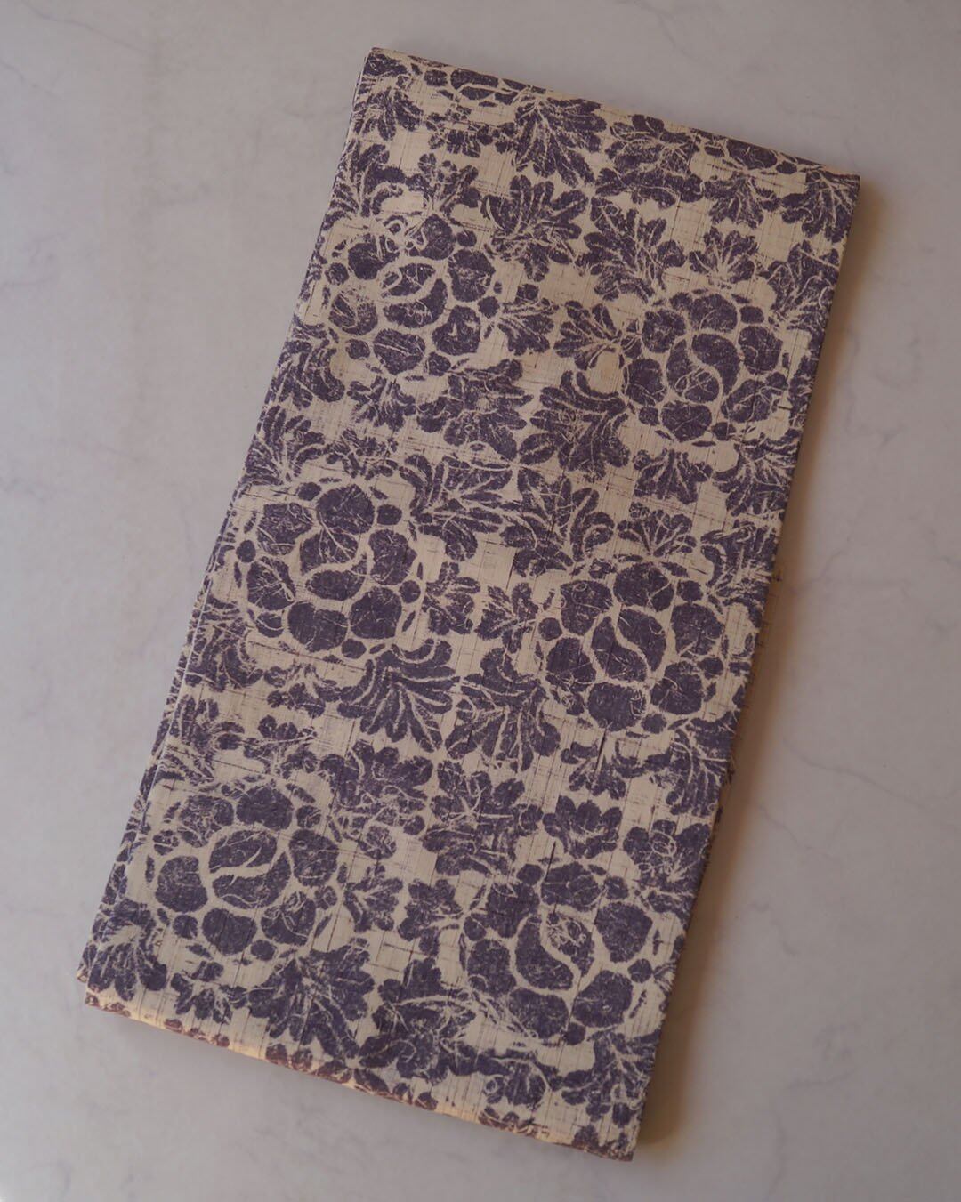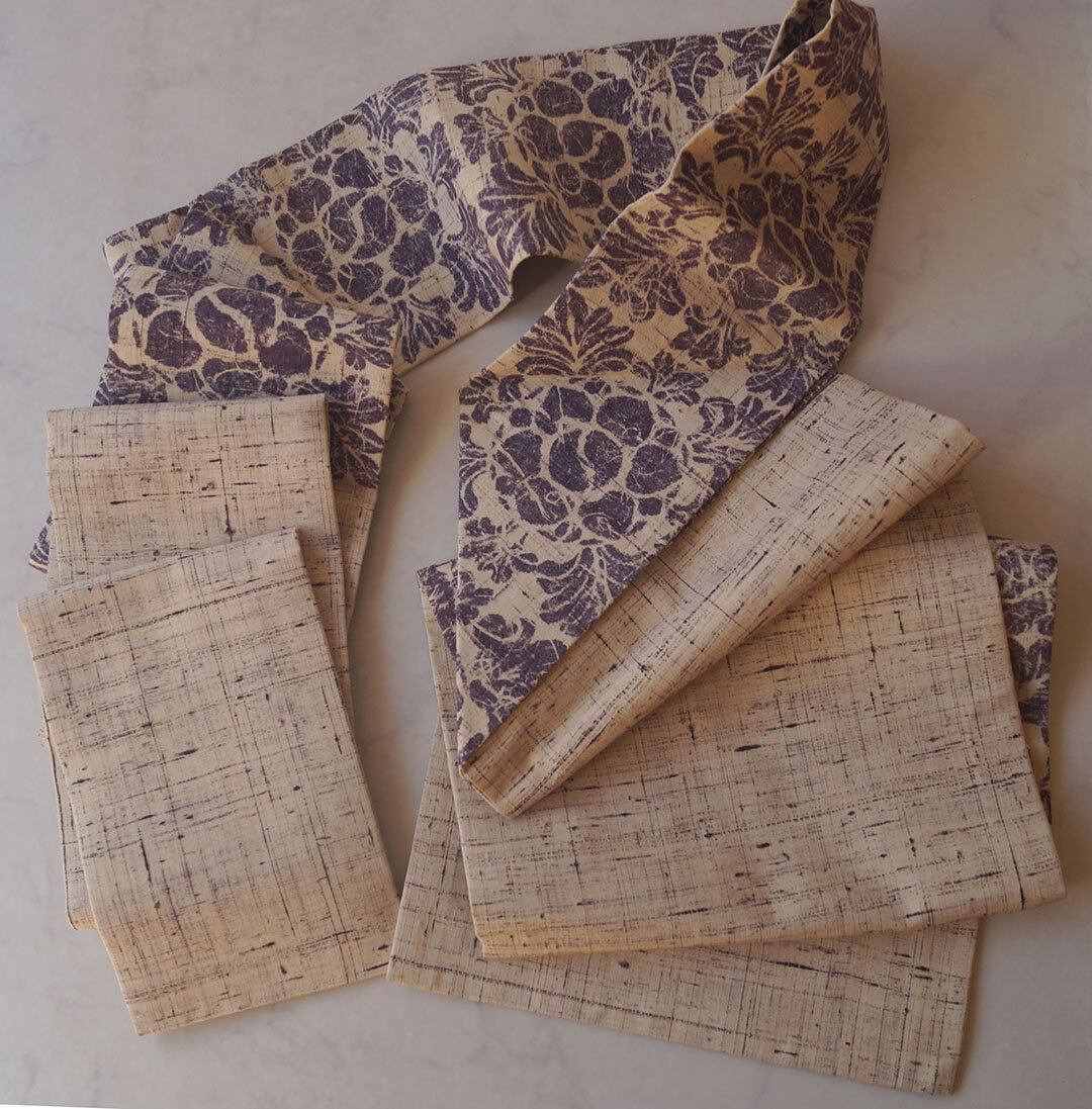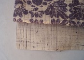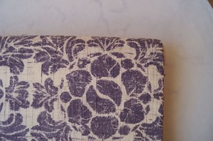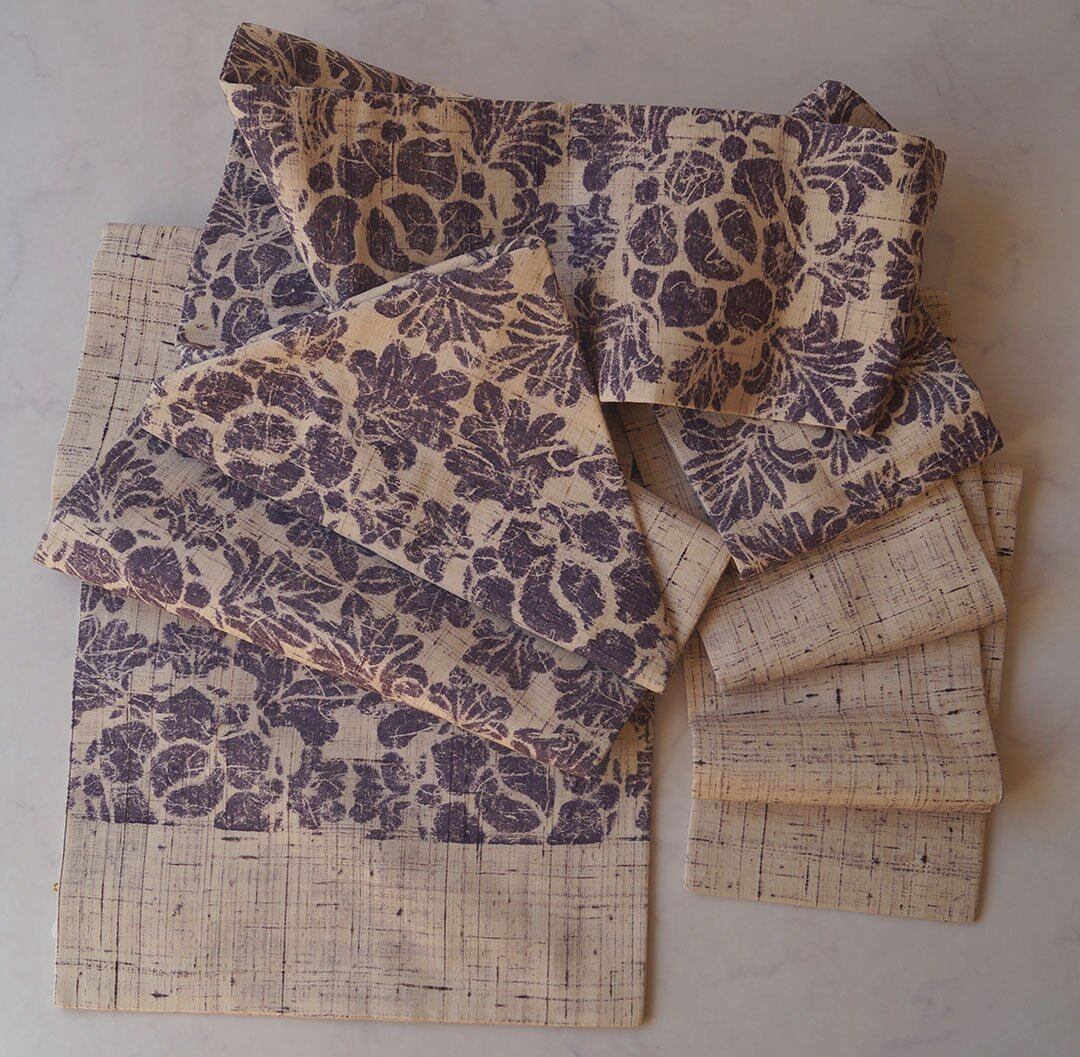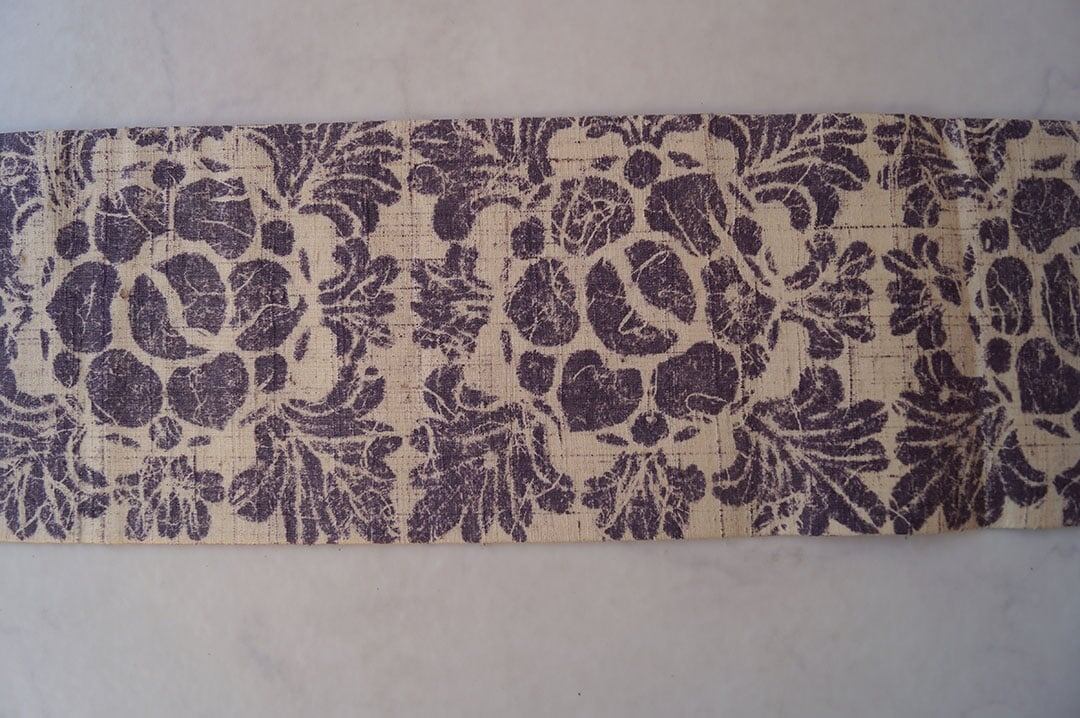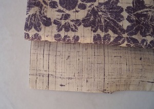 生成りに滅紫色地に抽象草花文の