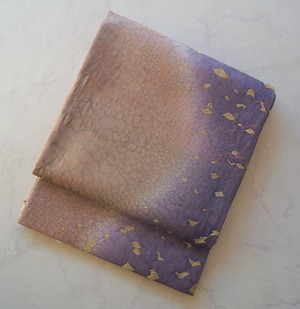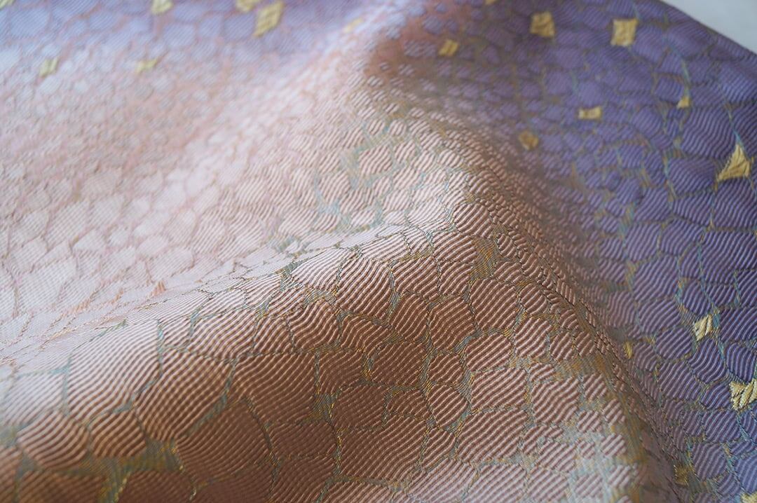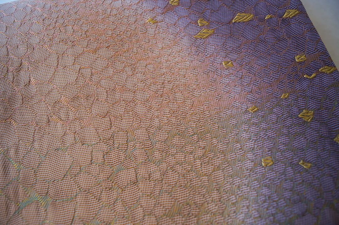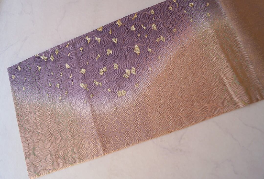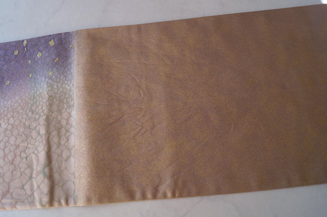 【ふくろ帯】西陣タケジ織物 薄柿色×葡萄色暈かし 氷割れ文 ふくろ帯