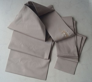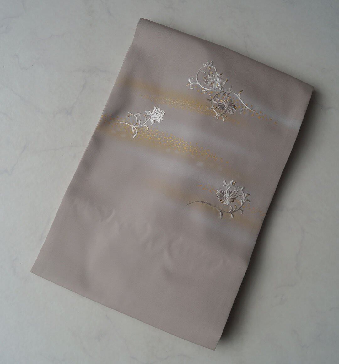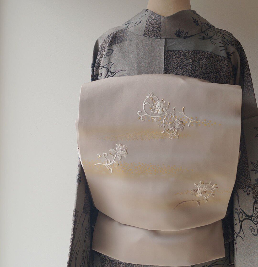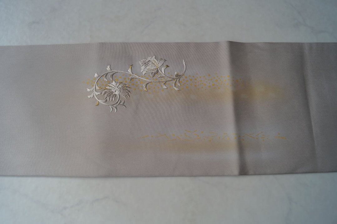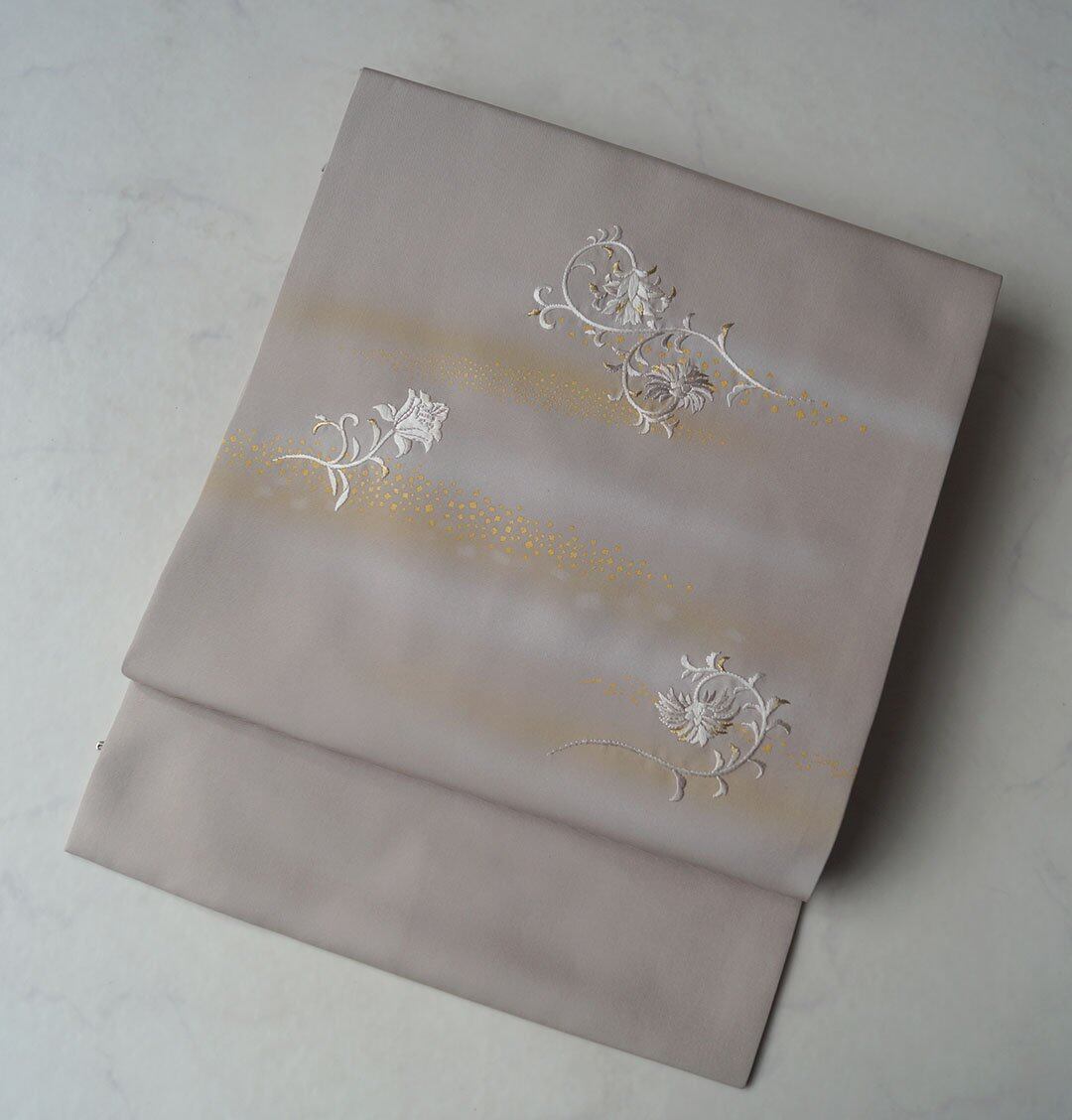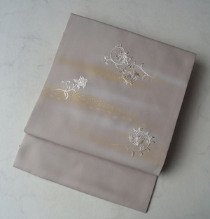 【なごや帯】霞色地 抽象花刺繍に箔散らし 塩瀬なごや帯
