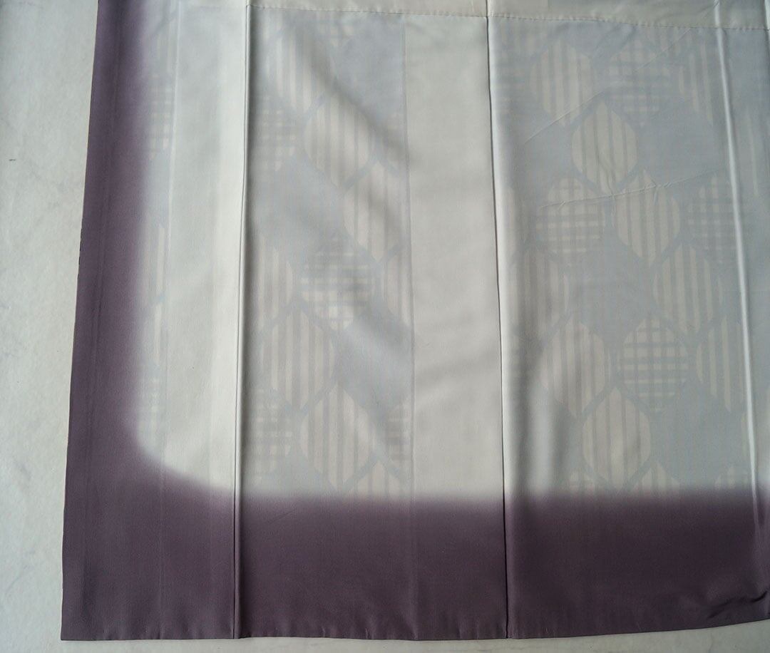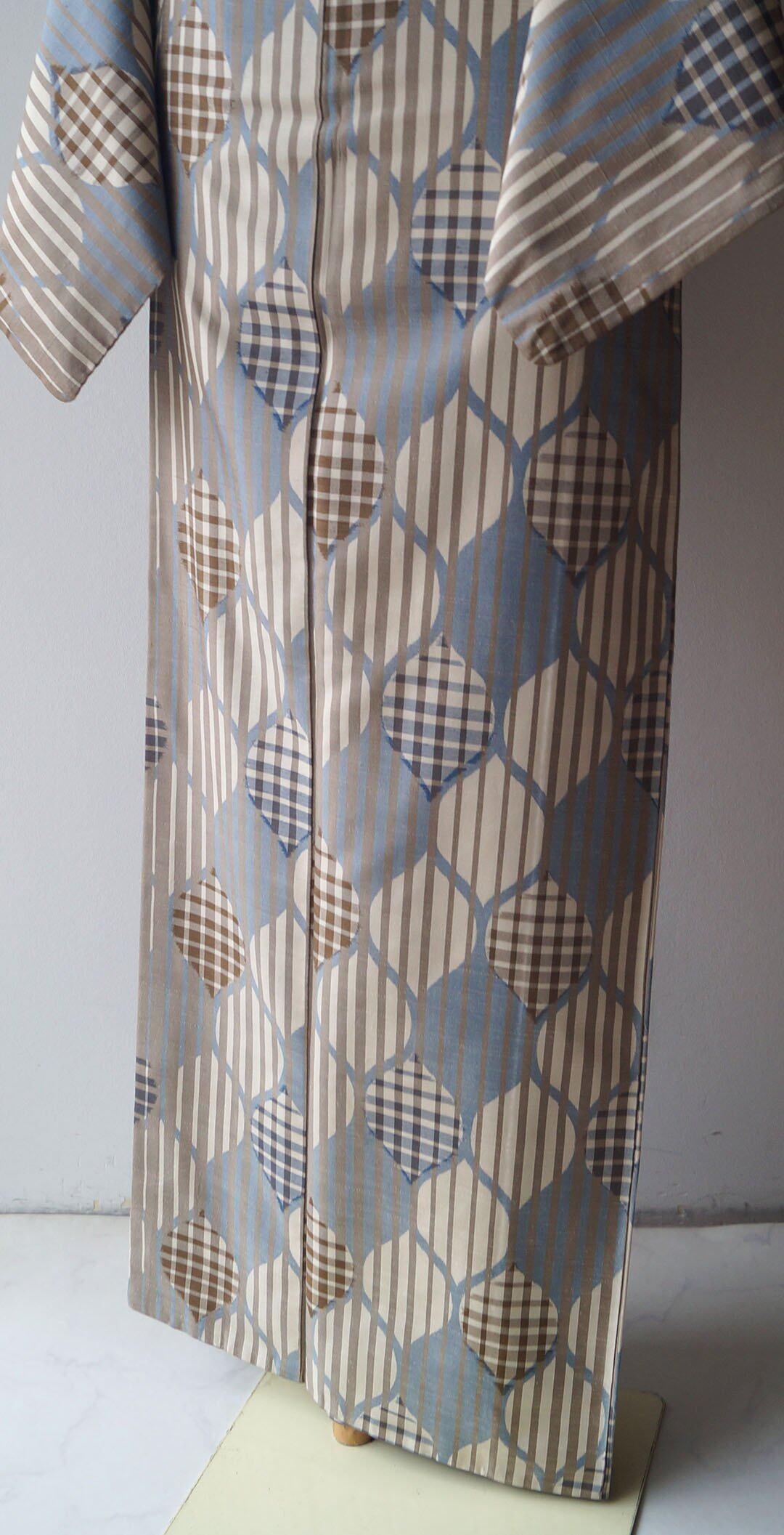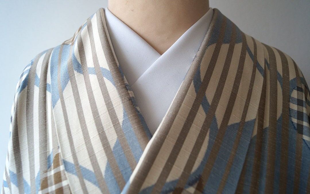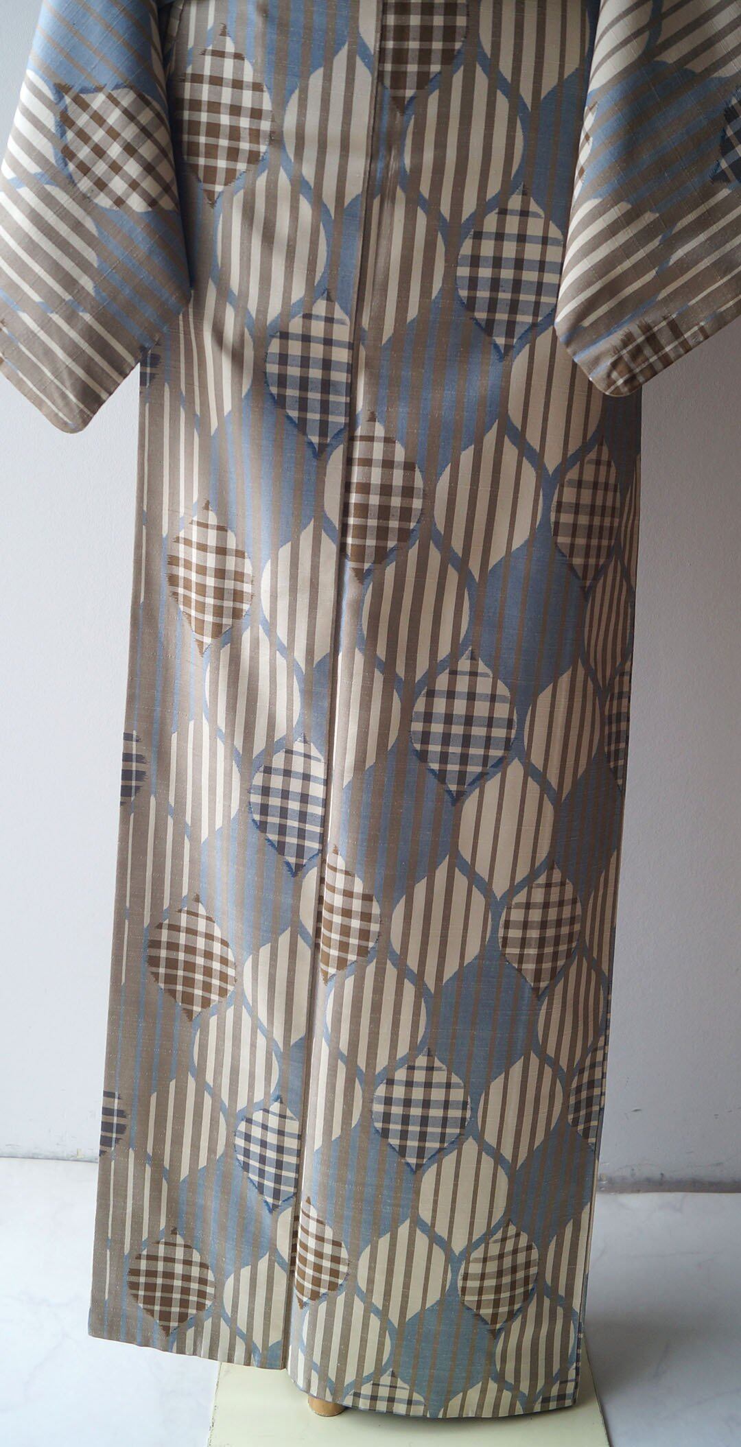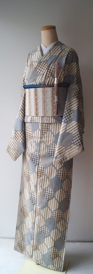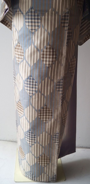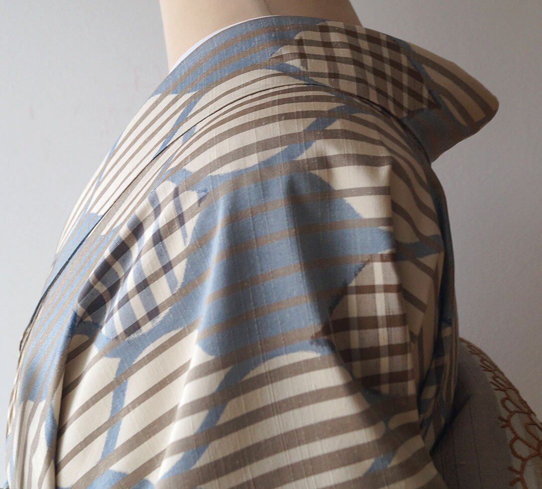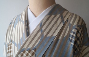 【袷】トールサイズ ベージュ系 縞に立涌柄 紬