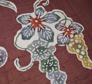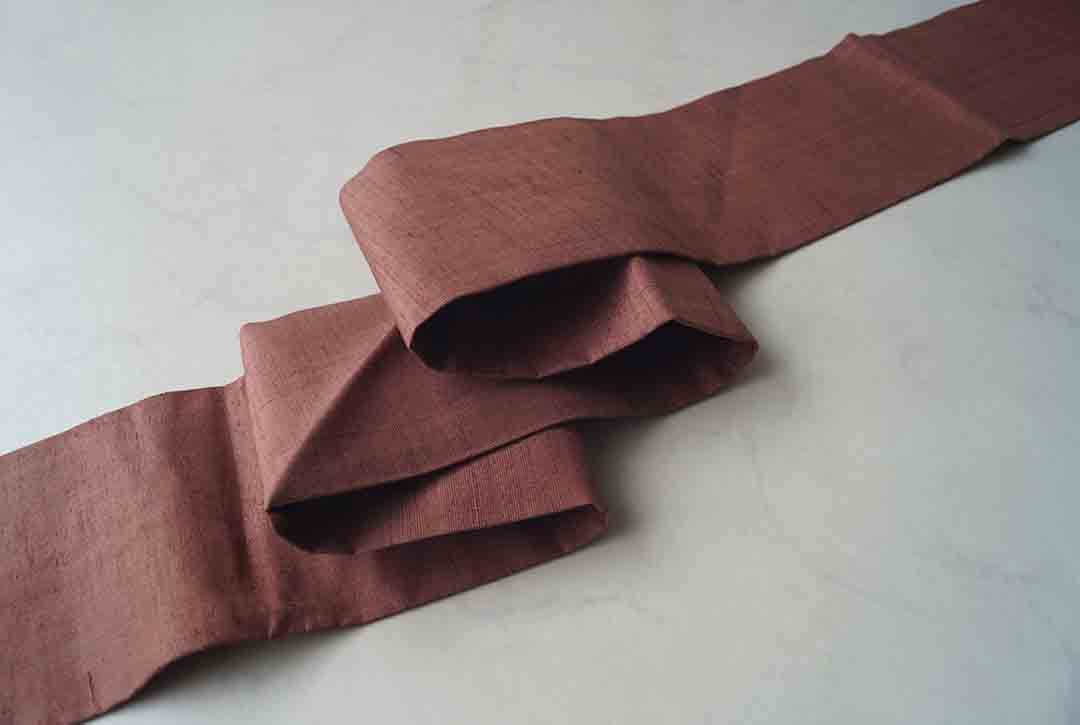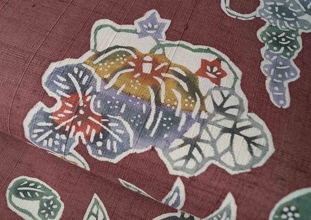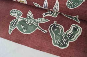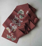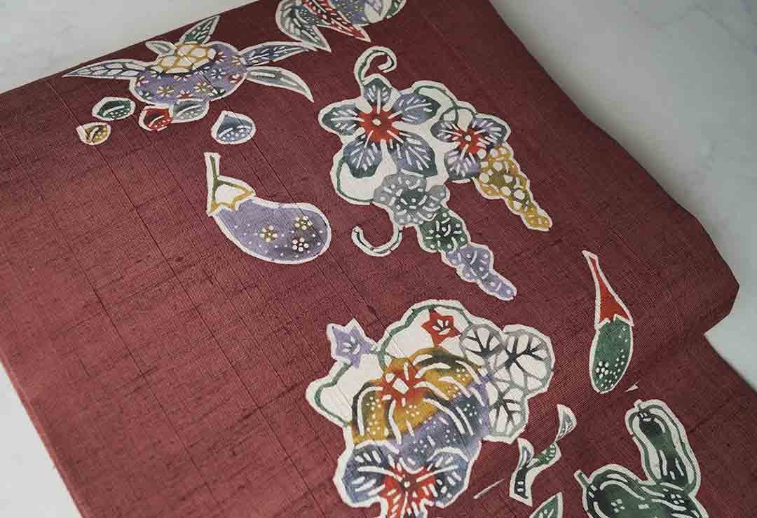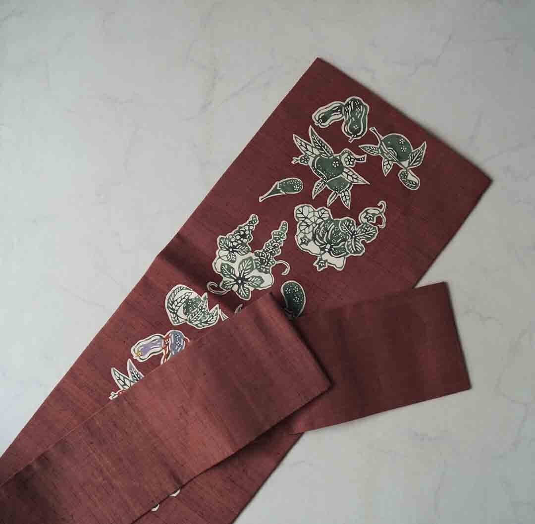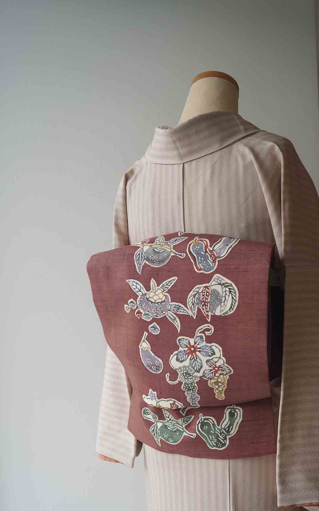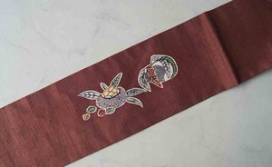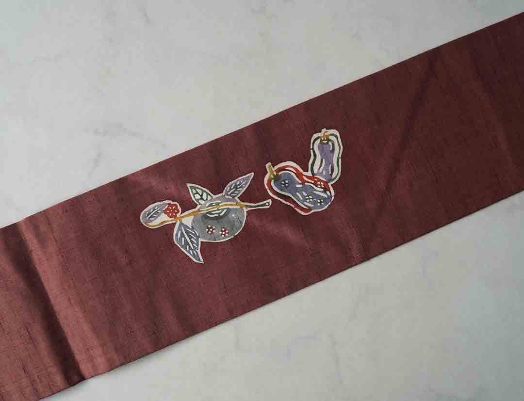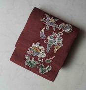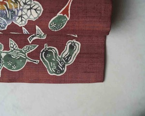 【なごや帯】赤茶色 秋の実り文 紬地なごや帯