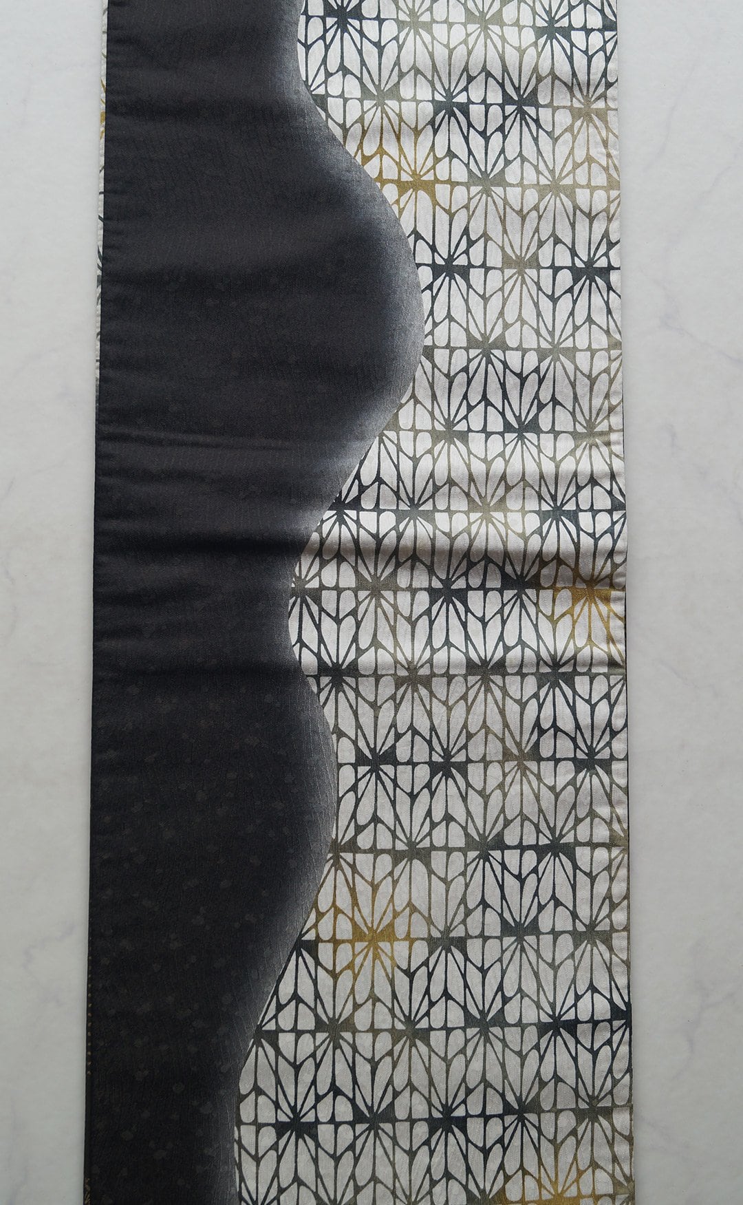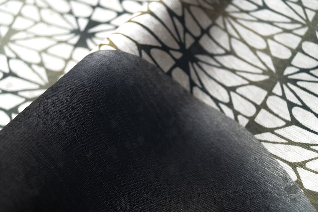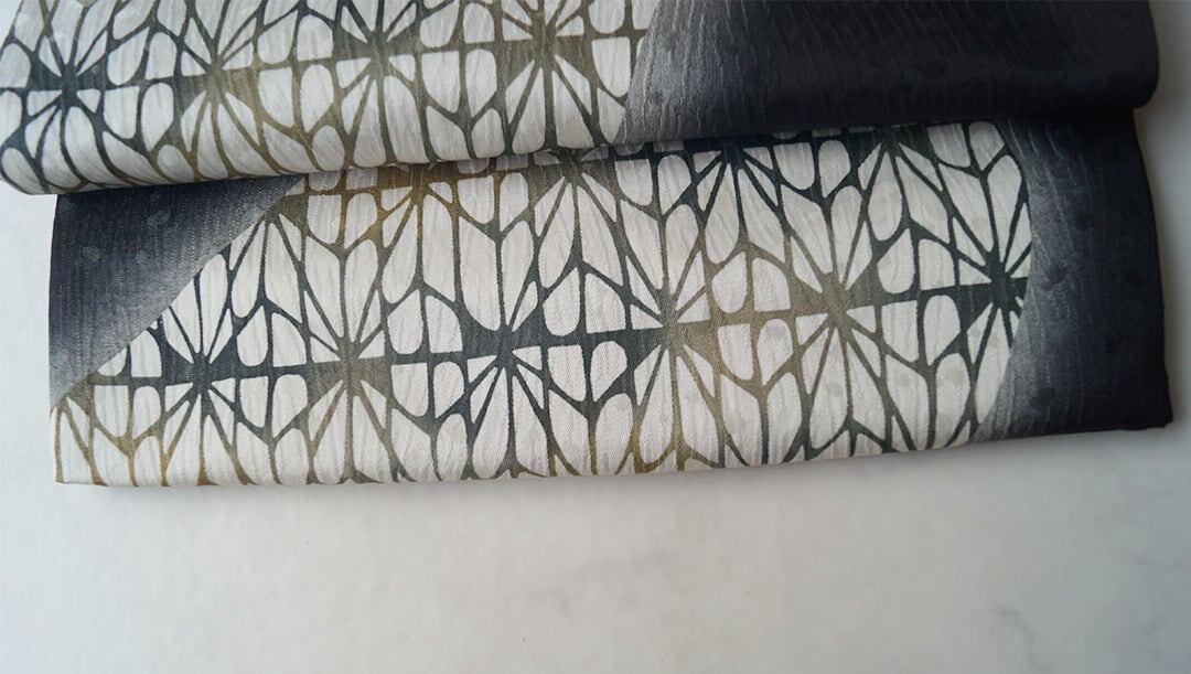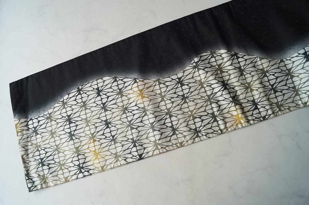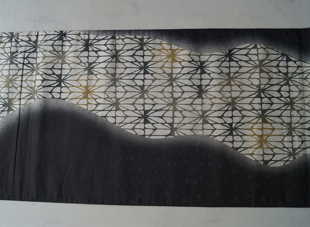 漆黒の暈かしと幾何学柄の染め分け、