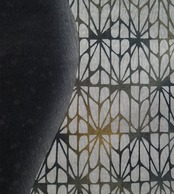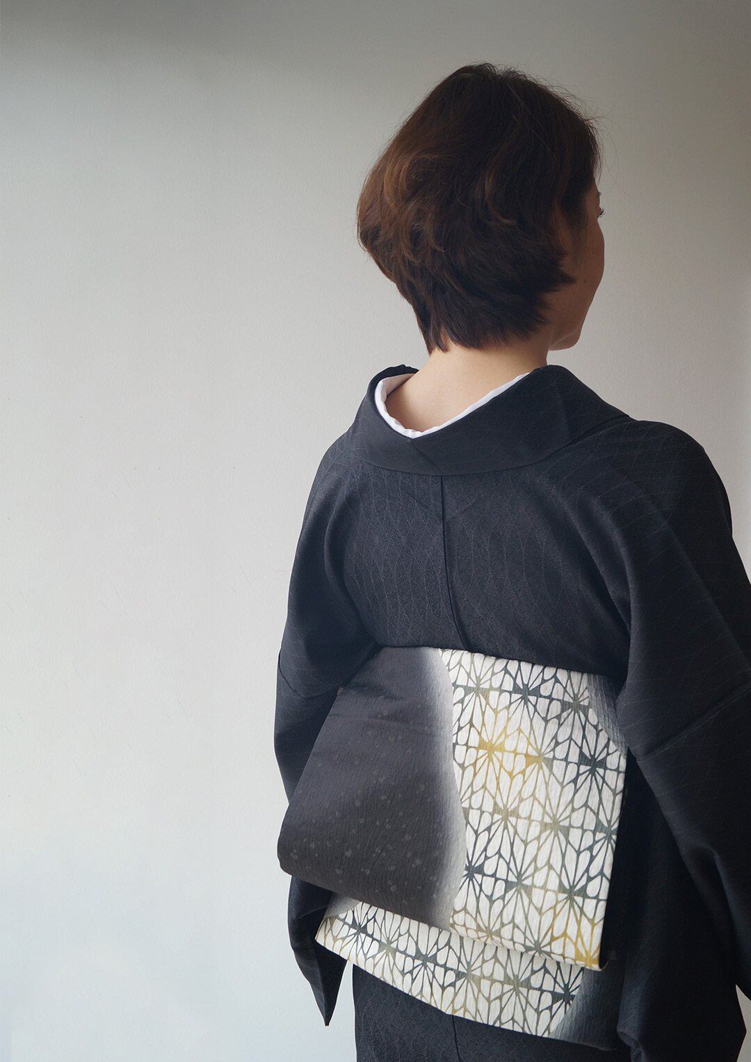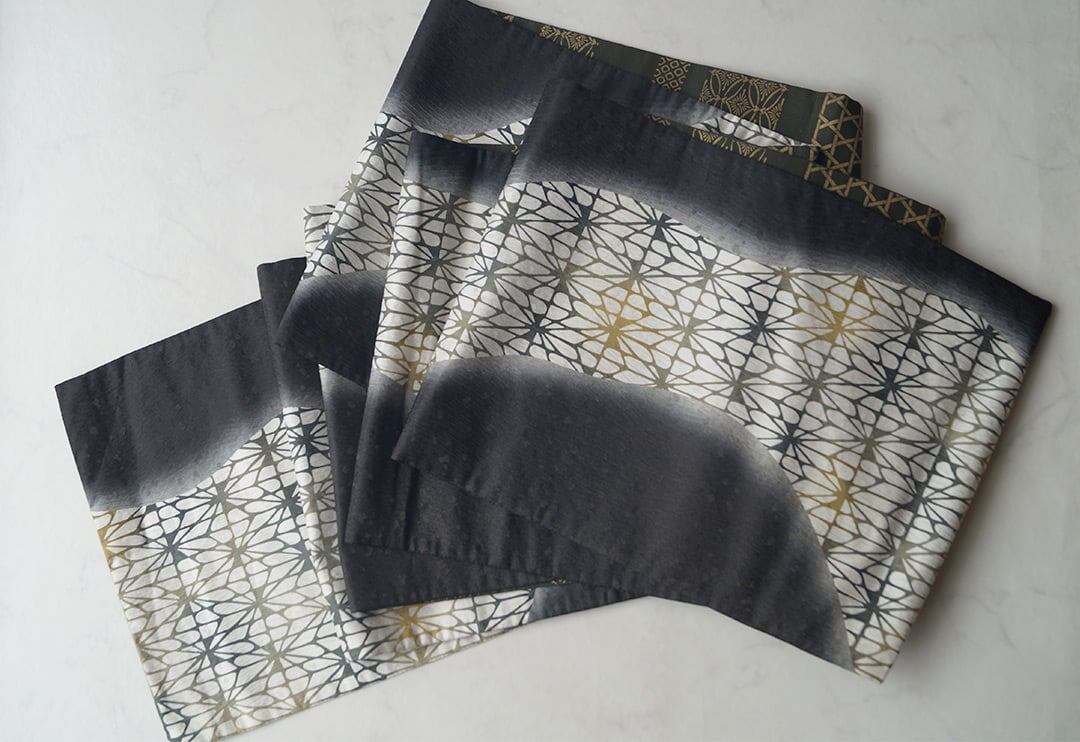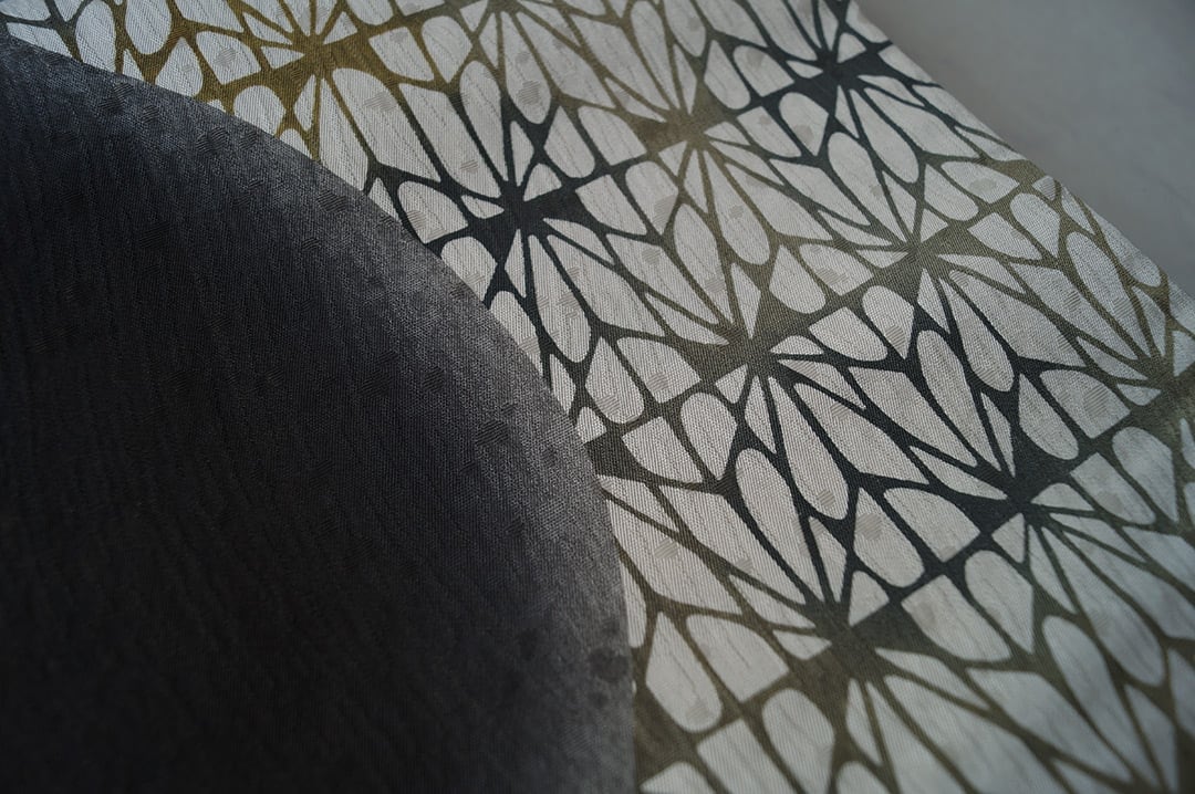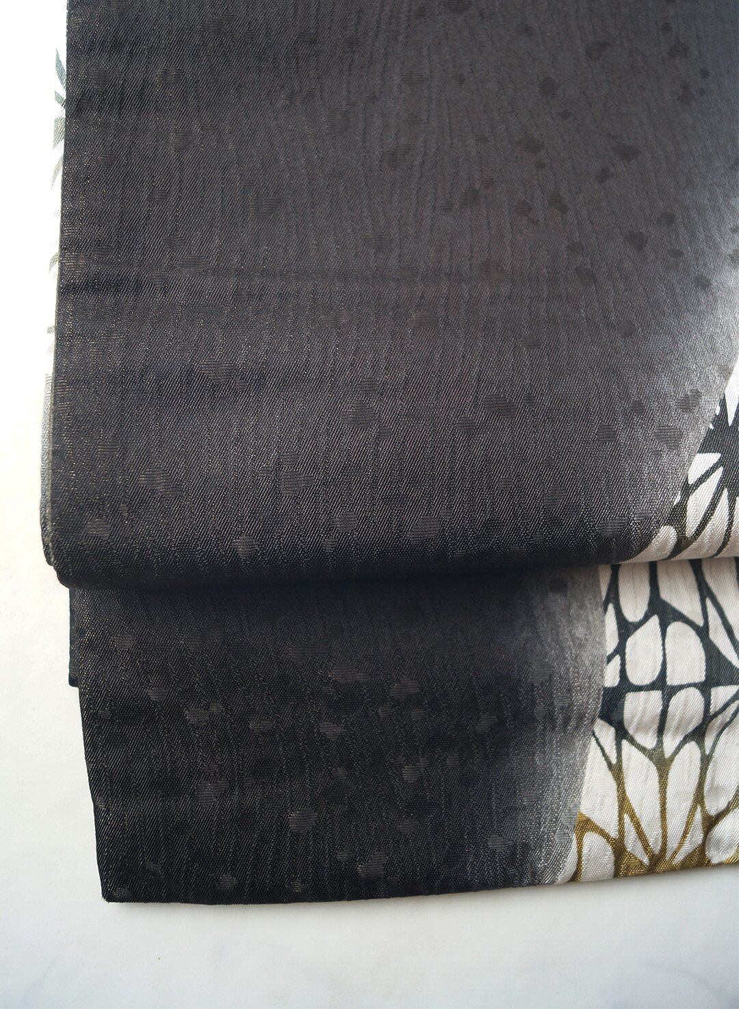 漆黒の暈かしと幾何学柄の染め分け、