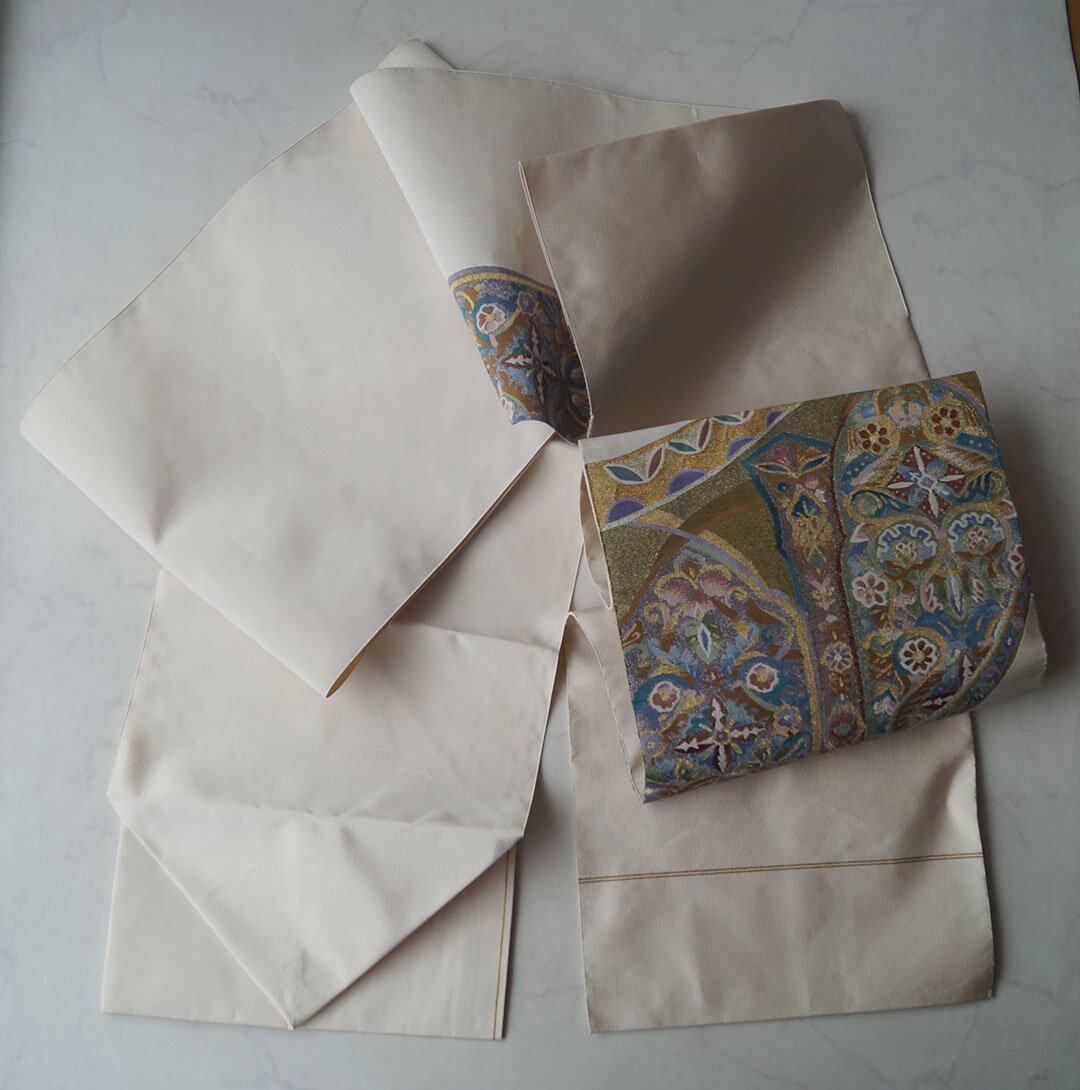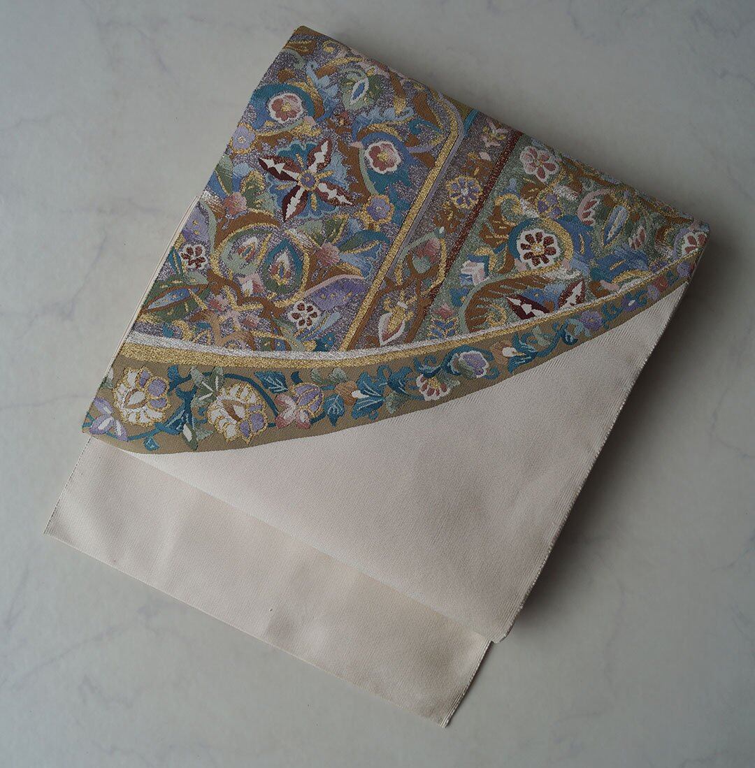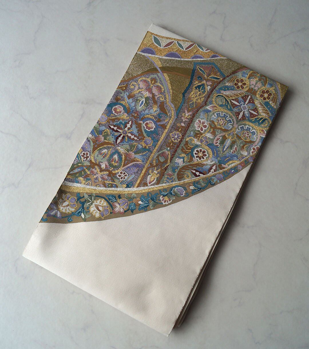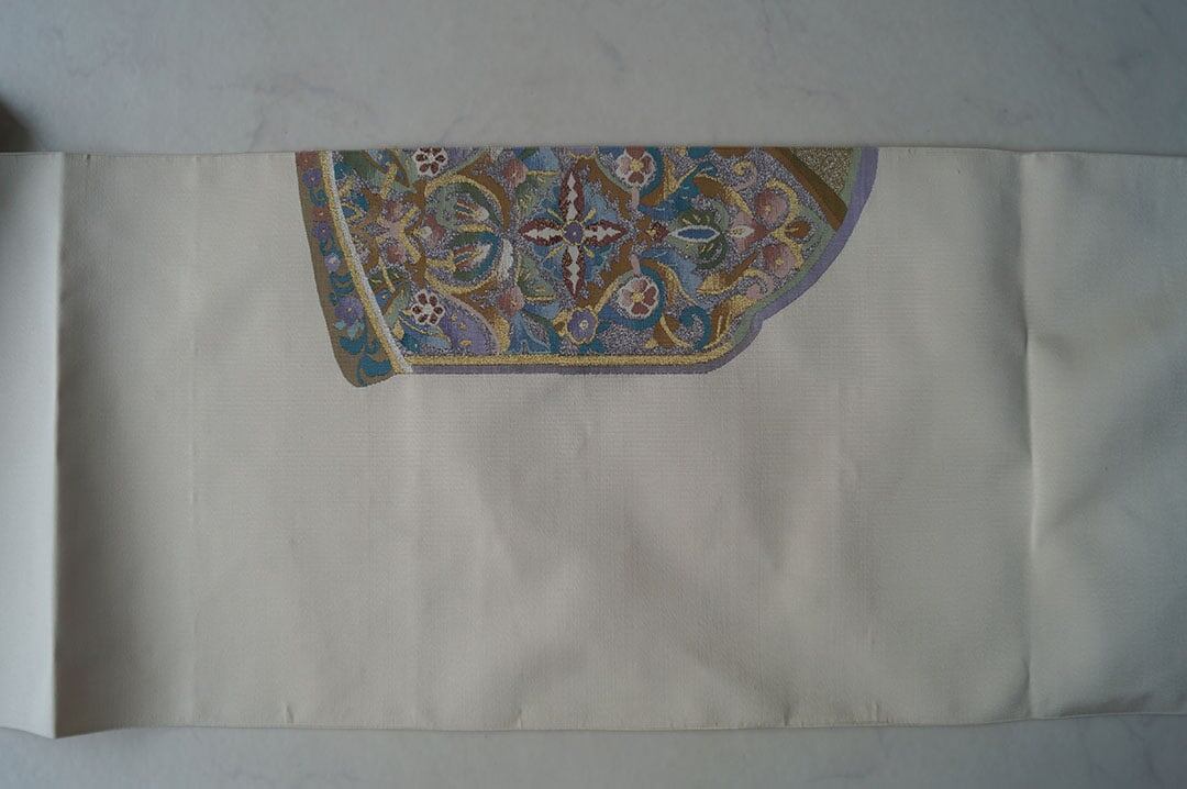 【なごや帯】西陣 浅田 爪綴れ 生成り地 抽象花文 なごや帯