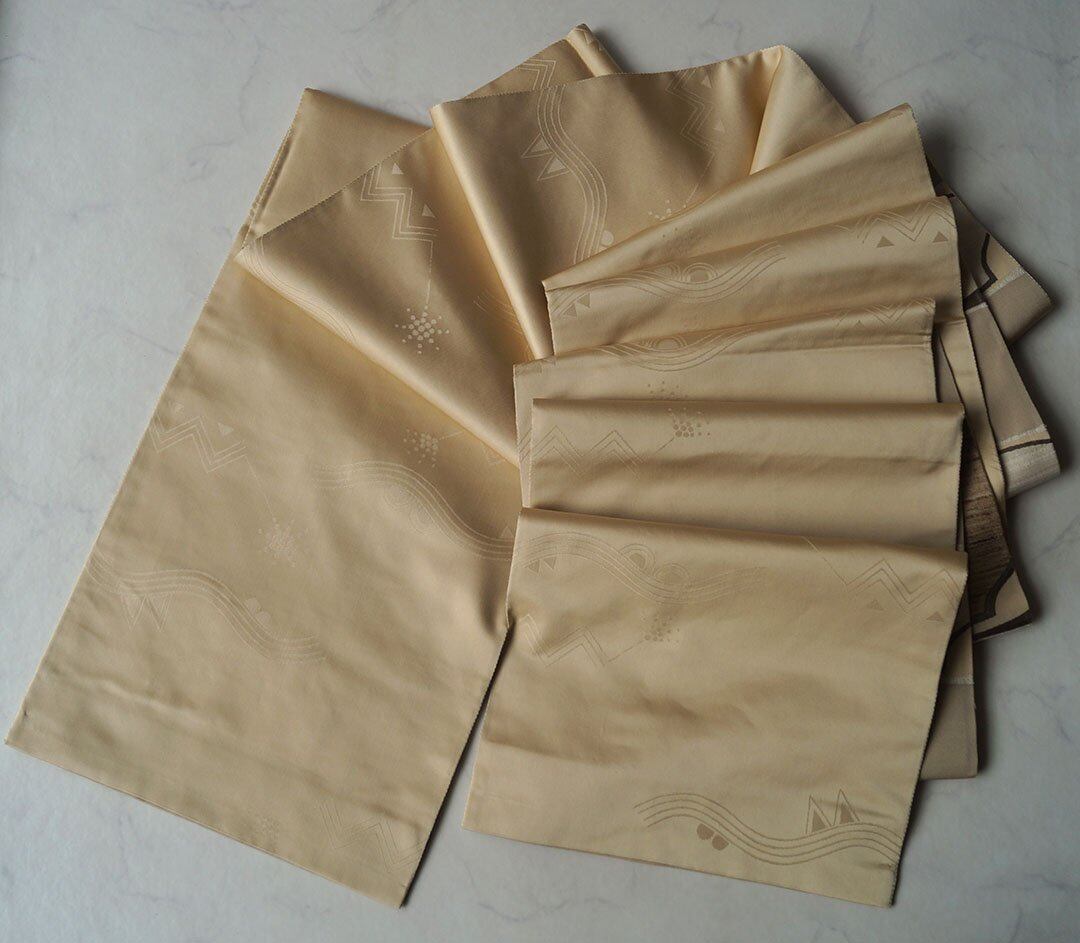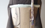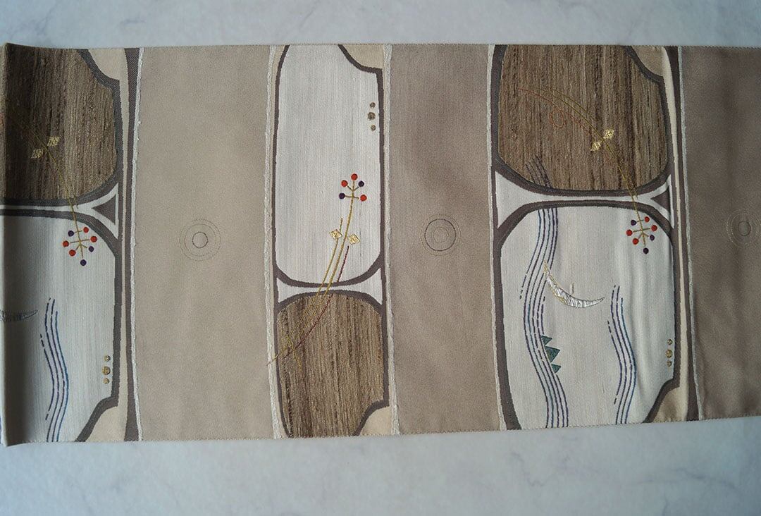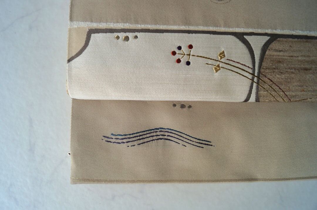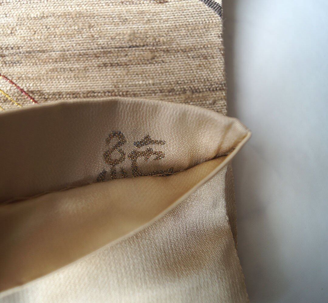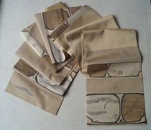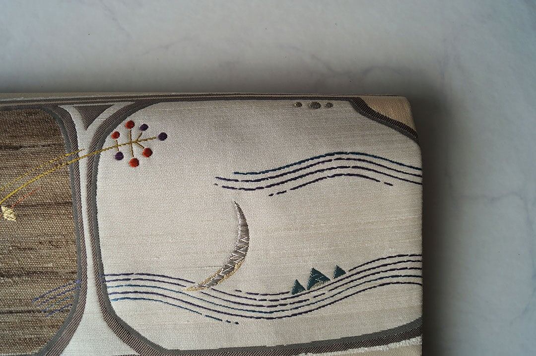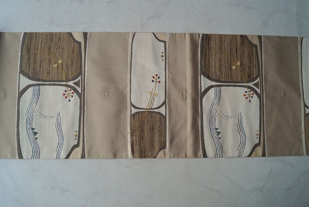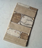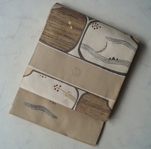 【ふくろ帯】ベージュ系 横段に風景文 洒落ふくろ帯