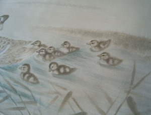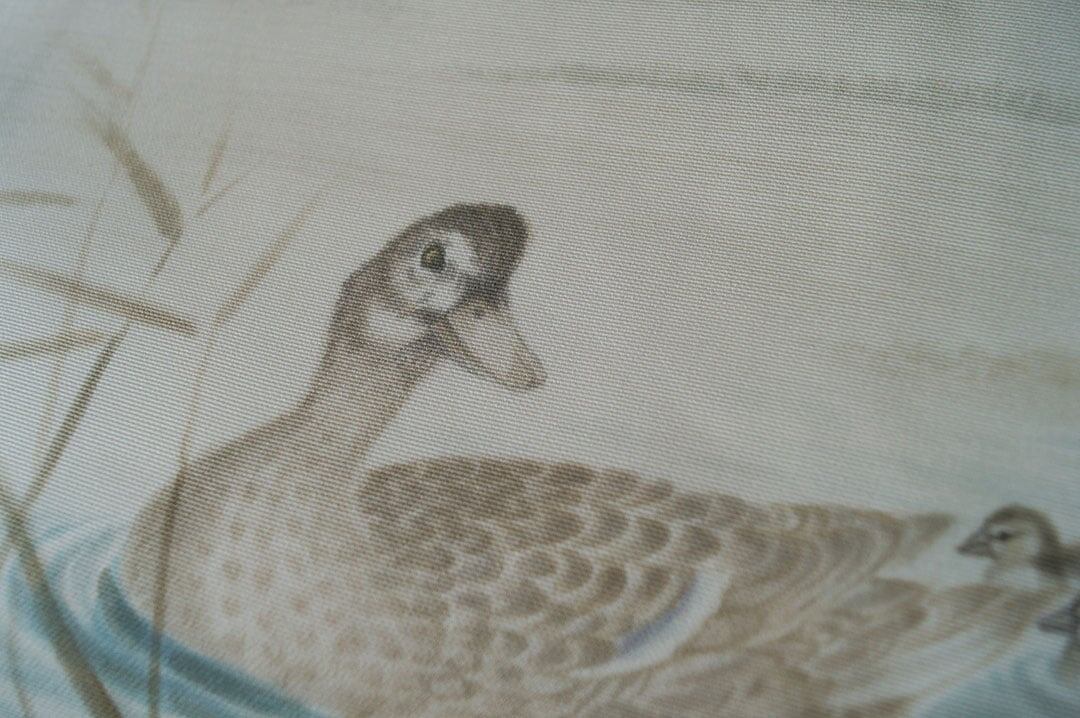 素色地に鴨と葦が描かれた