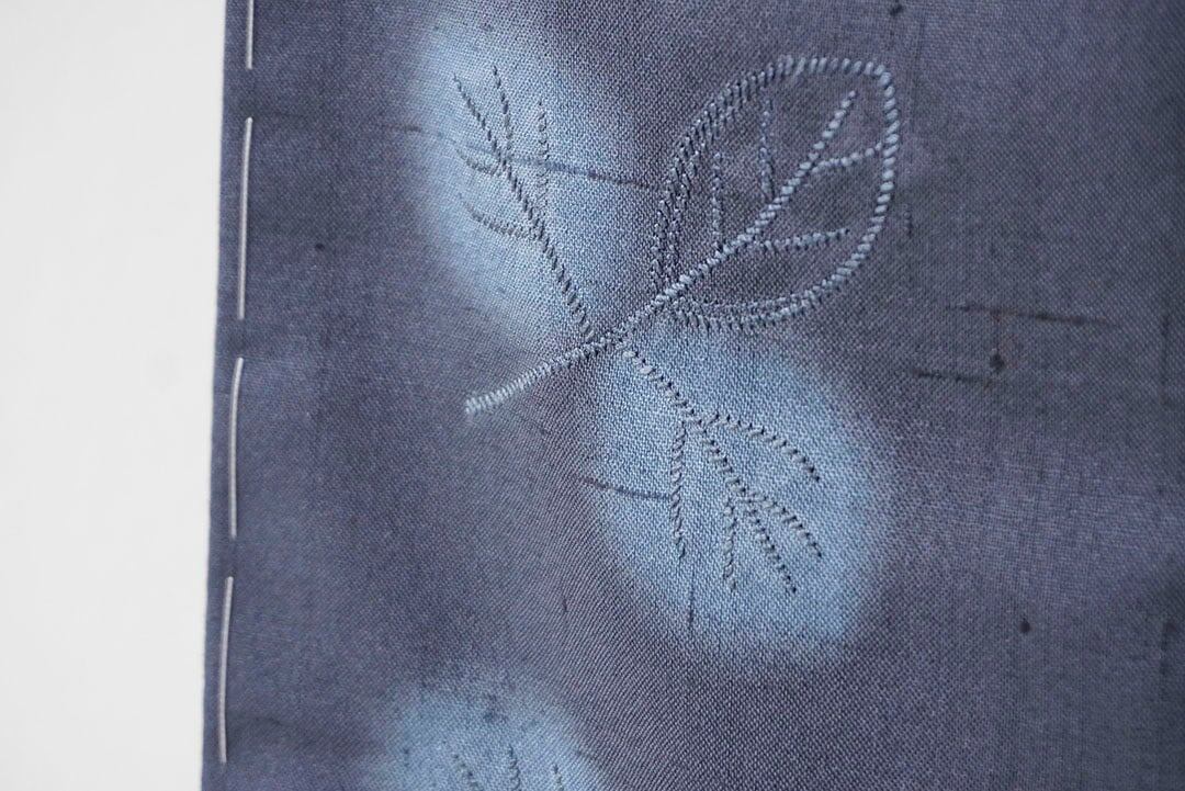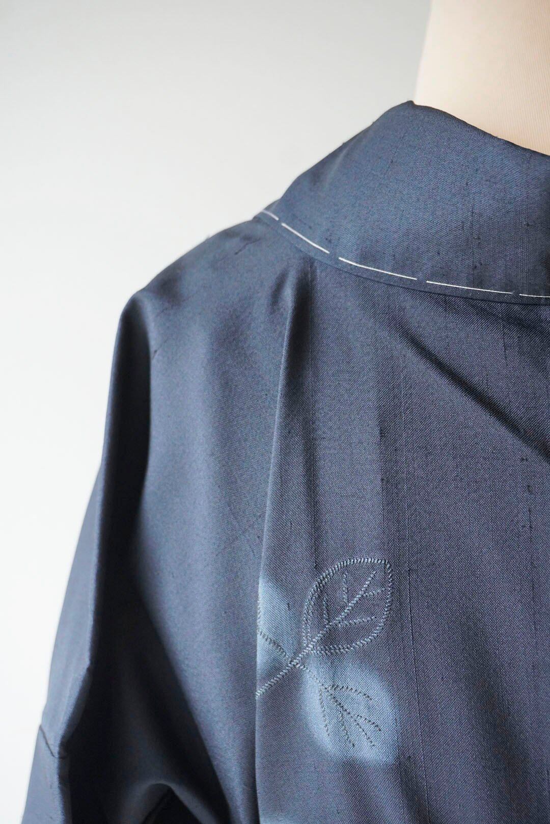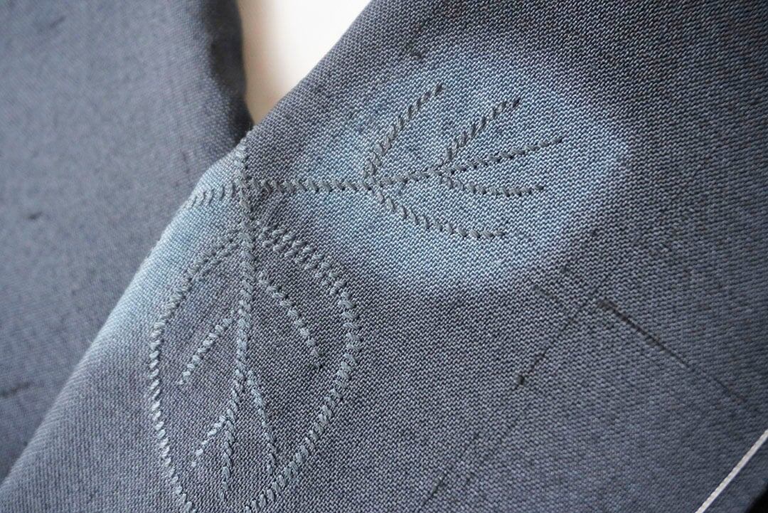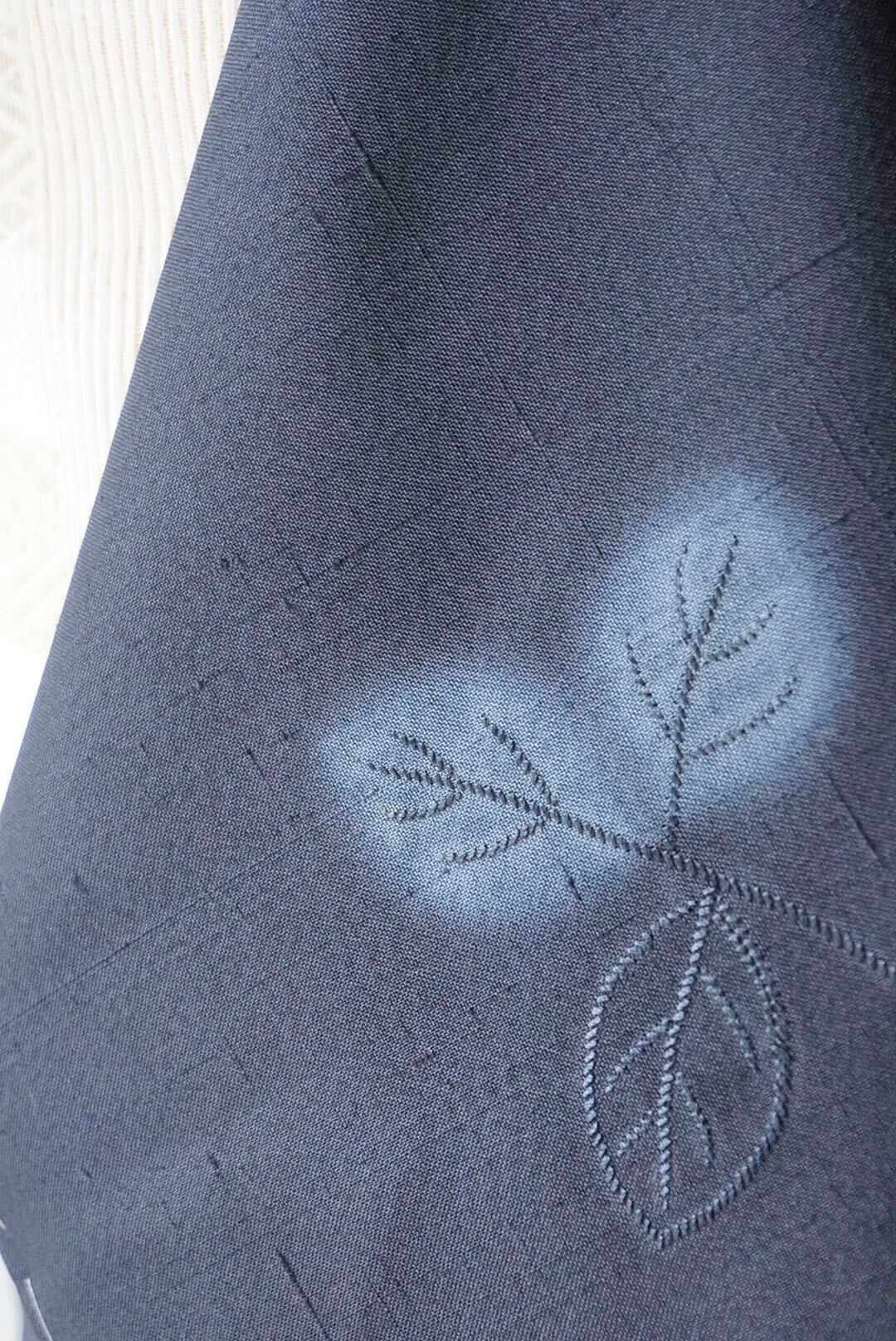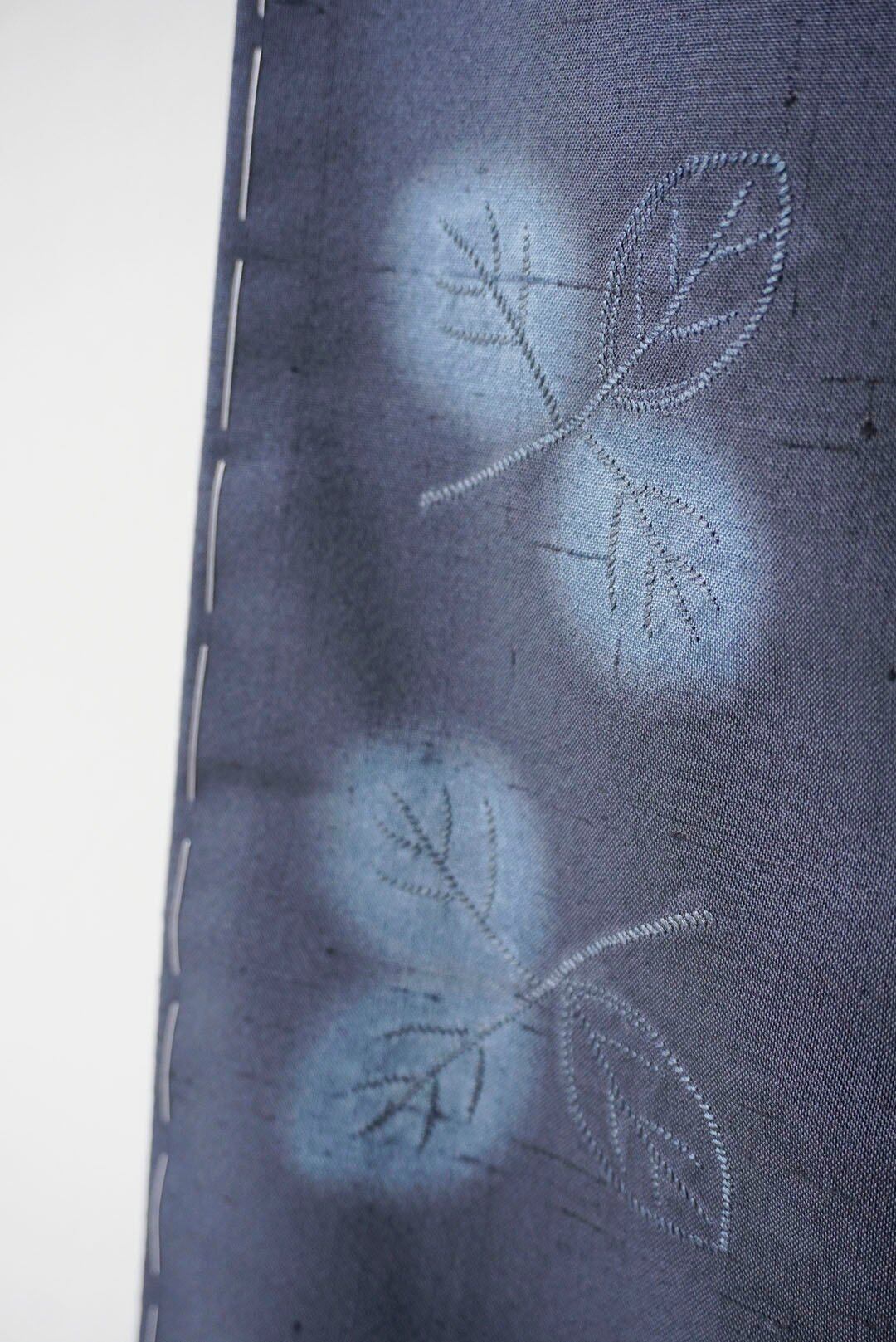 【袷】留紺色地 葉文暈し染と刺繍の紬