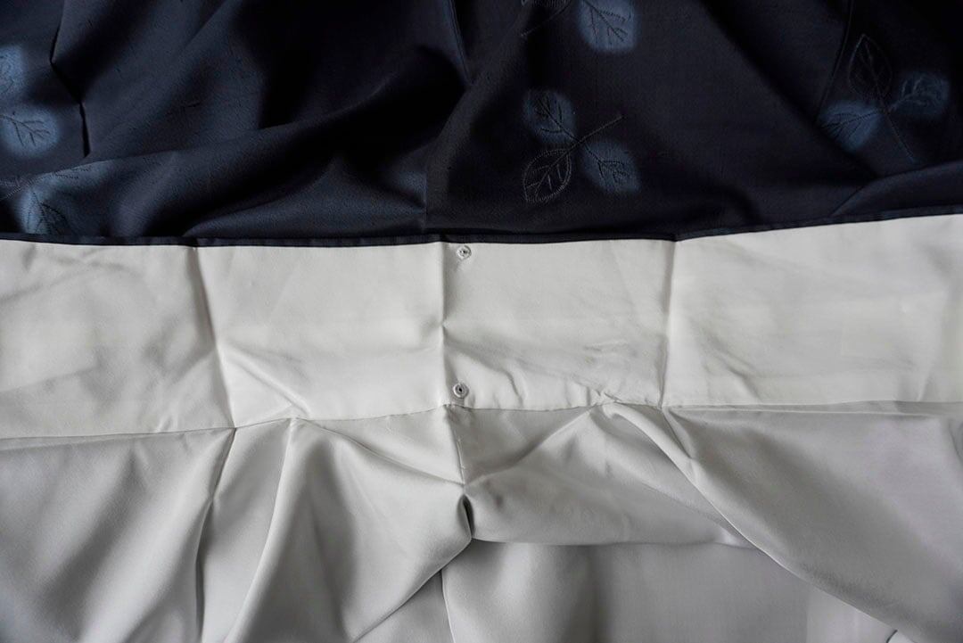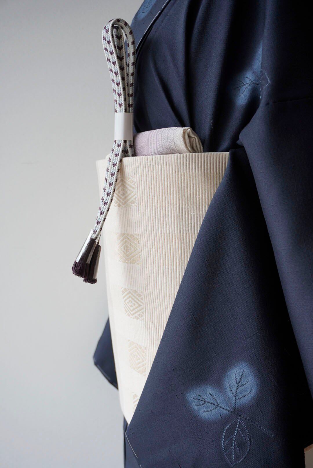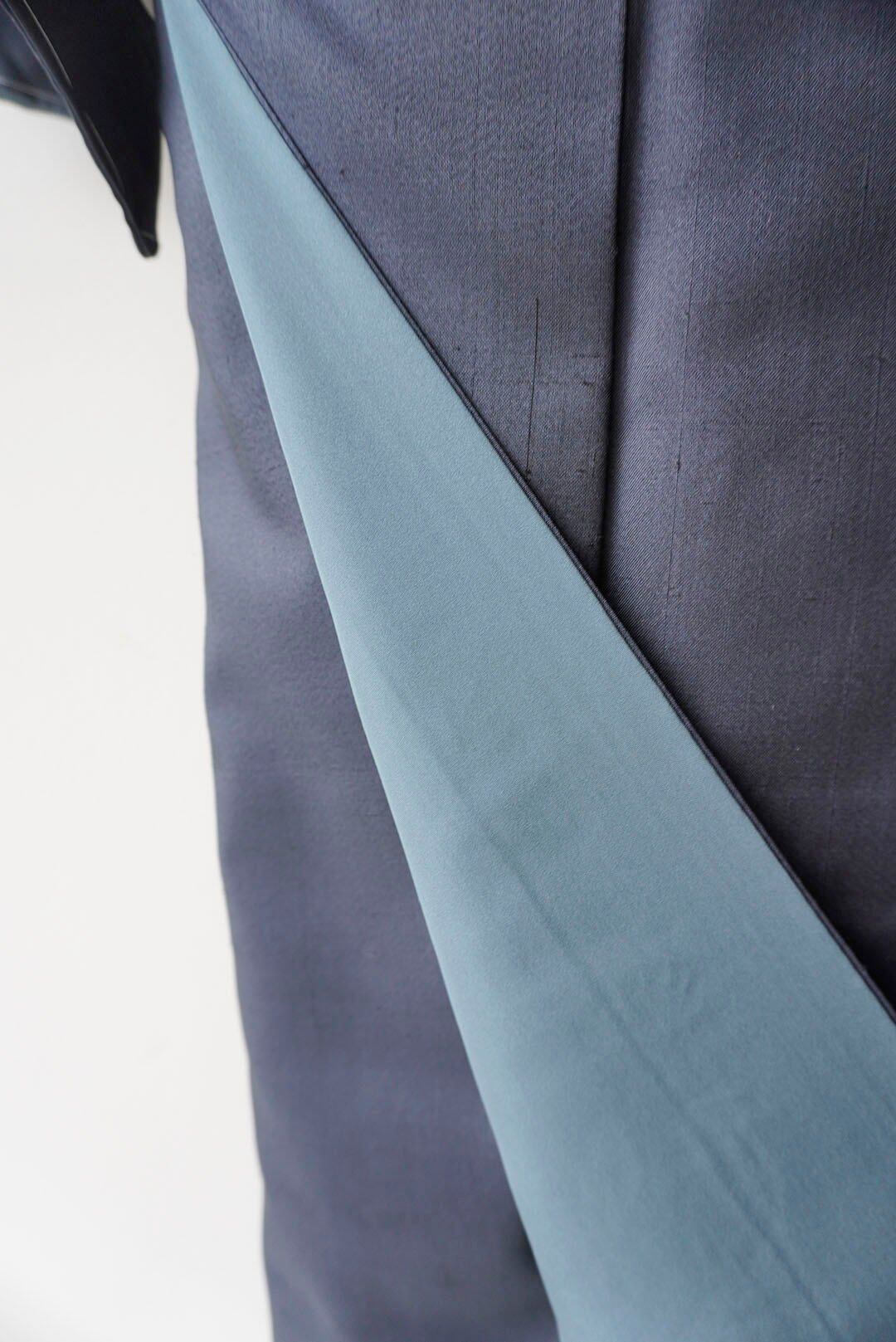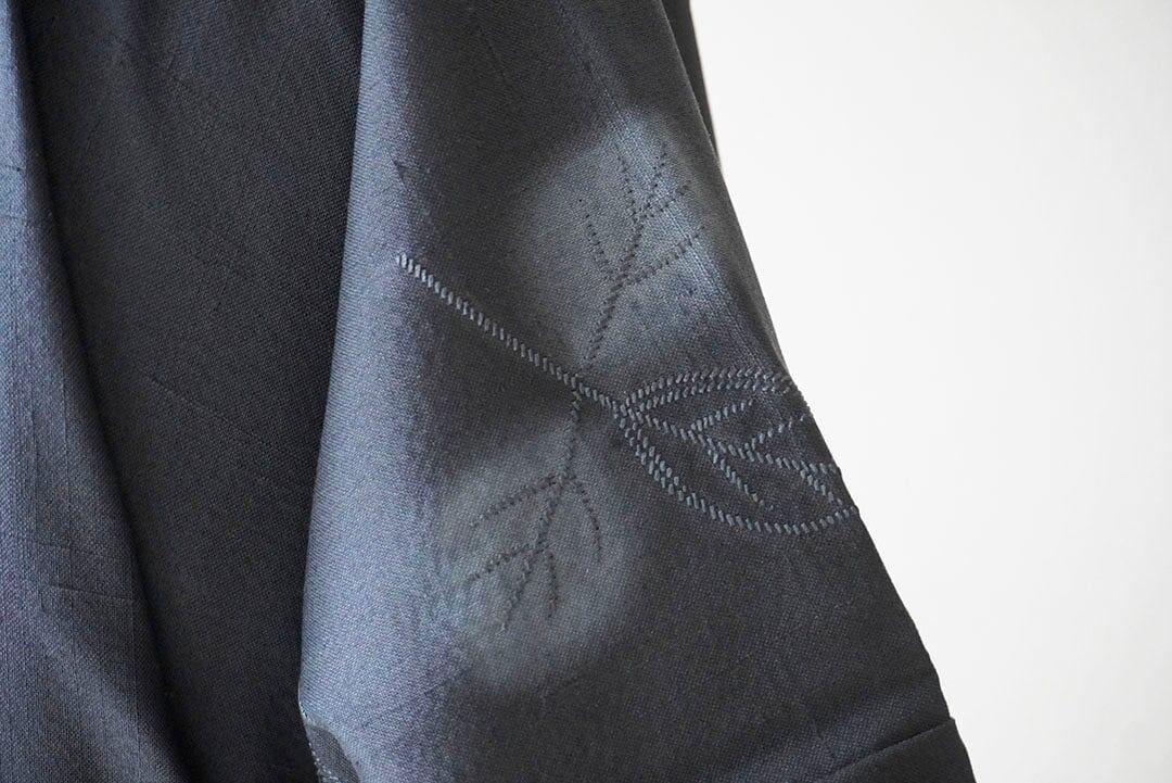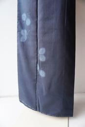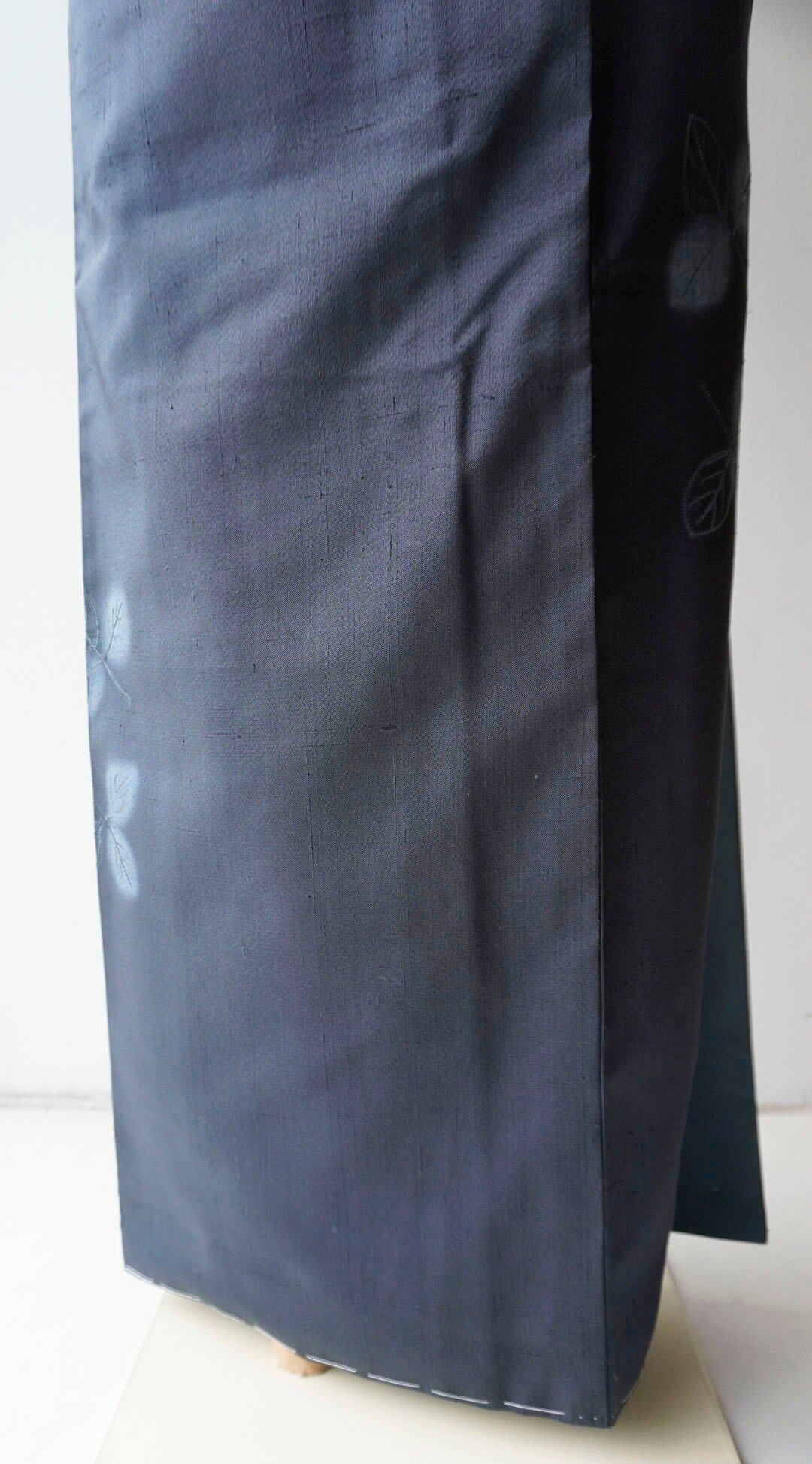 【袷】留紺色地 葉文暈し染と刺繍の紬