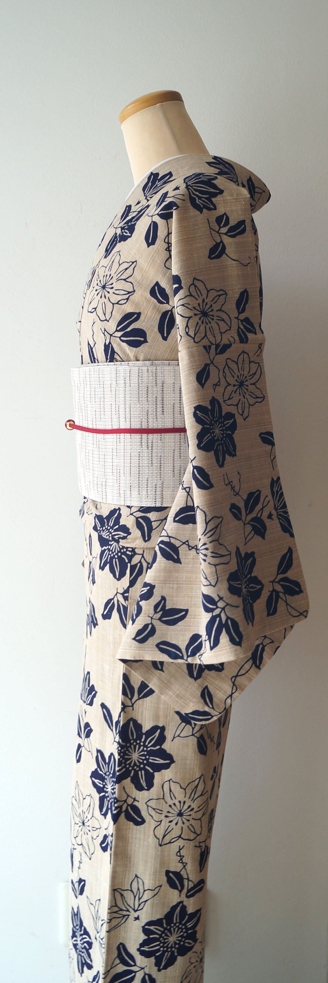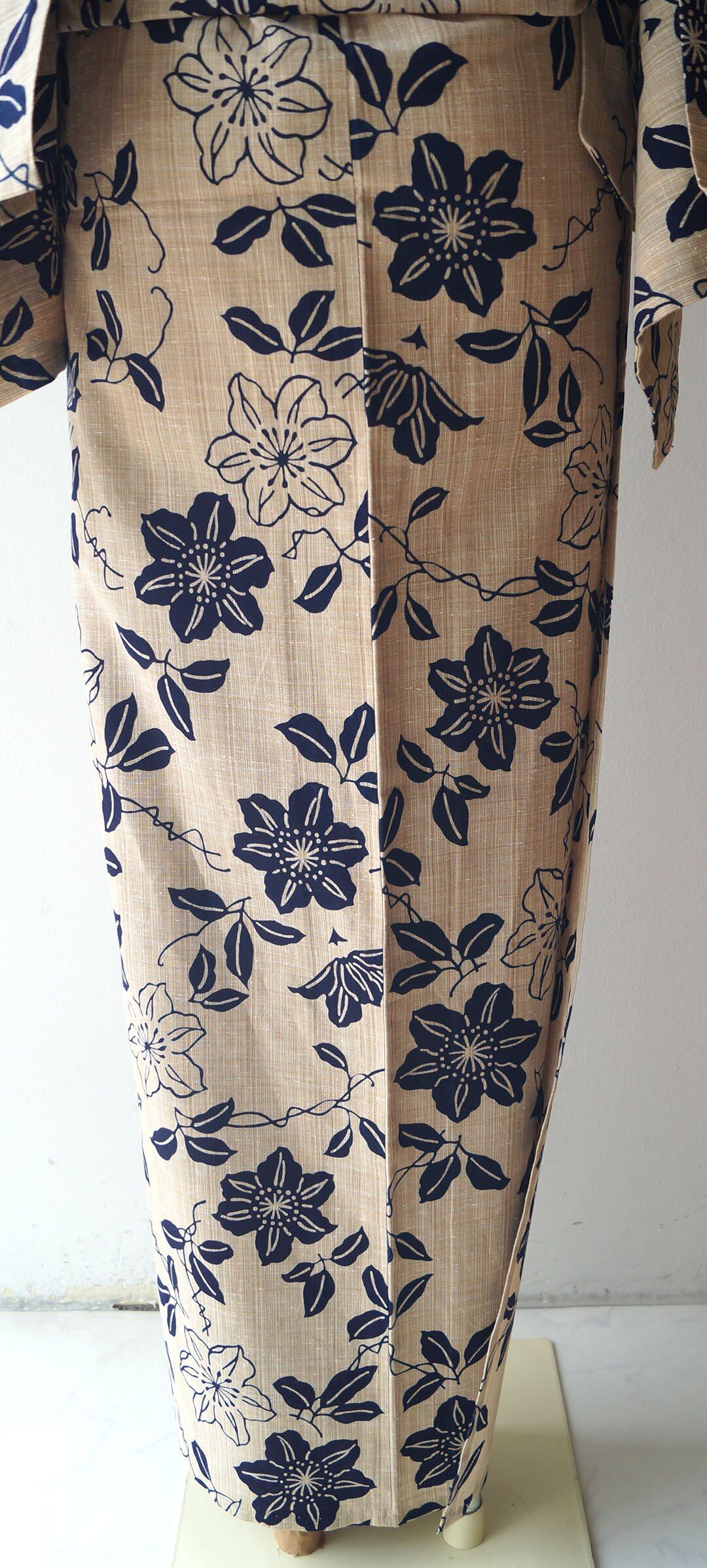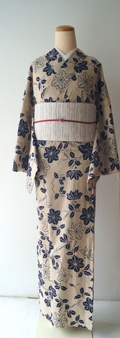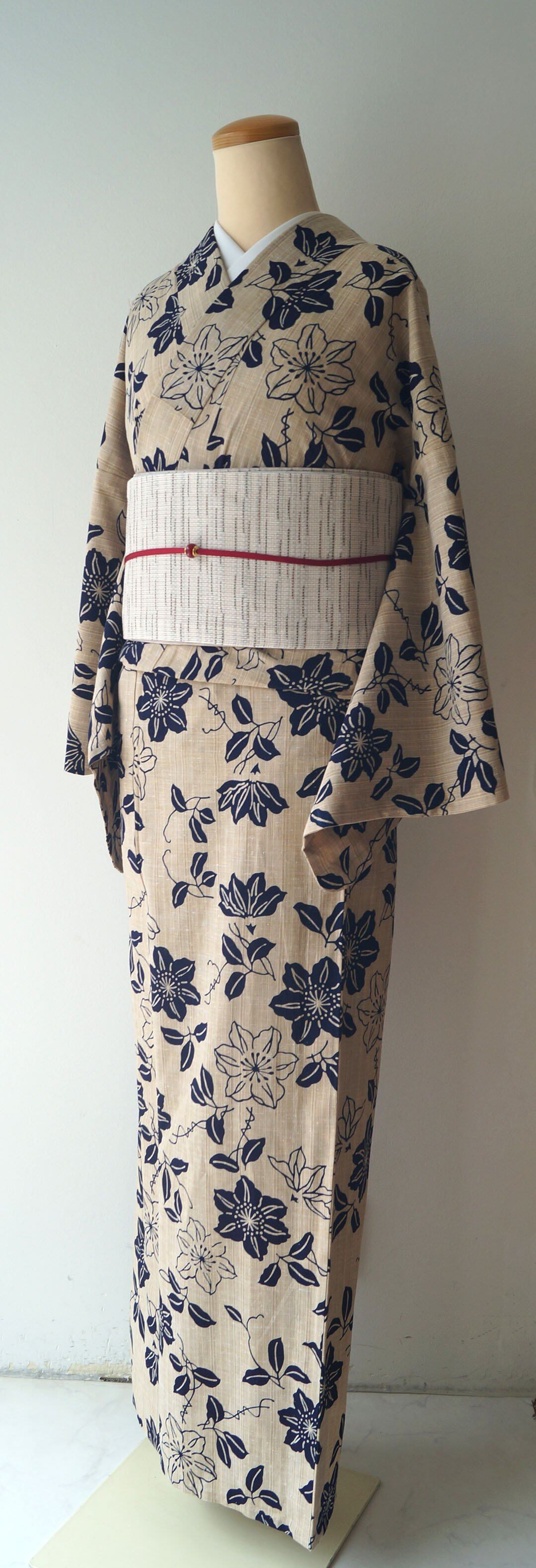 砥の粉色の地色にクレマチス柄の浴衣です。