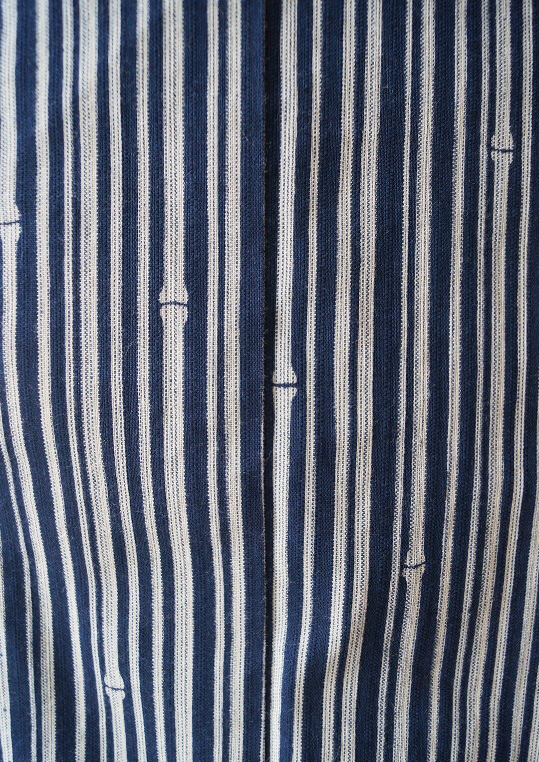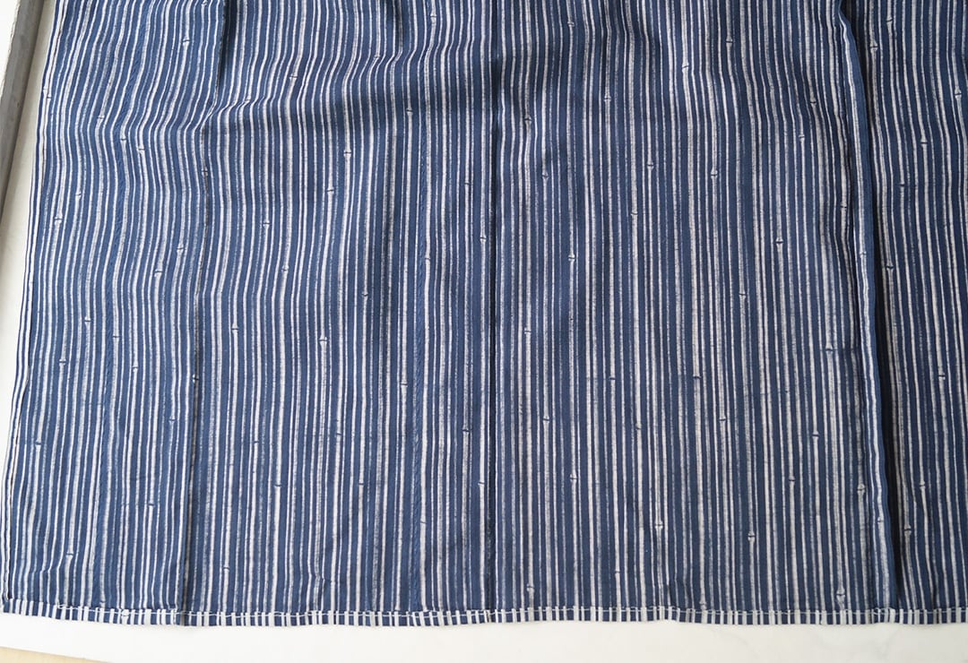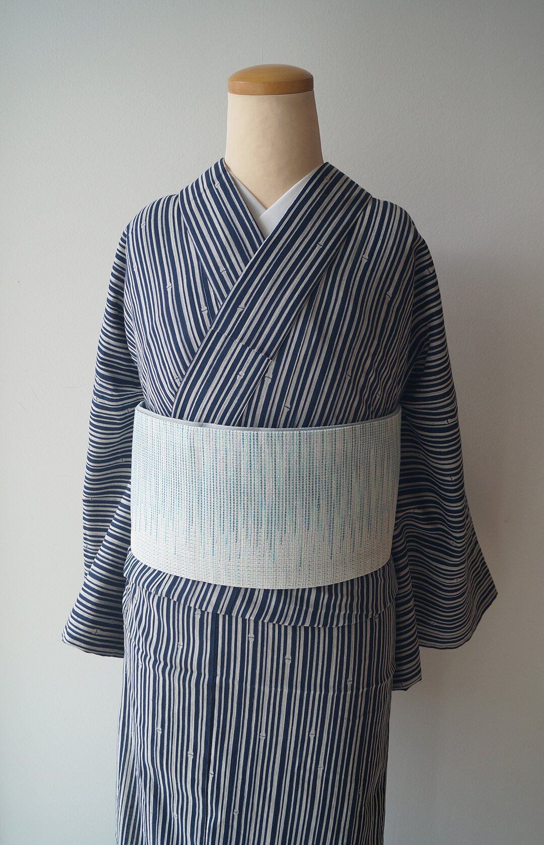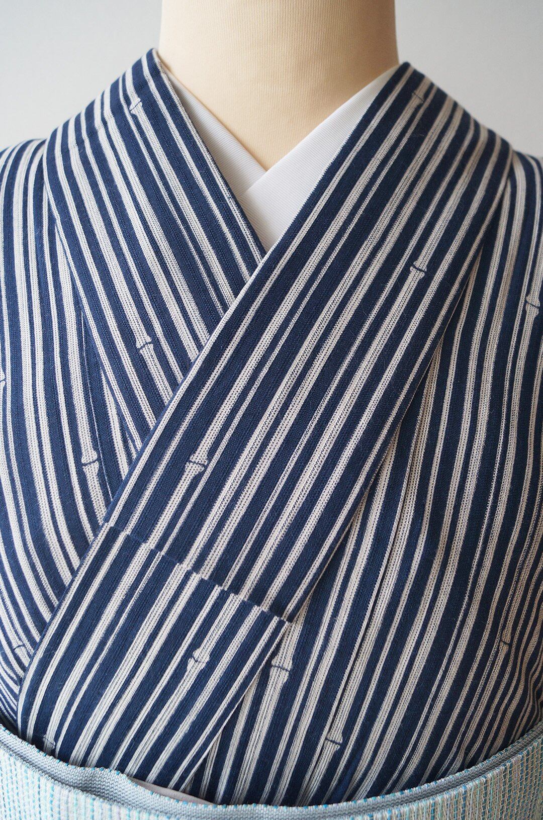 深い紺色の地に、細い竹の縞柄の浴衣です。