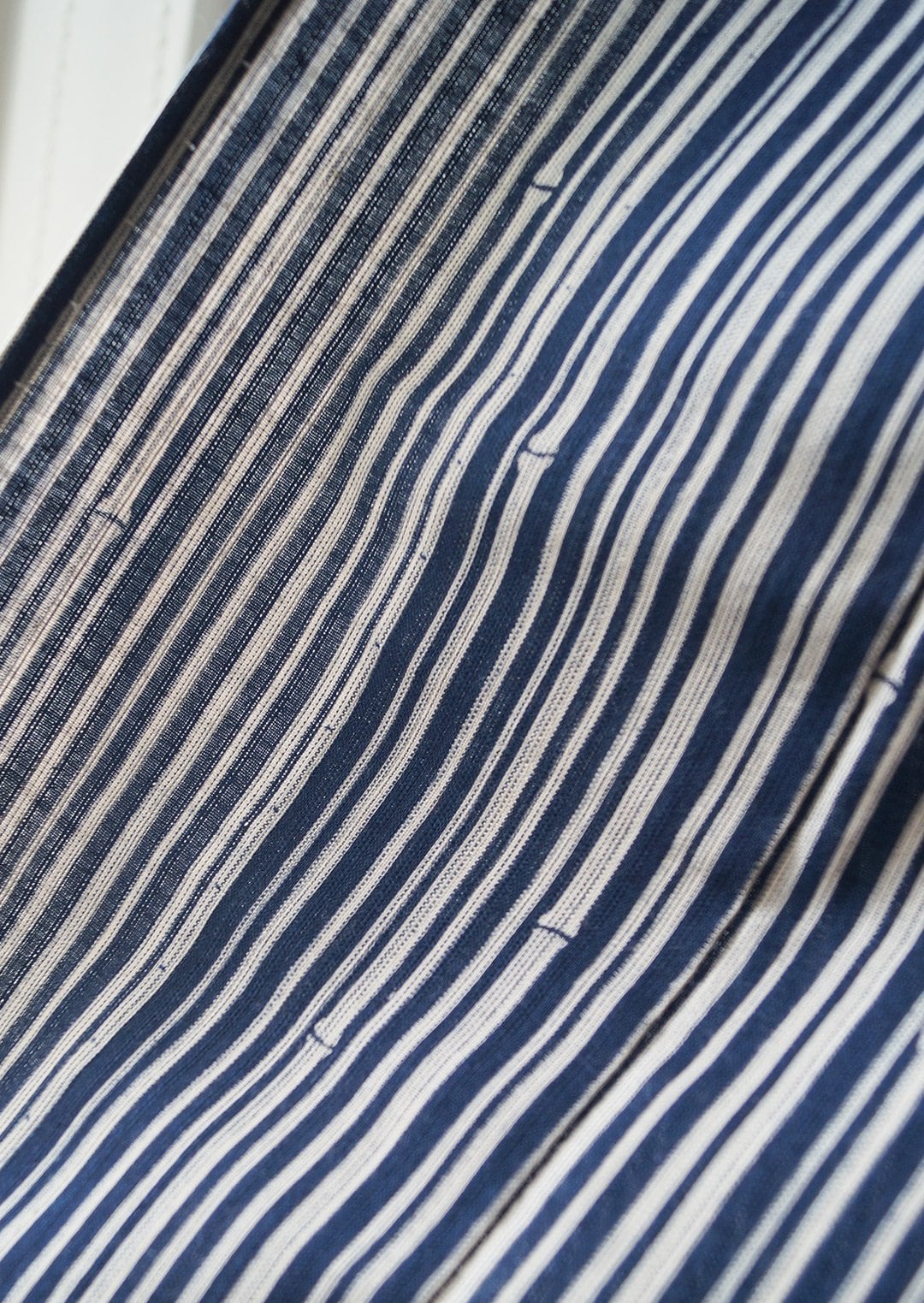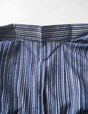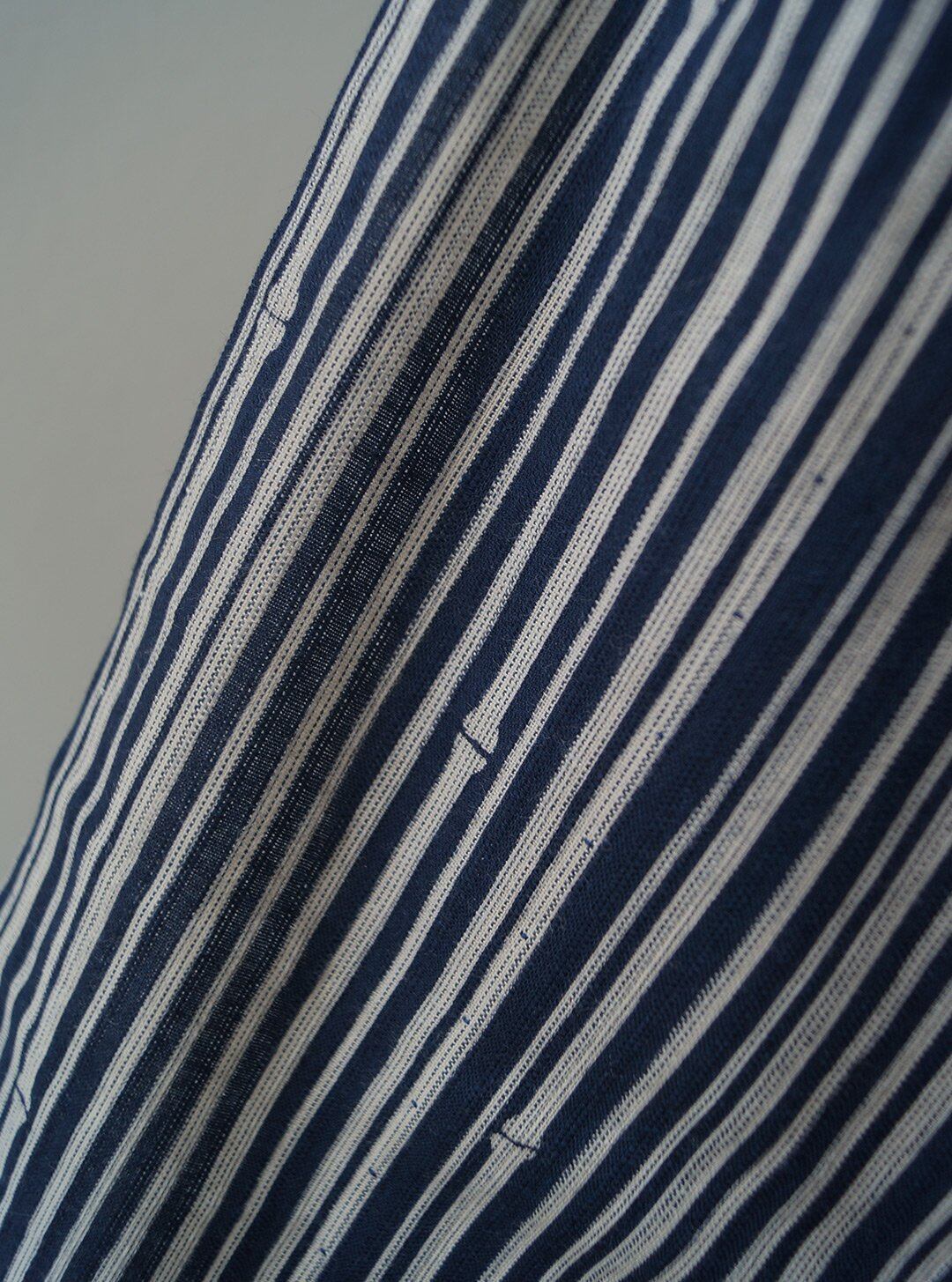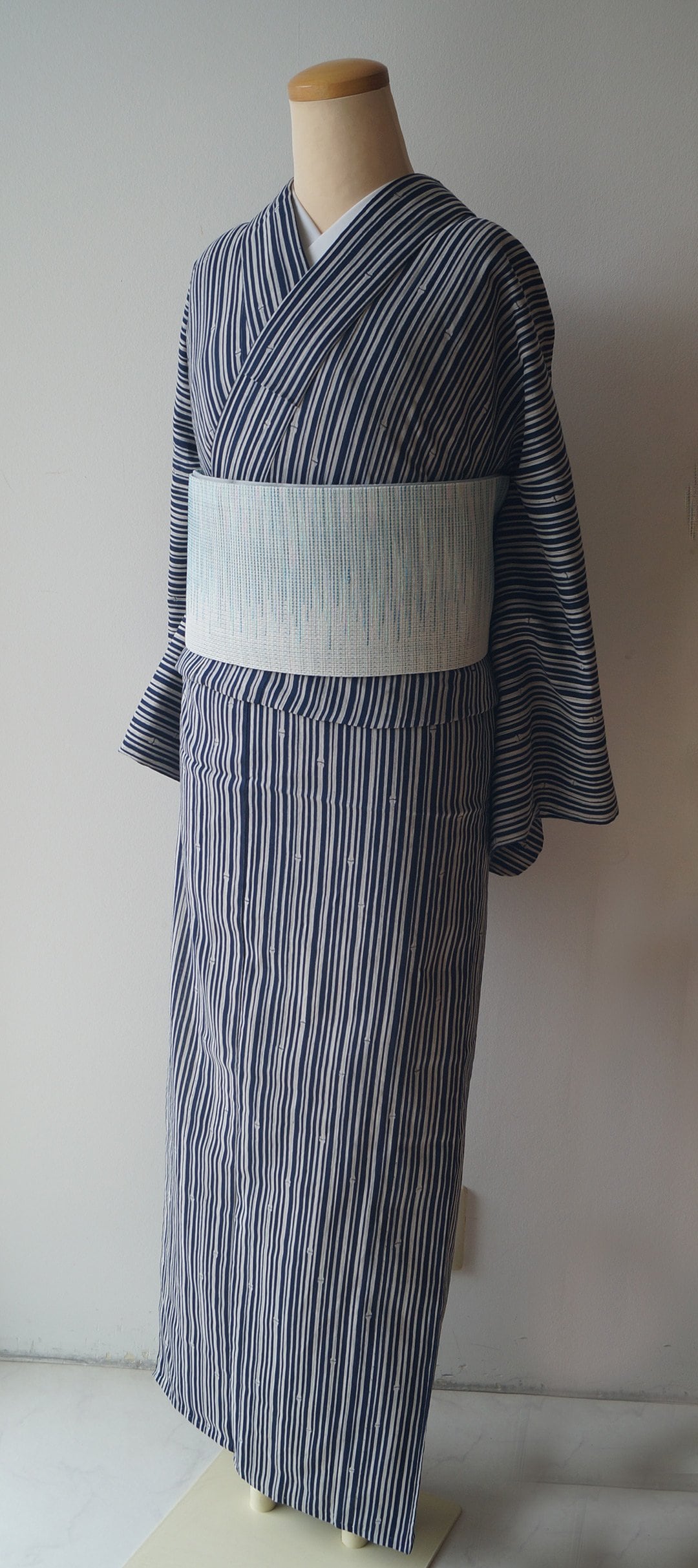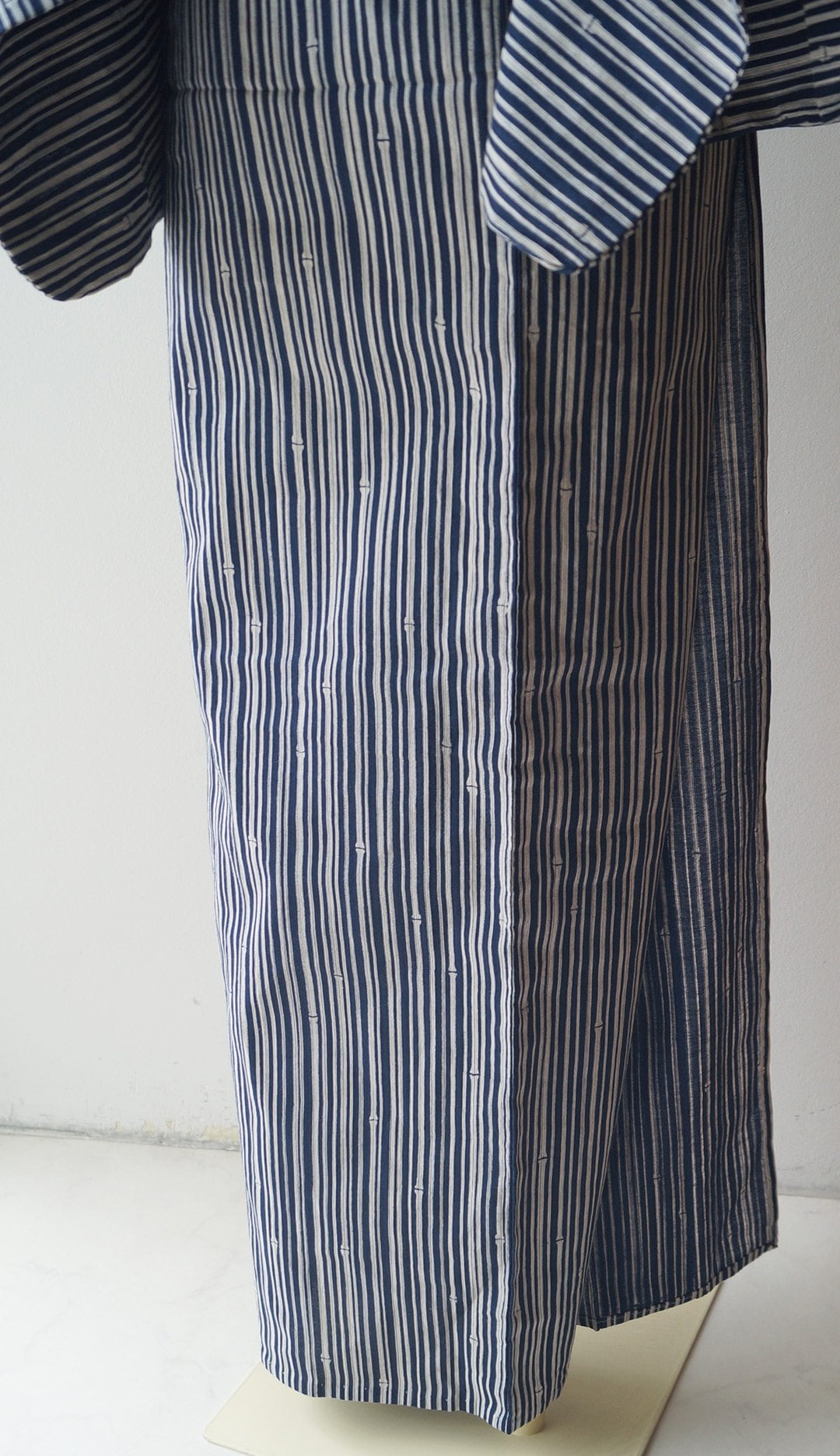 深い紺色の地に、細い竹の縞柄の浴衣です。