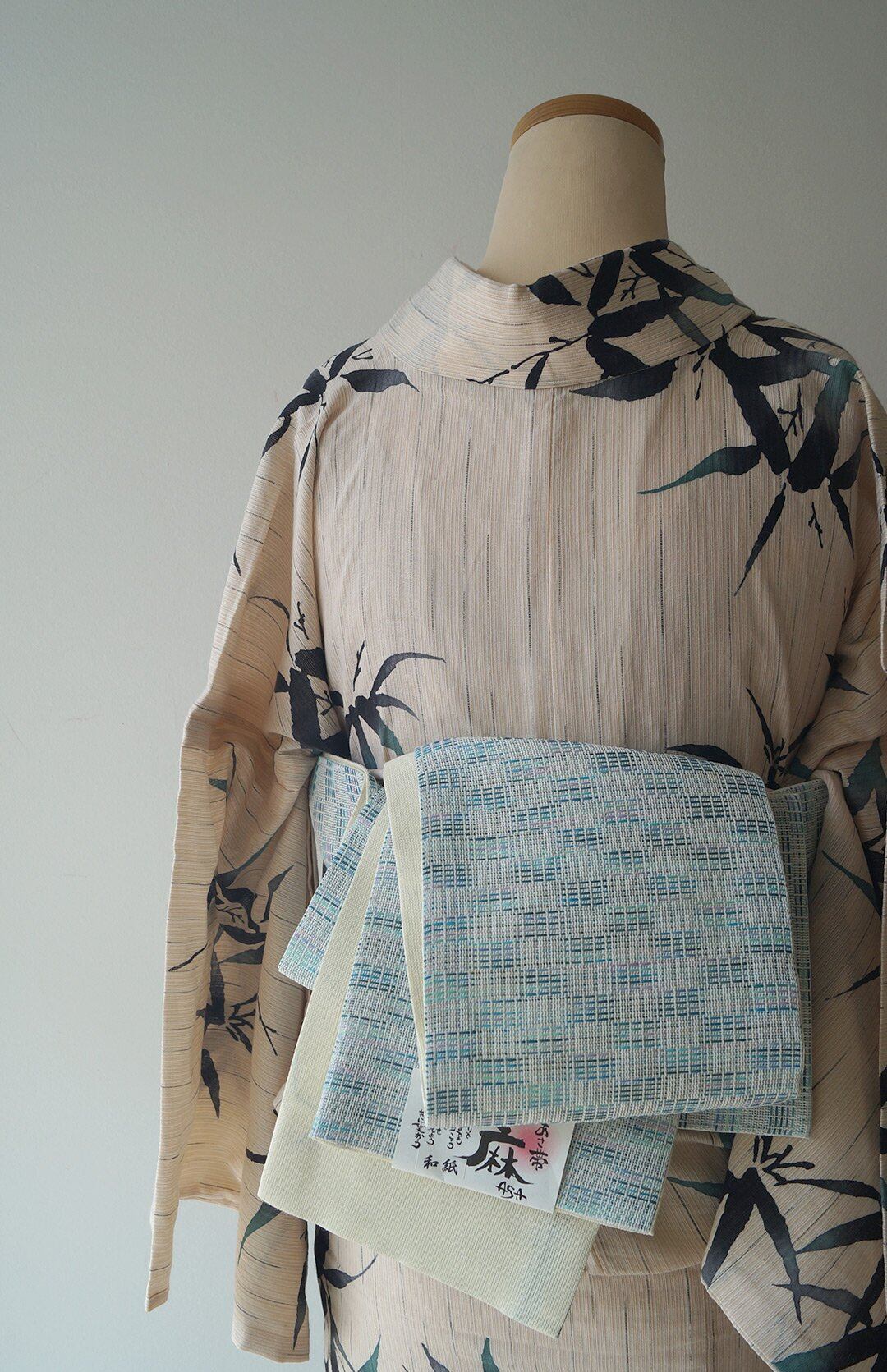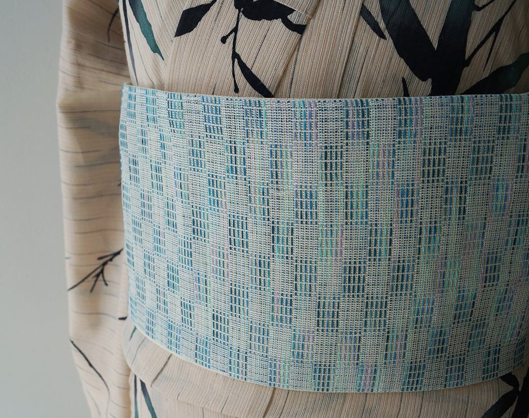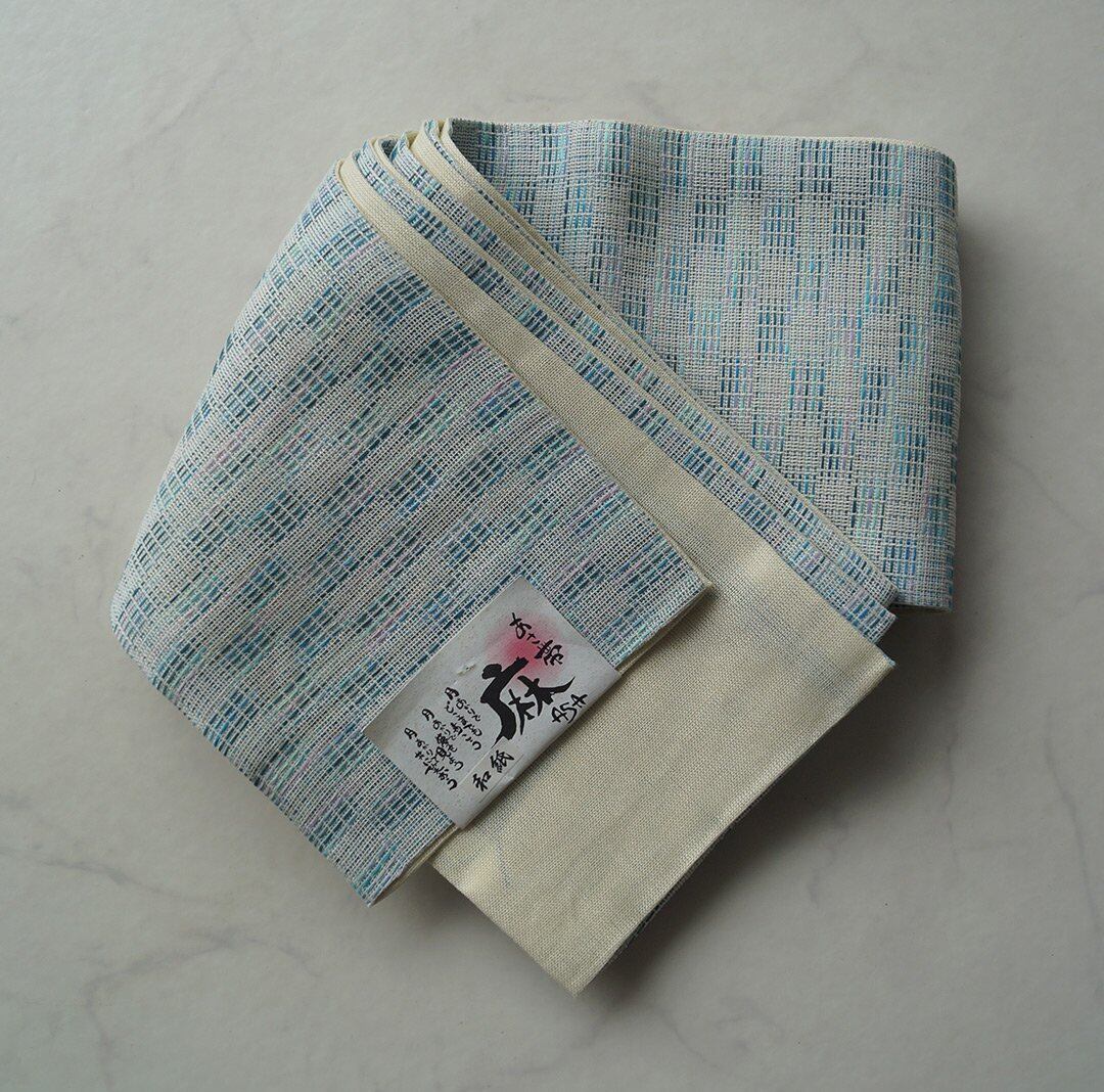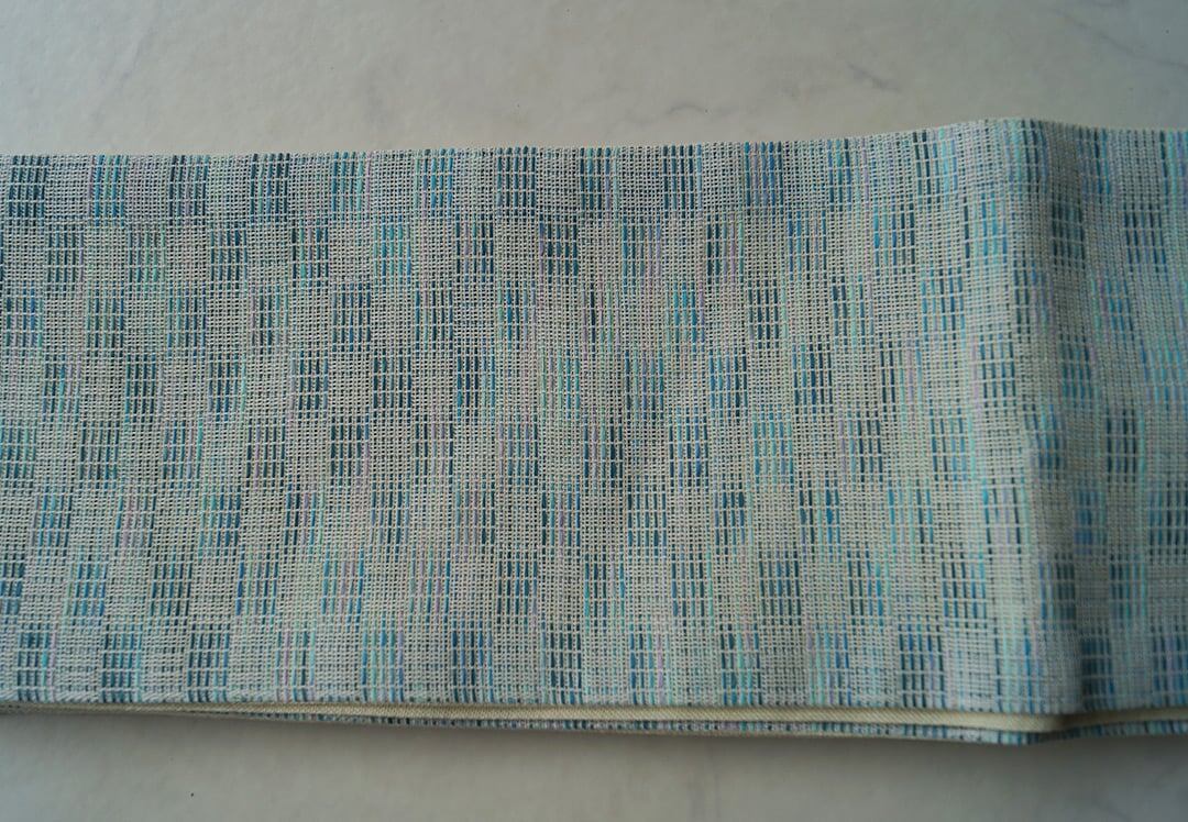 【半幅帯】青パステル系 格子市松柄 麻半幅帯 No.240821㉕