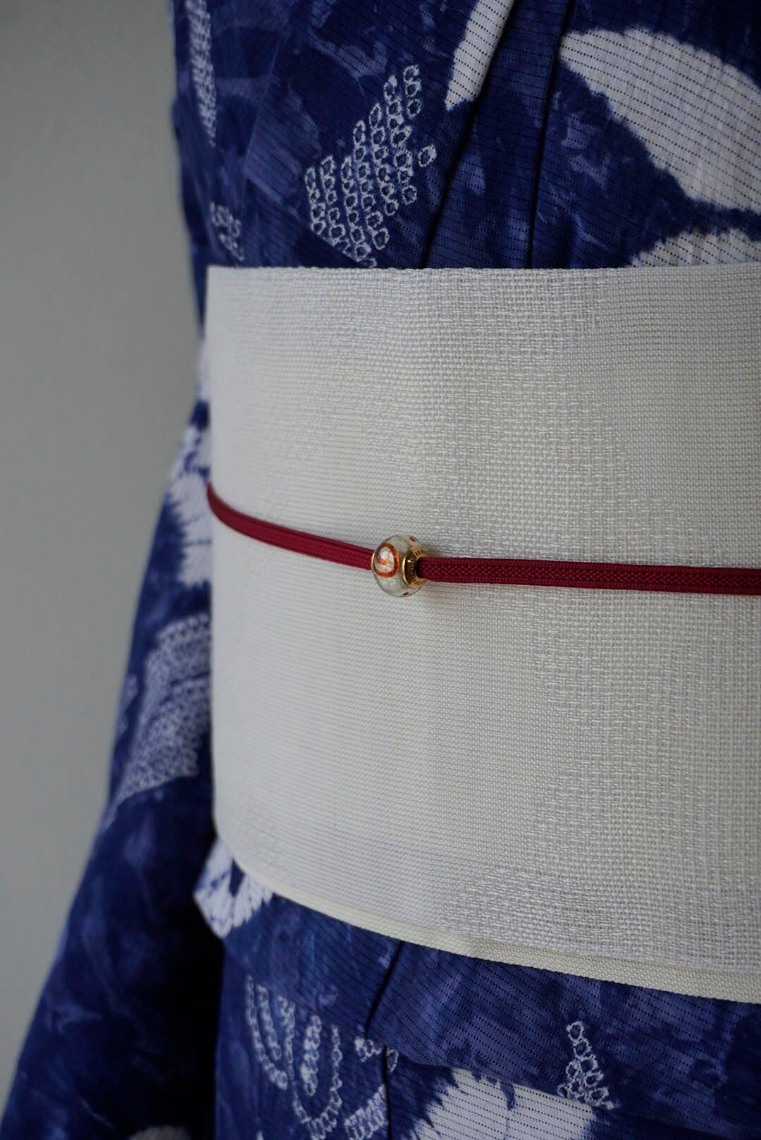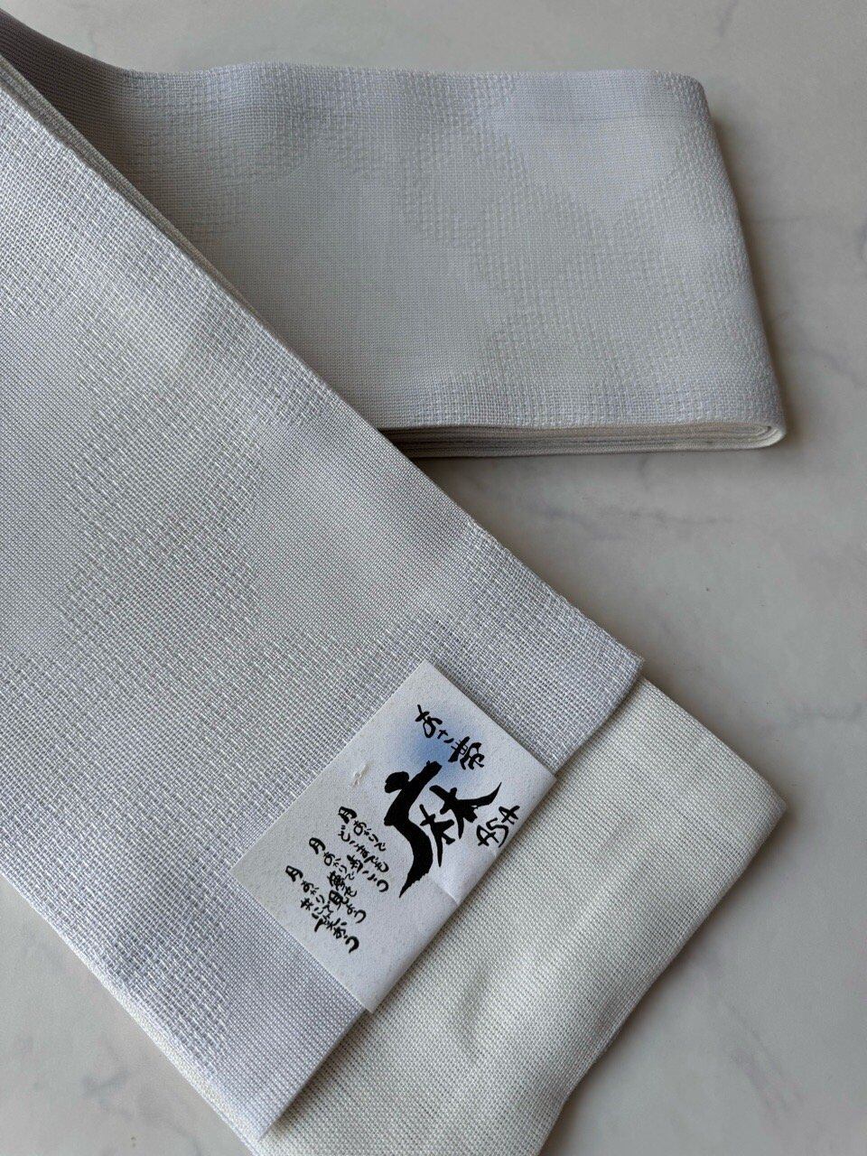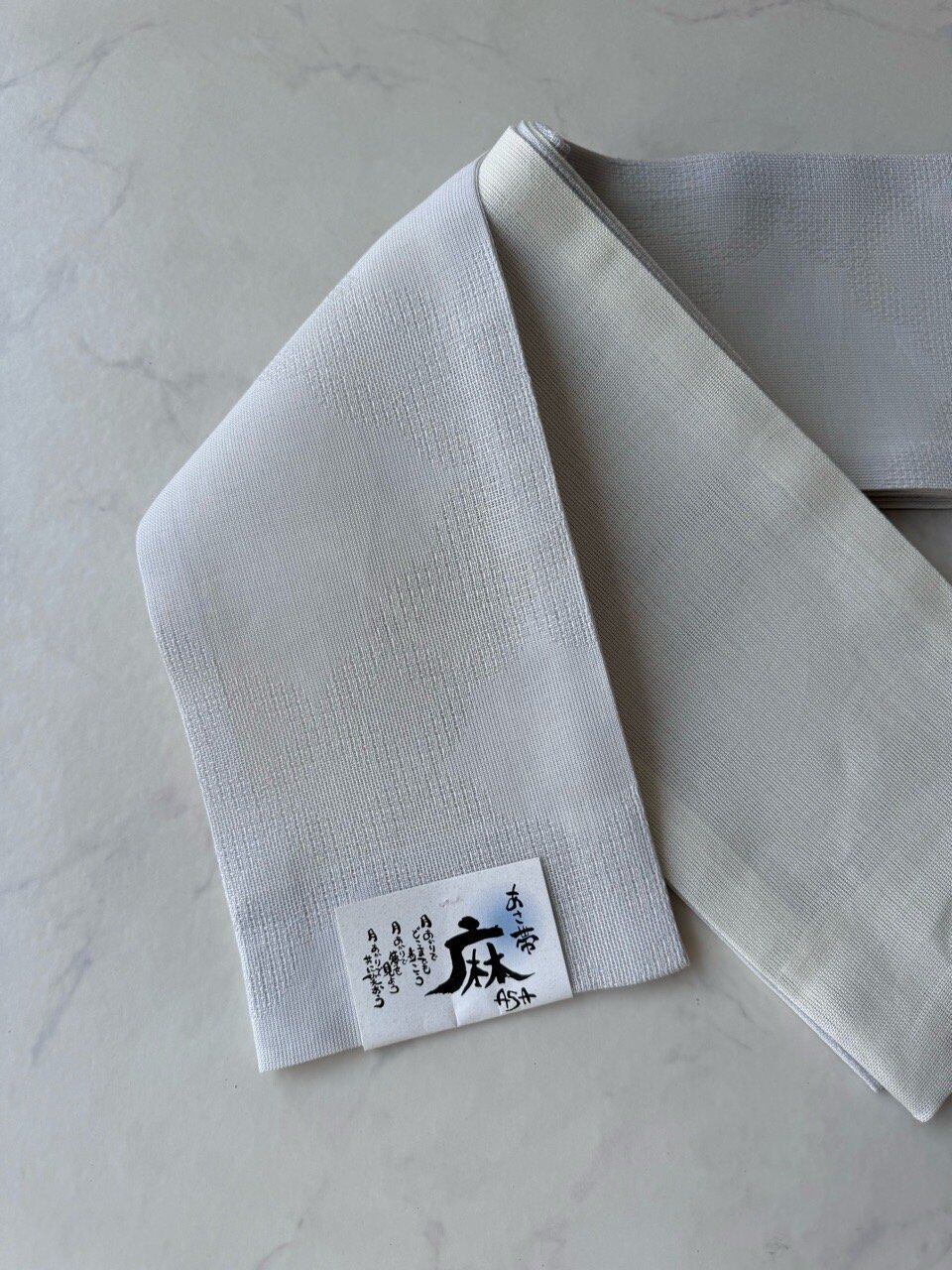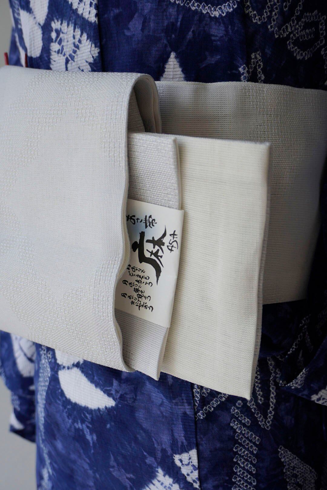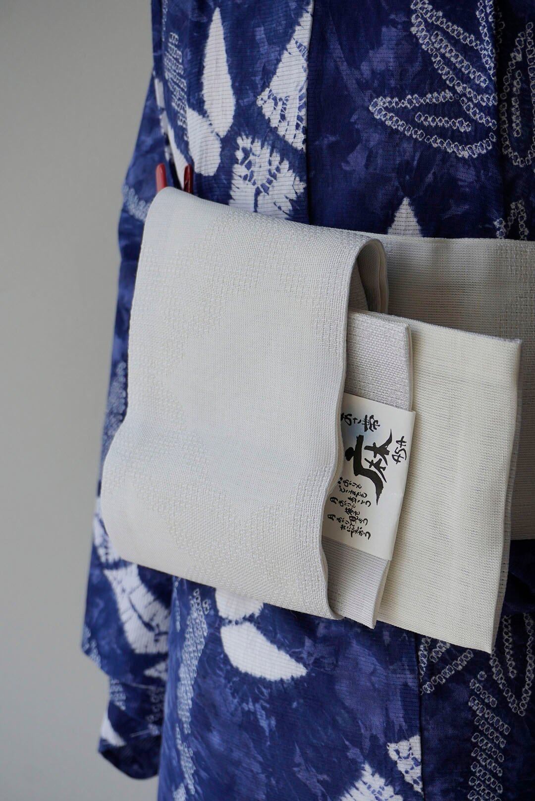 【半幅帯】藍白×白 七宝繋ぎ織り柄 麻半幅帯 240725⑤