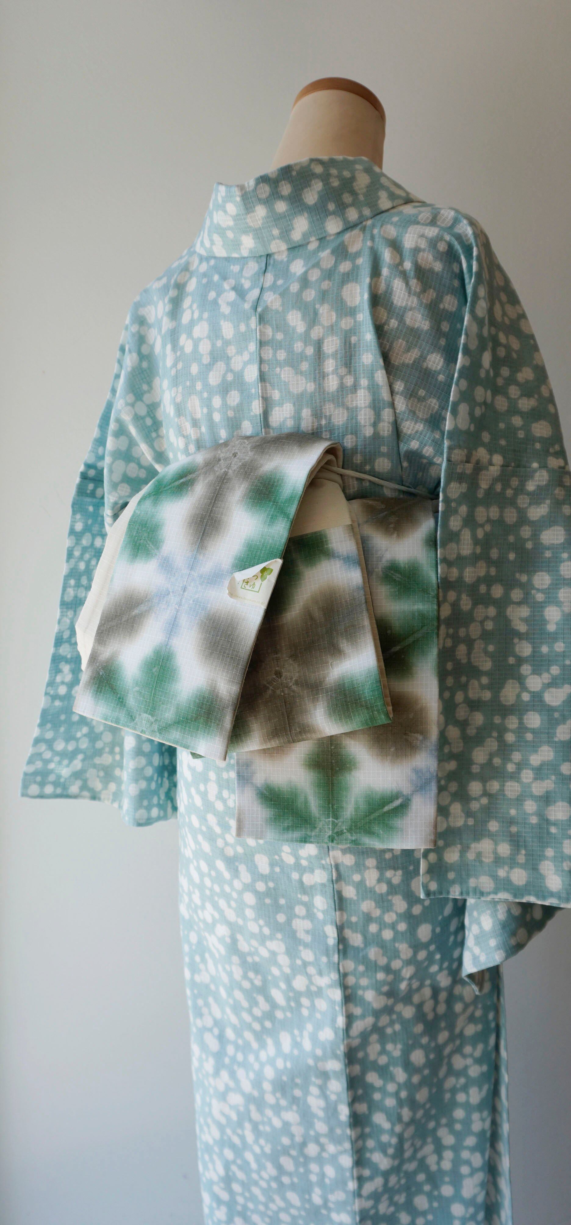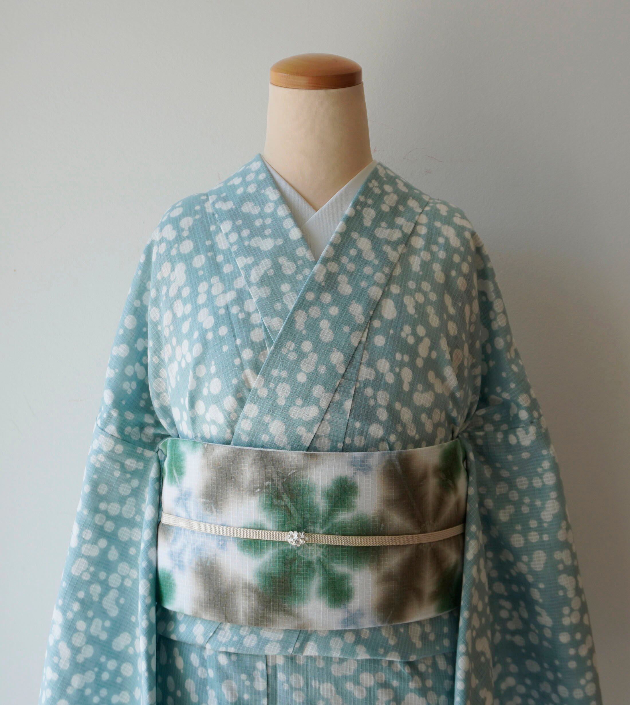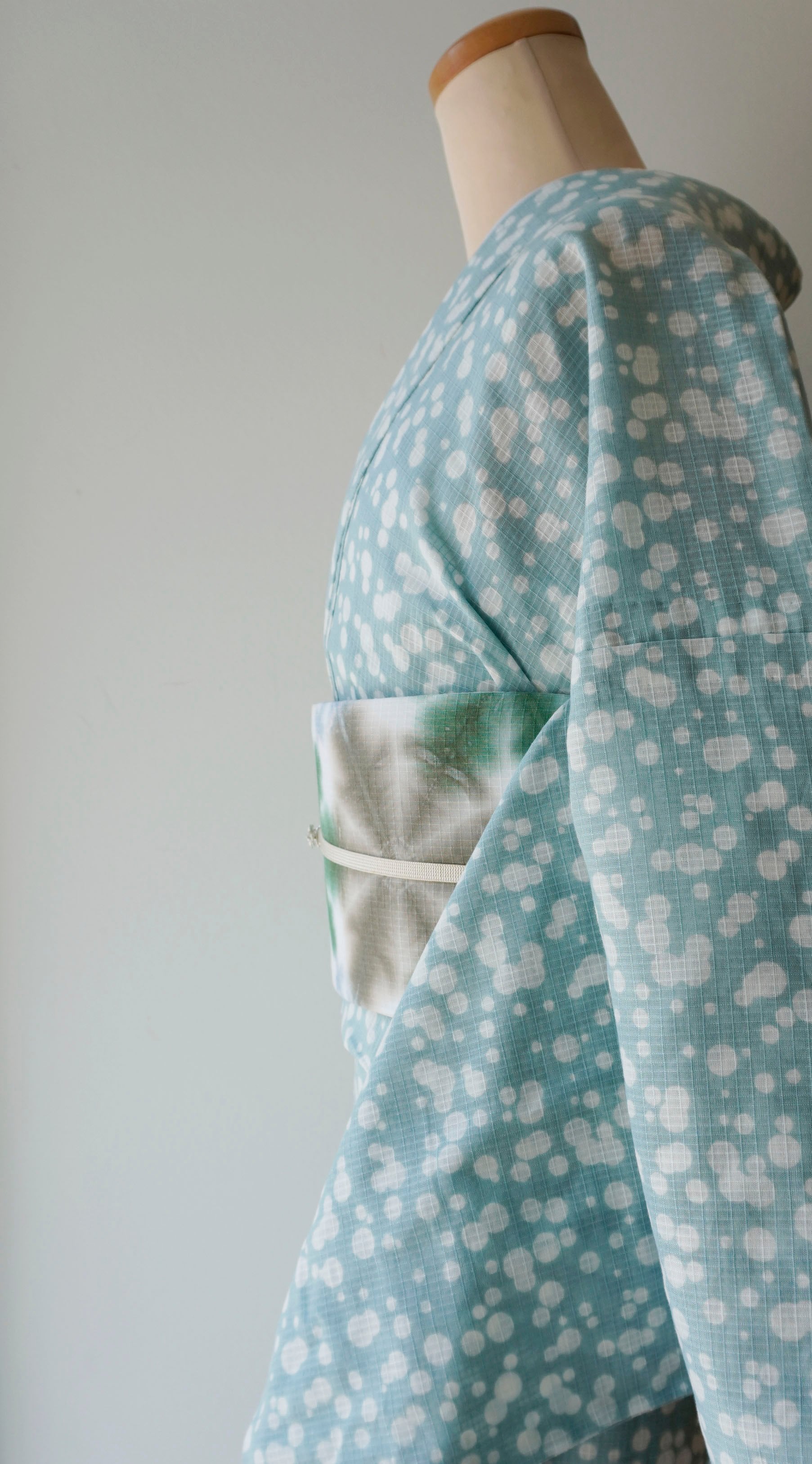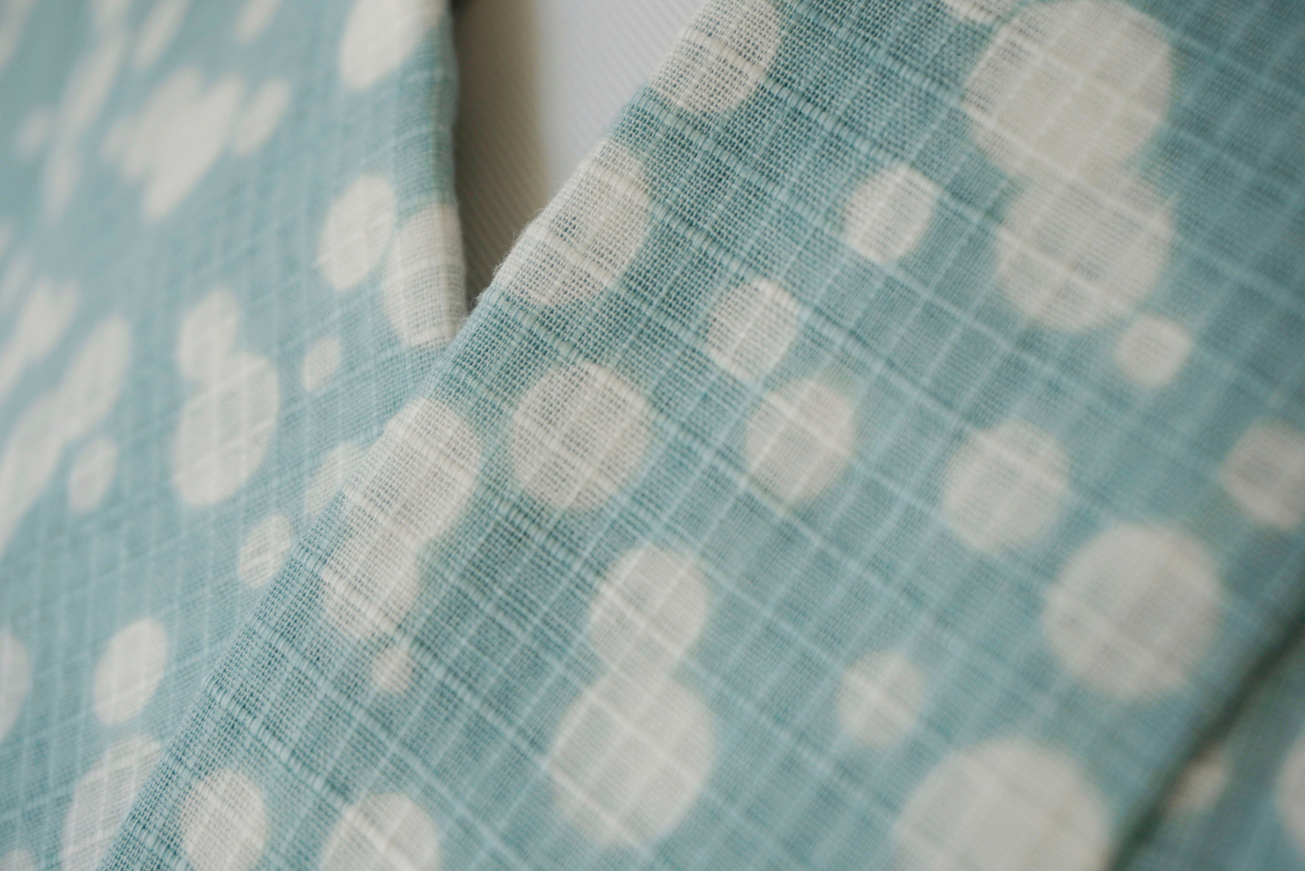 【浴衣】小千谷織物 綿麻紅梅 越後型染浴衣 白群色水玉文