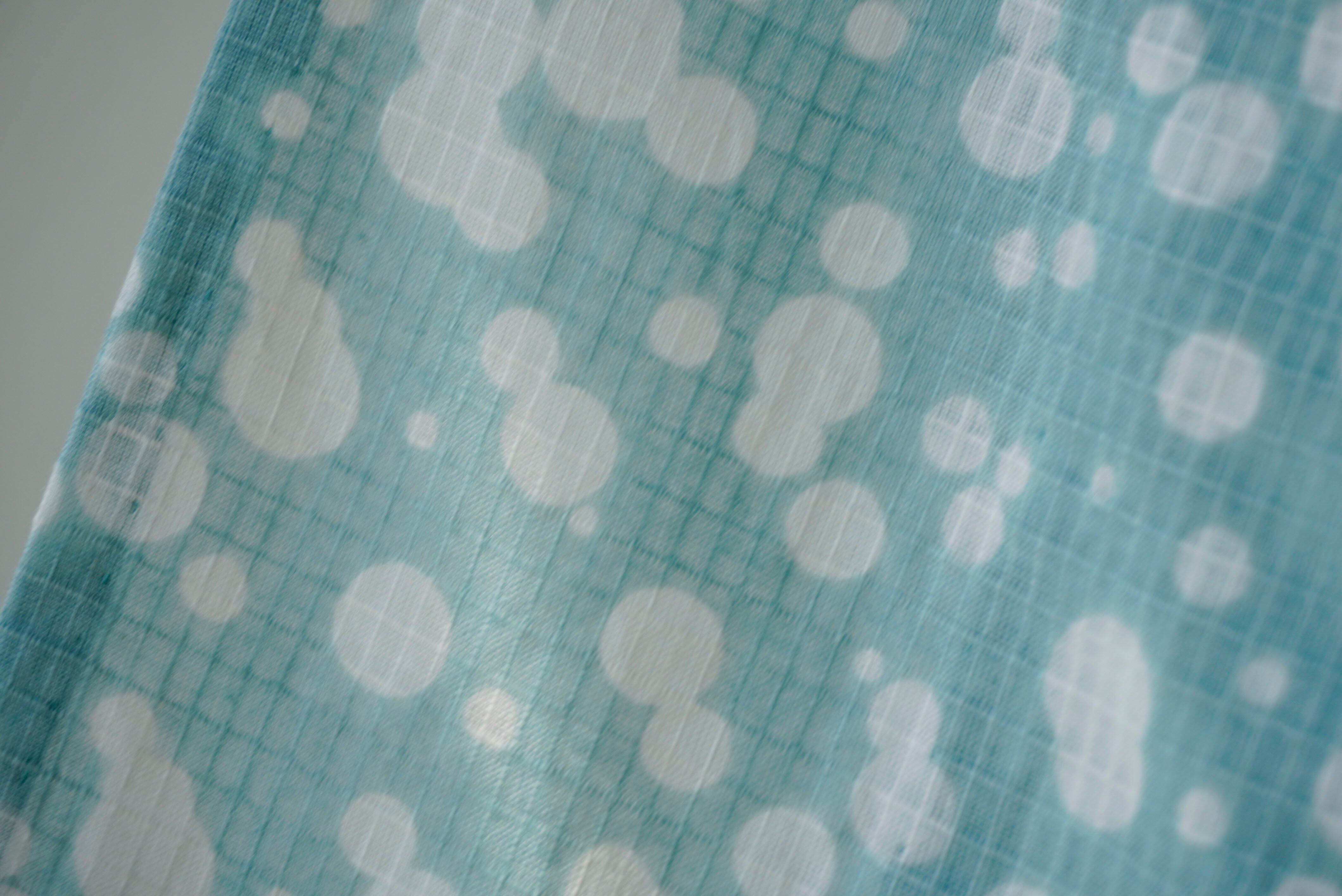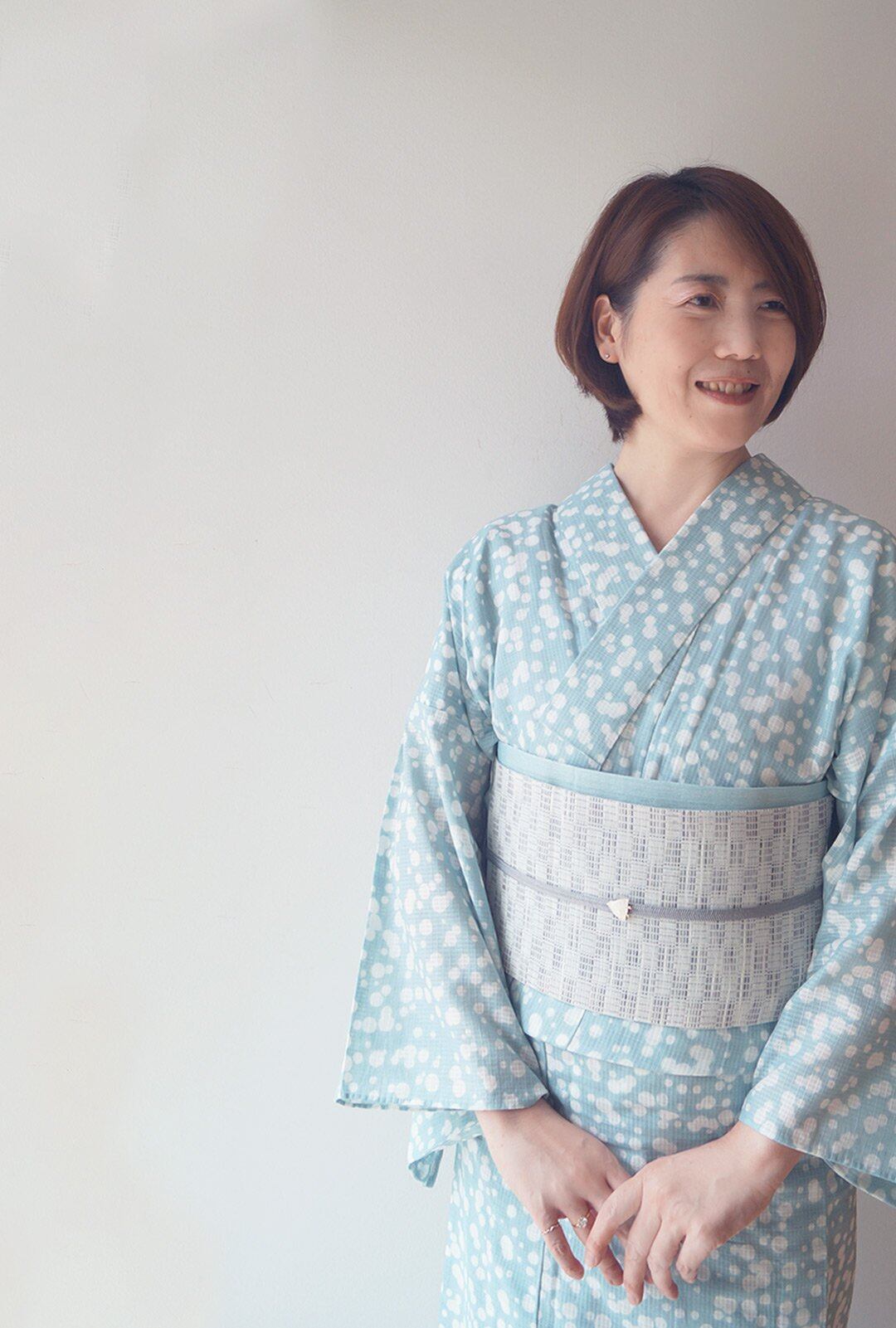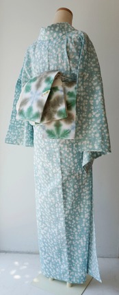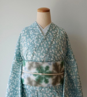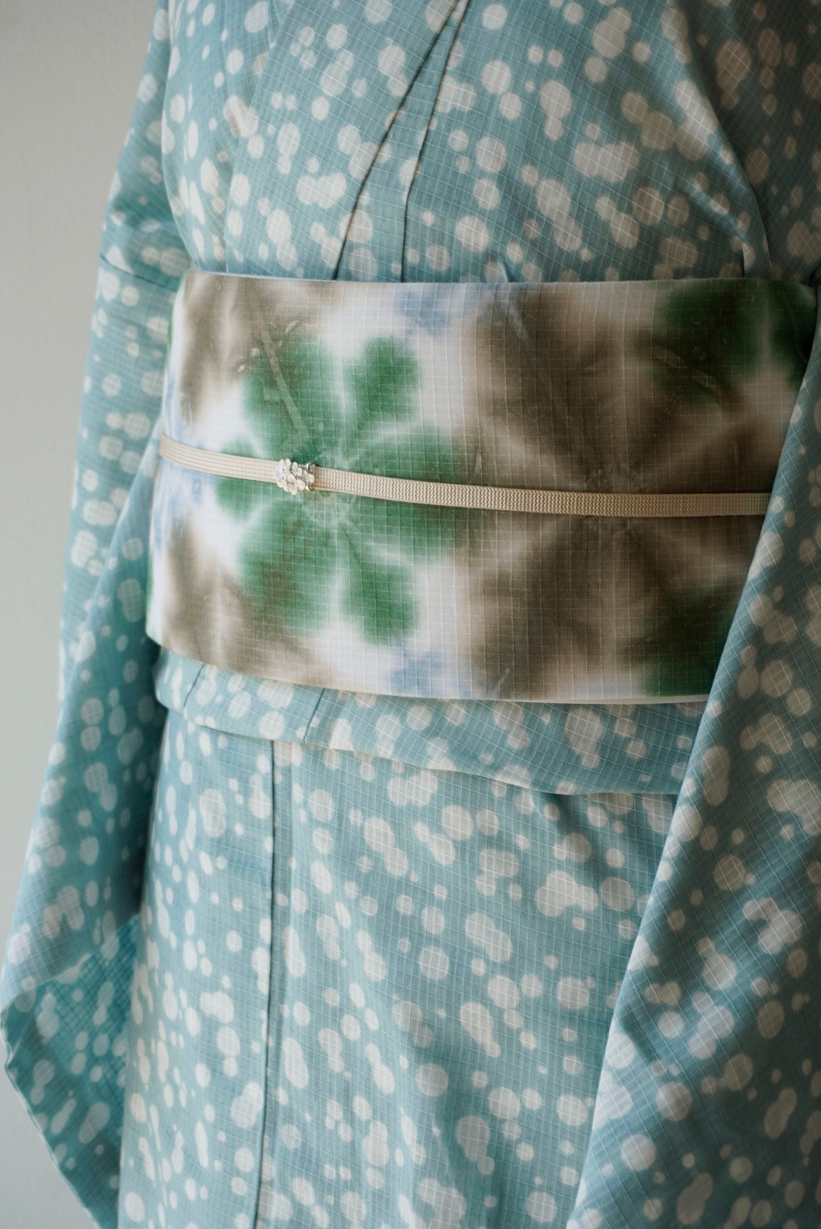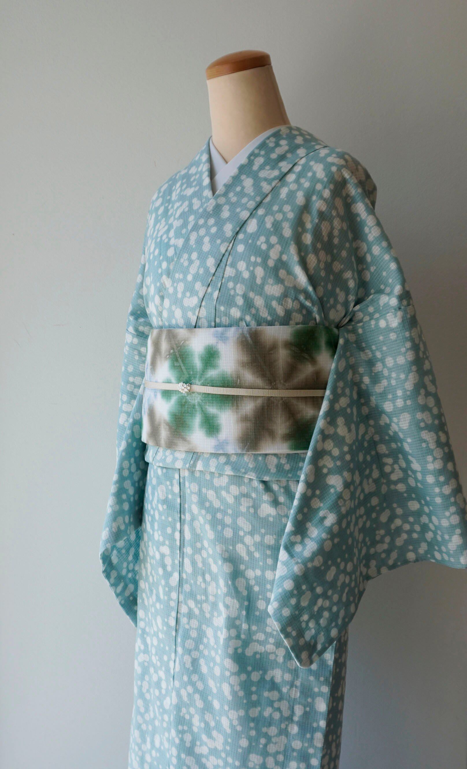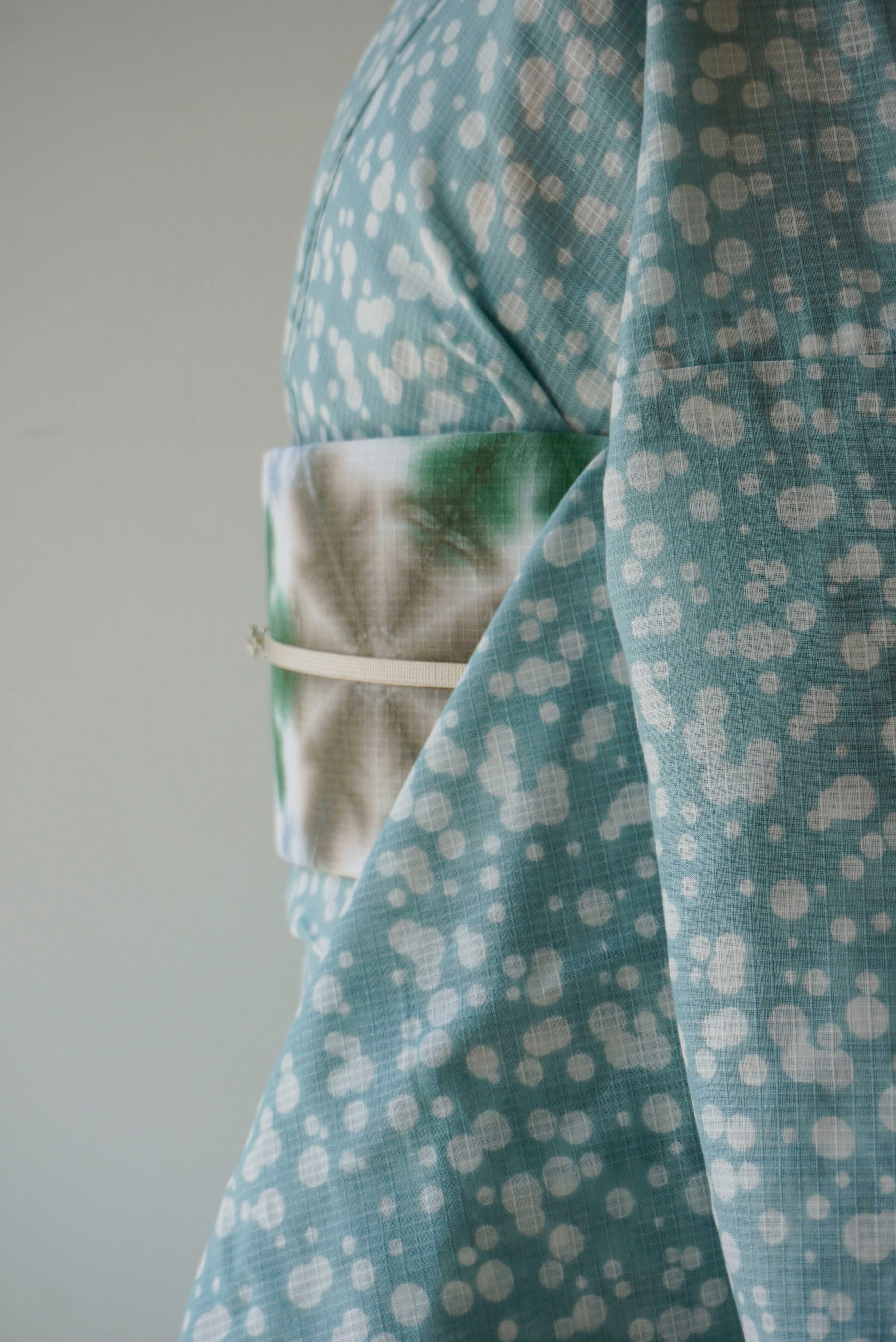 【浴衣】小千谷織物 綿麻紅梅 越後型染浴衣 白群色水玉文