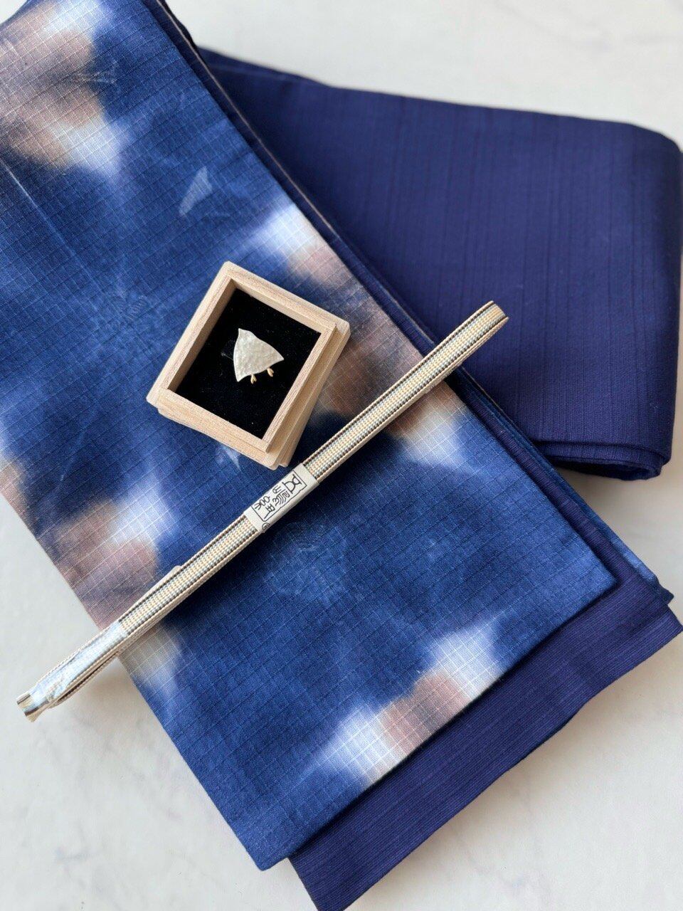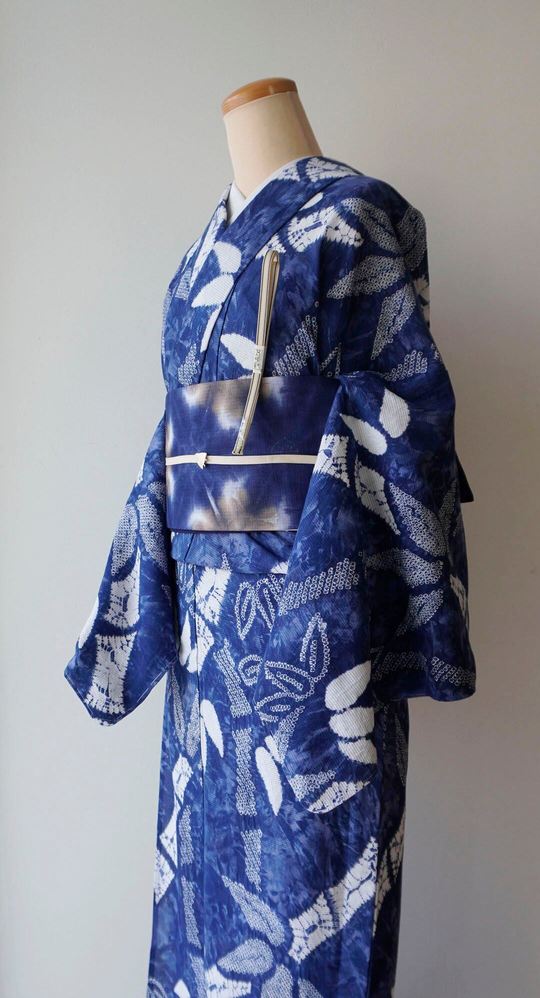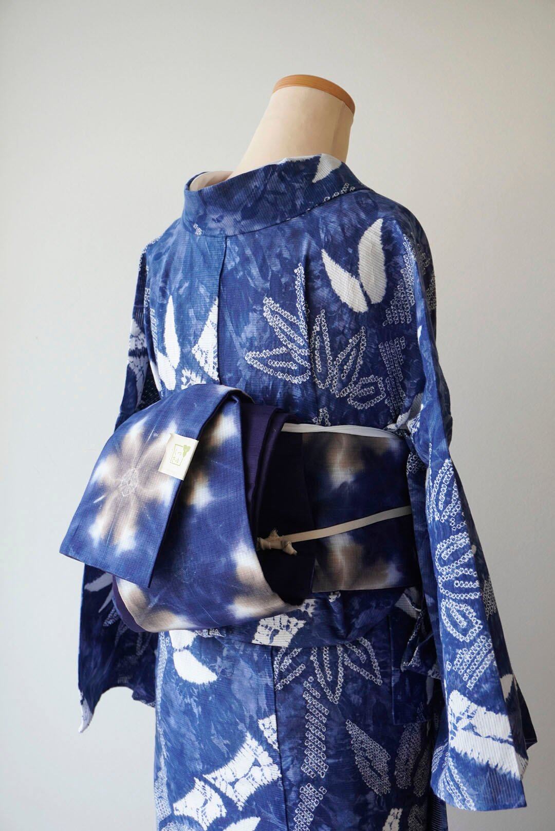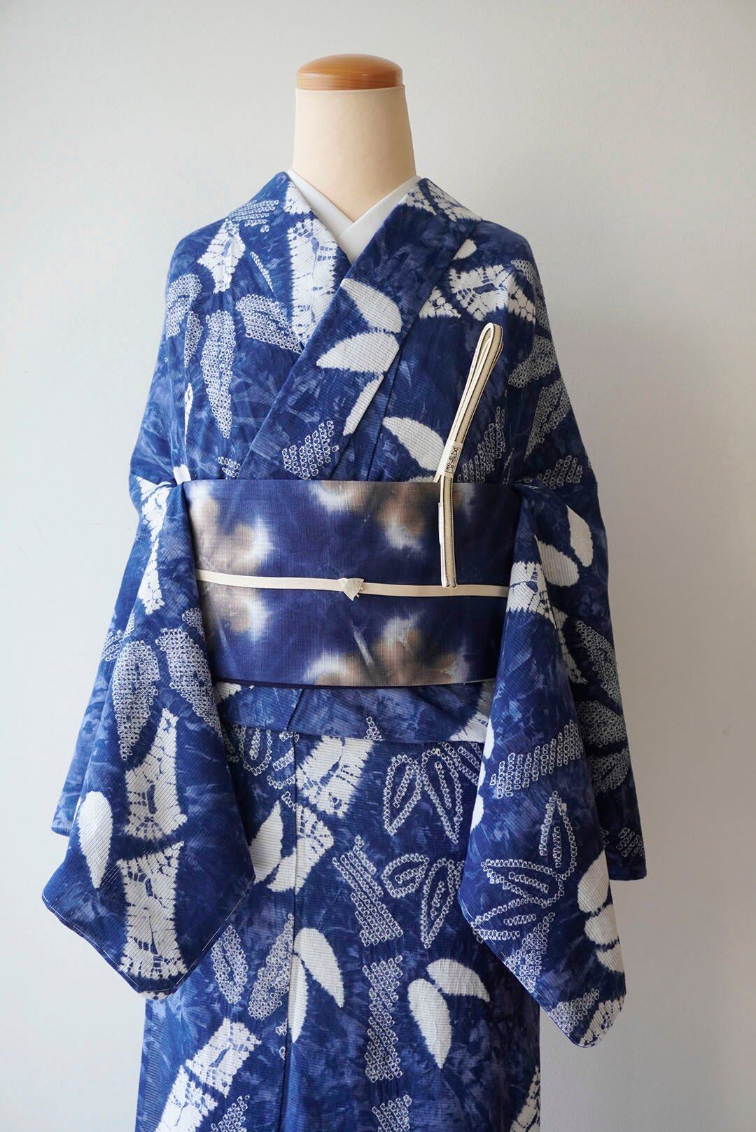 【つゆくさ・半幅帯】濃藍×遠州茶色 雪花絞り半幅帯 No.240725A