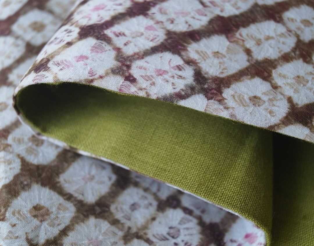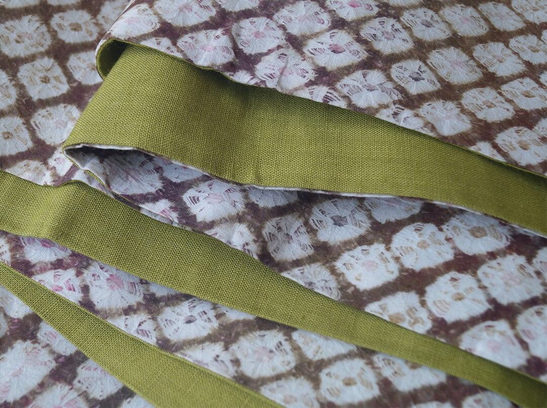【半幅帯】紅檜皮×萌黄 蜘蛛絞り リバーシブル 綿麻半幅帯