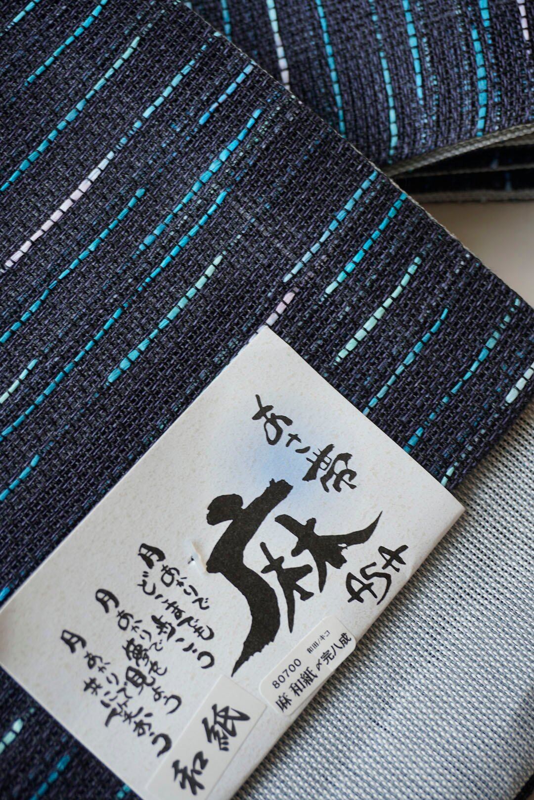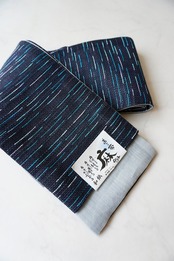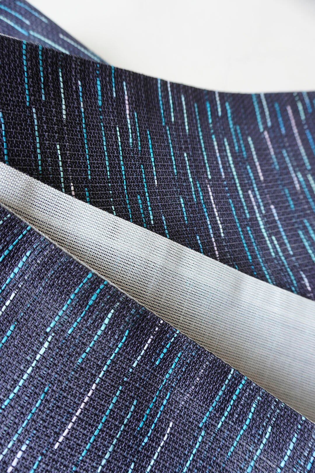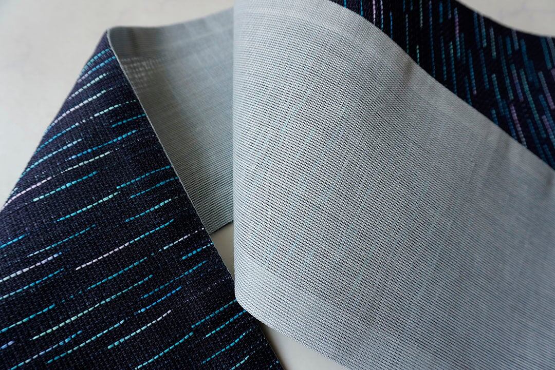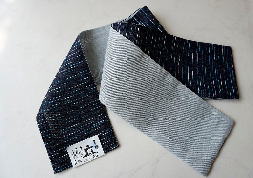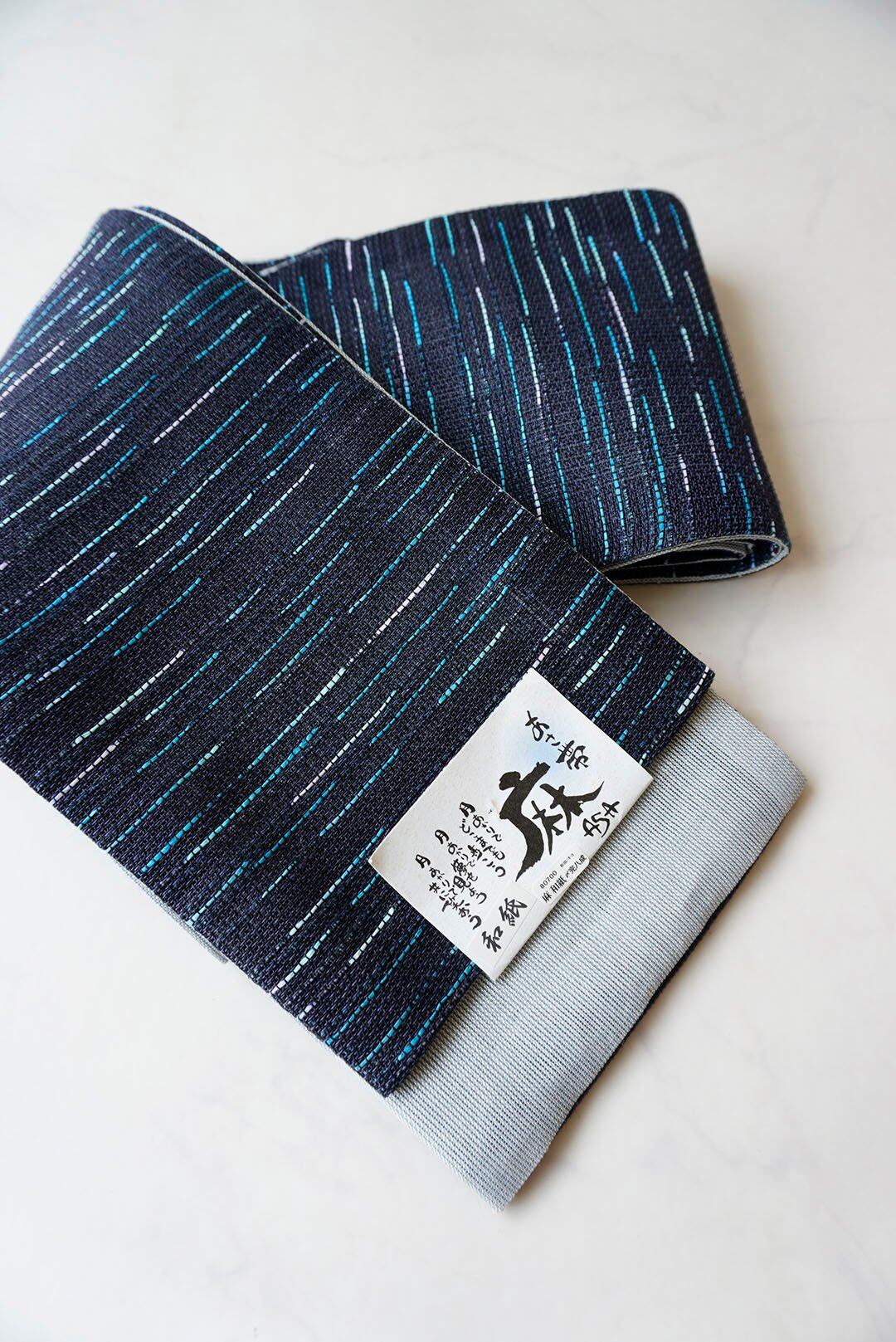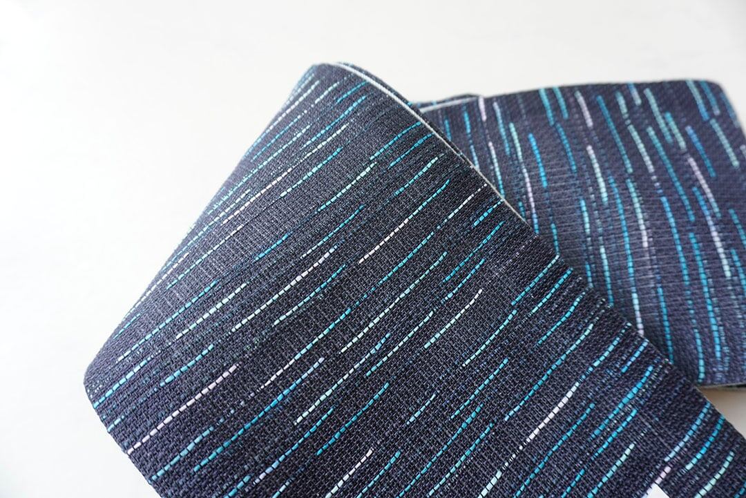 【半幅帯】紺色×白×青 織り柄リバーシブル麻半幅帯 240708①