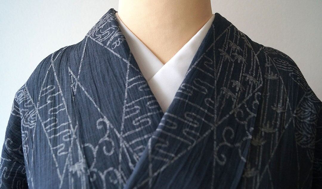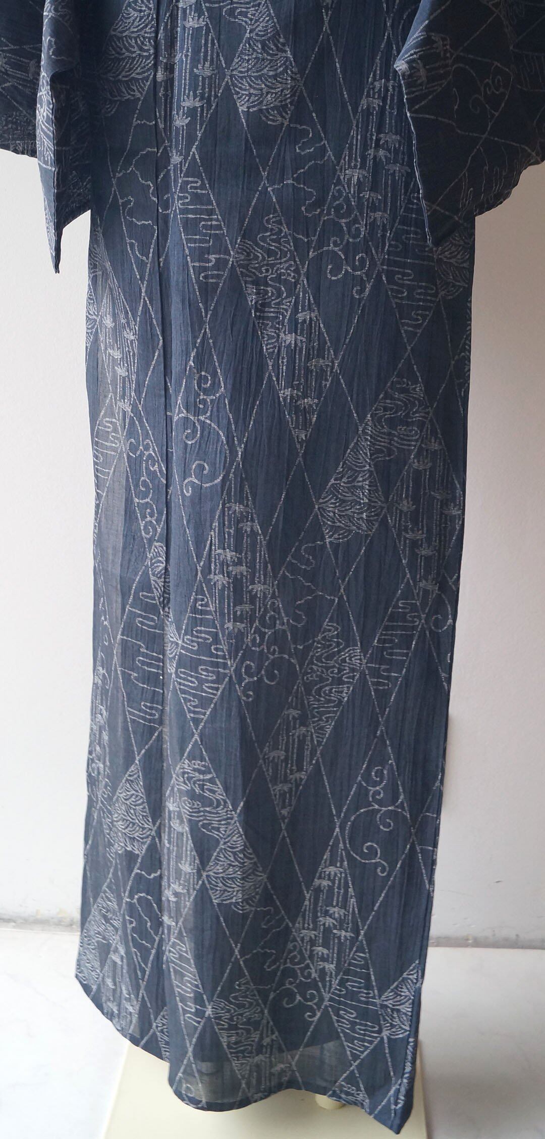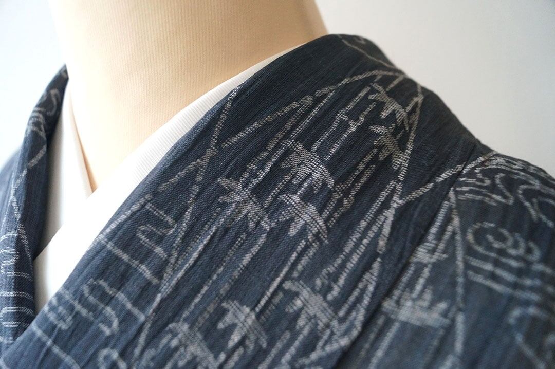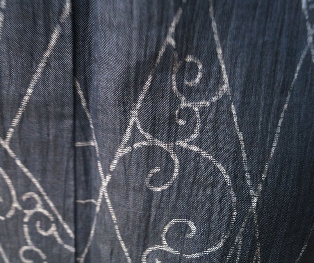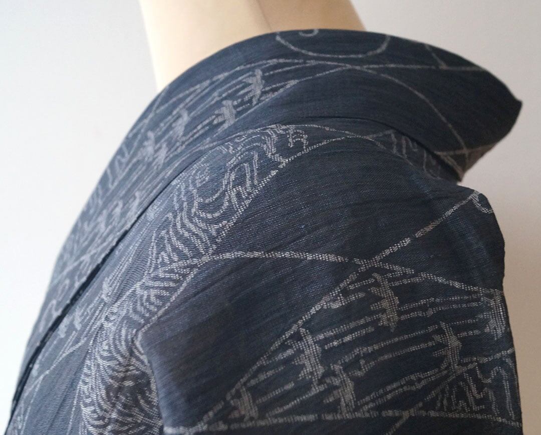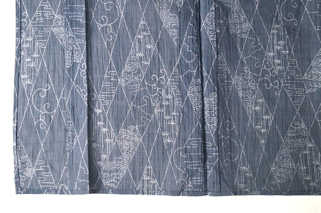 【夏・麻】ゆとりサイズ 錆鉄御納戸色 変わり菱文と風景文様 本場小千谷縮 証紙付き