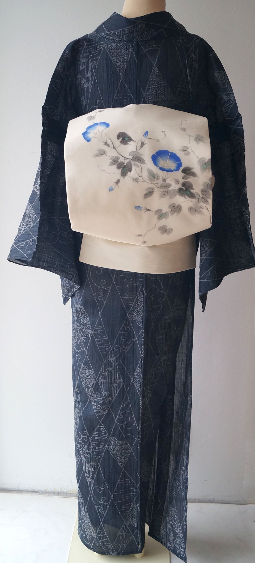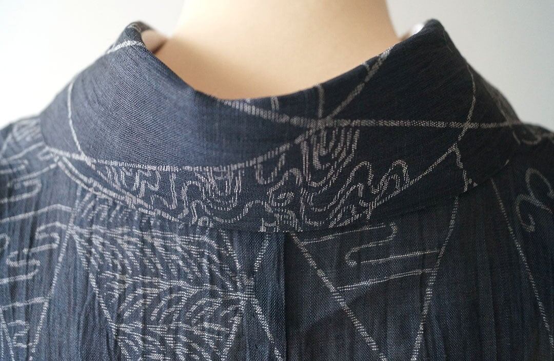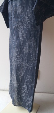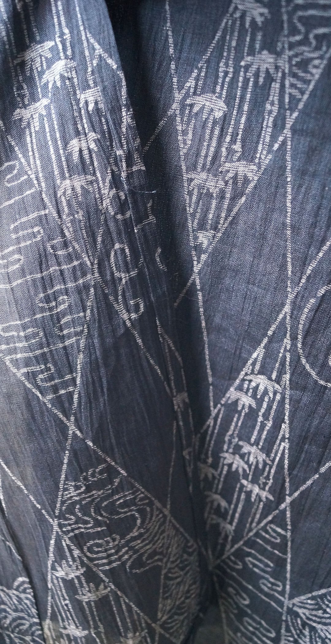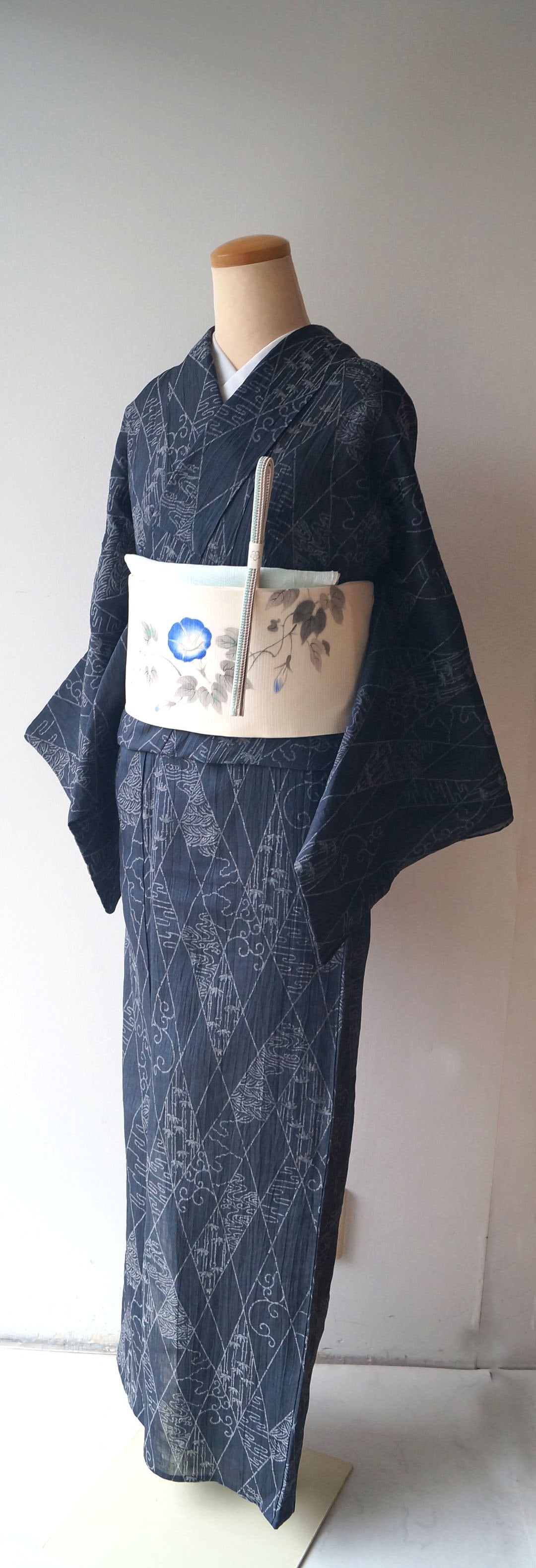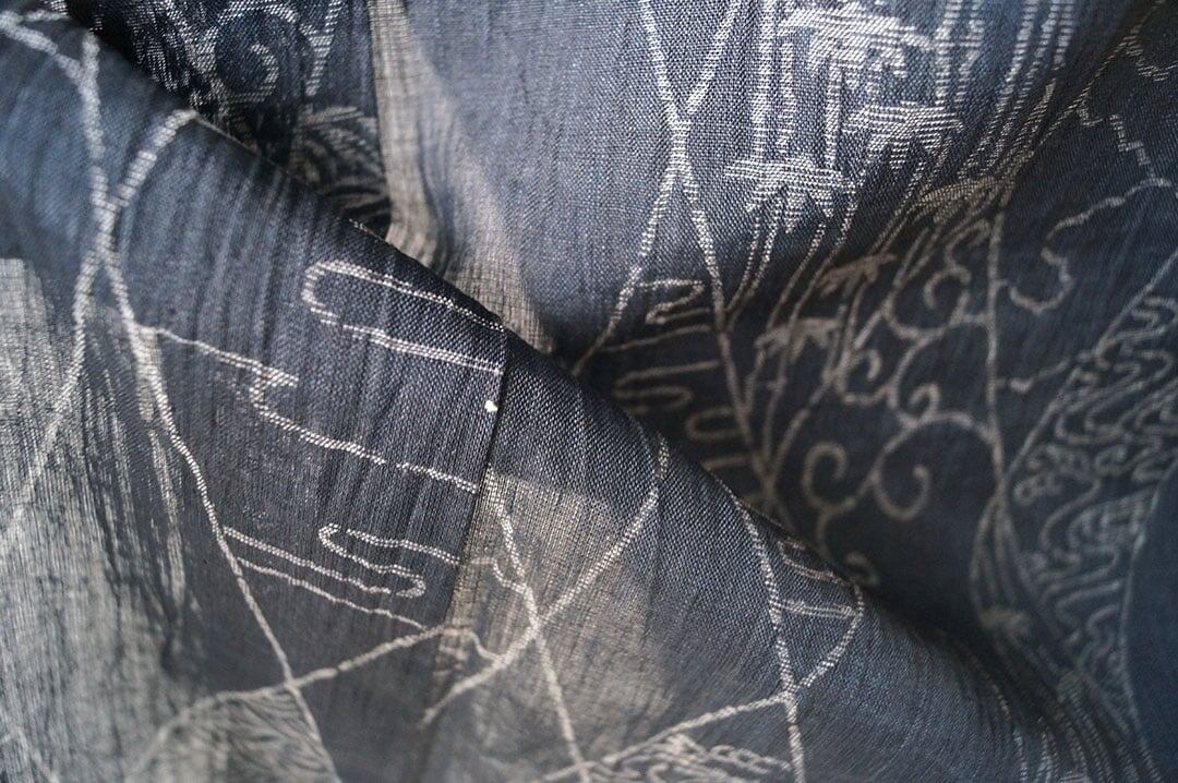 【夏・麻】ゆとりサイズ 錆鉄御納戸色 変わり菱文と風景文様 本場小千谷縮 証紙付き