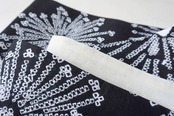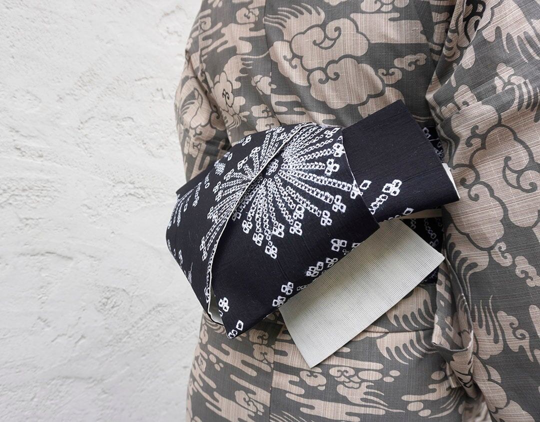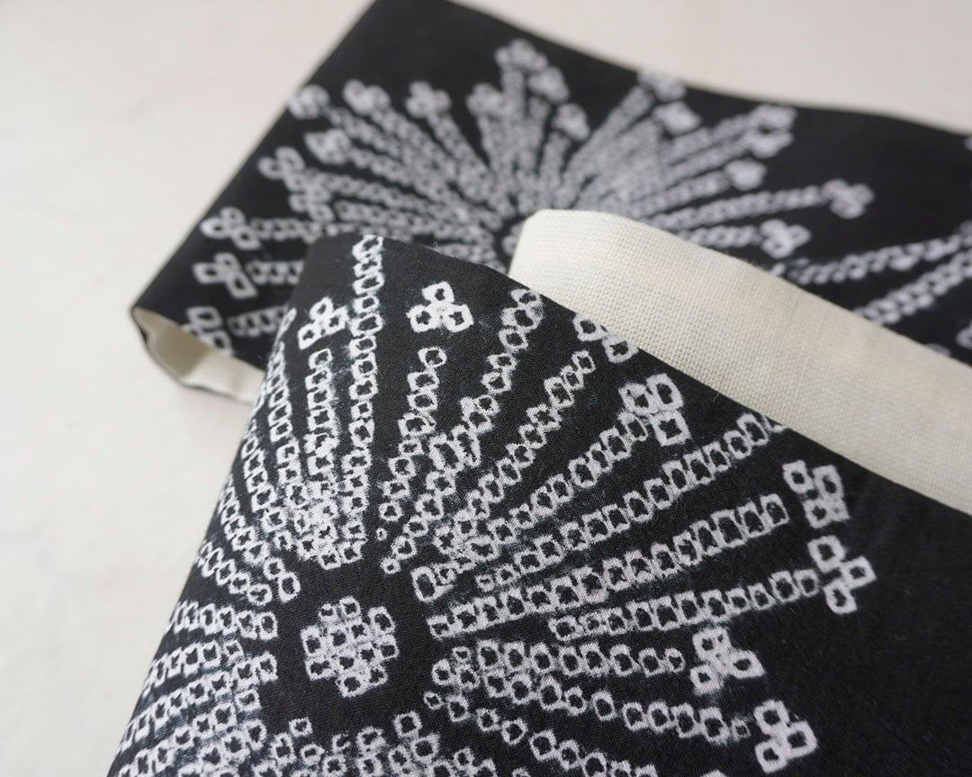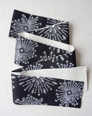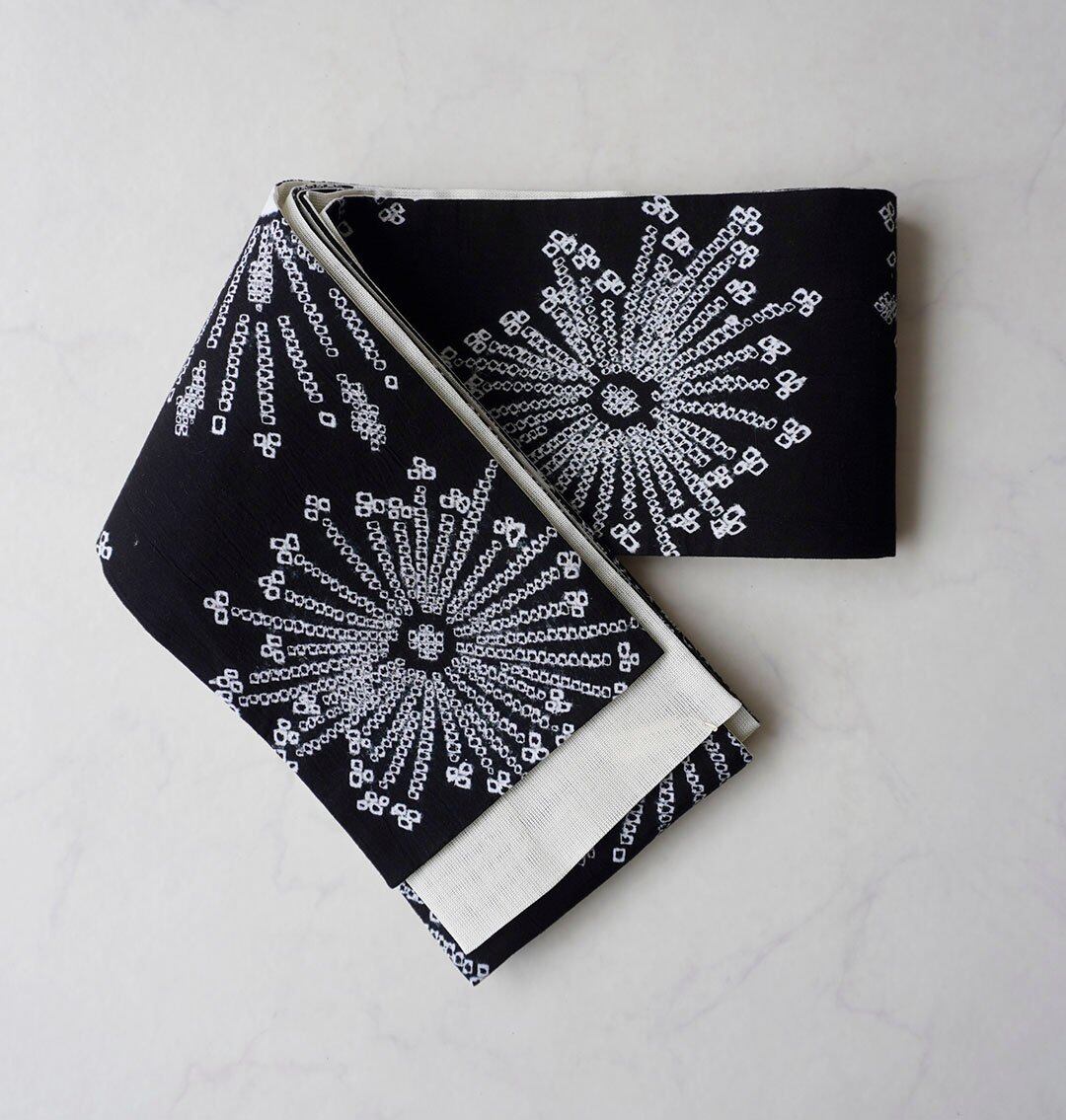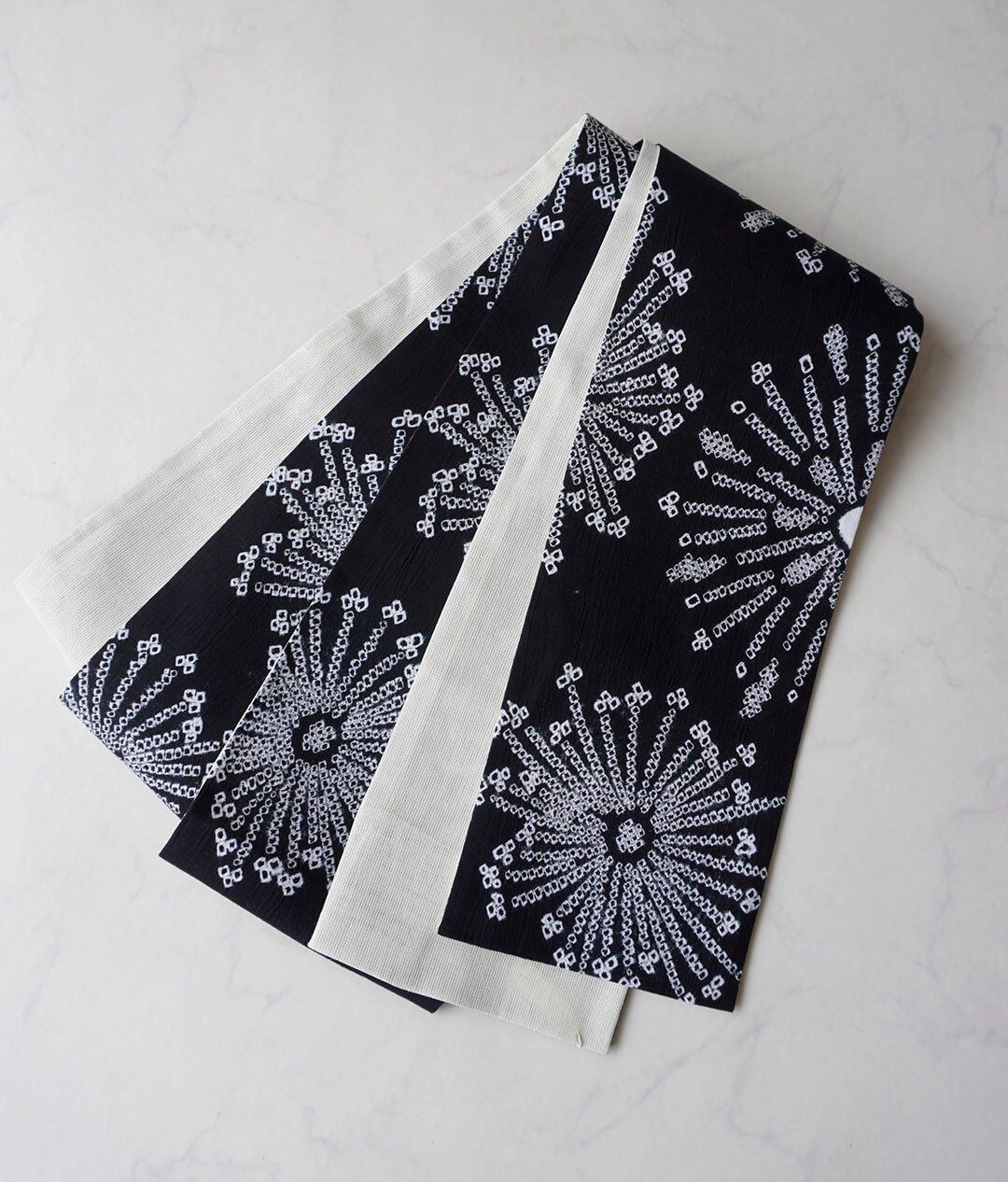 【半幅帯】黒×白 花文 手絞り半幅帯 No.2400610