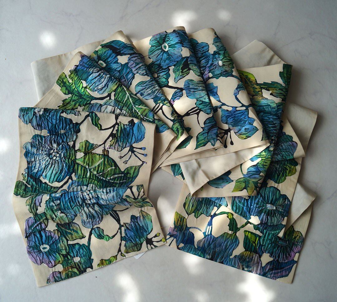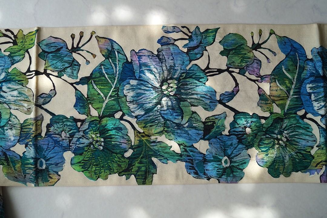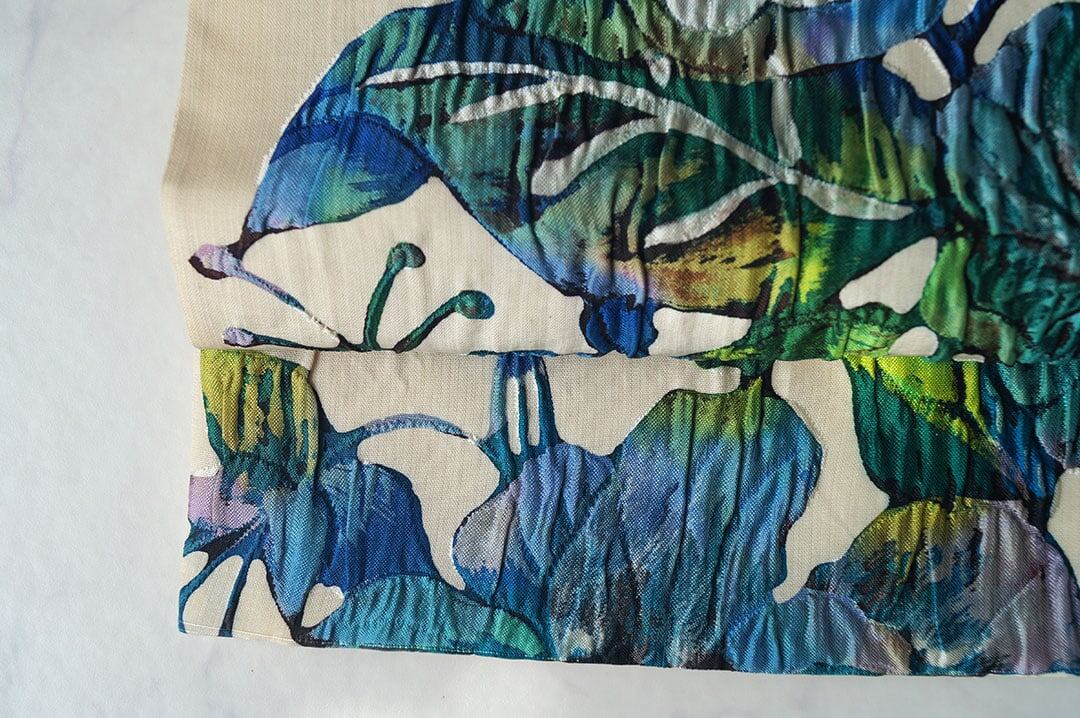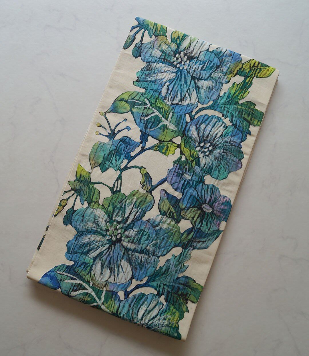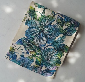 生成り地に寒色系の大花柄が