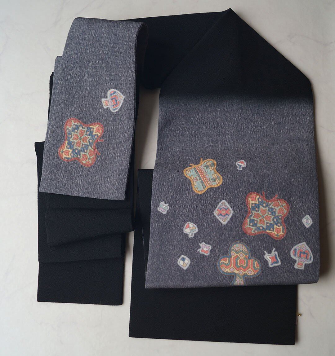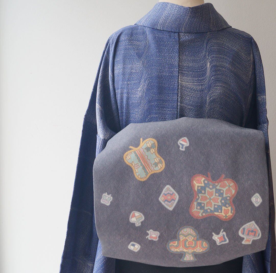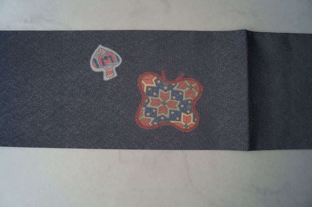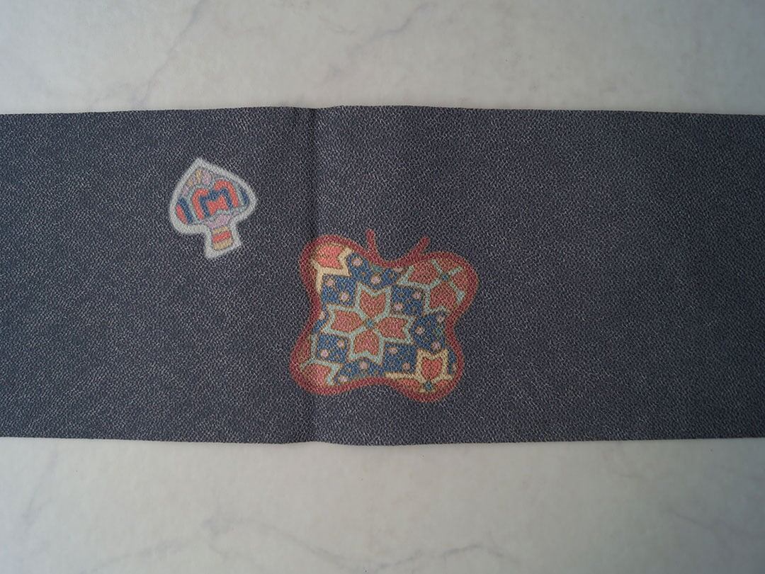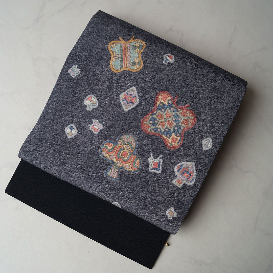 【なごや帯】濃鼠色系 蝶やトランプ柄に幾何学文 なごや帯