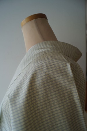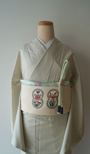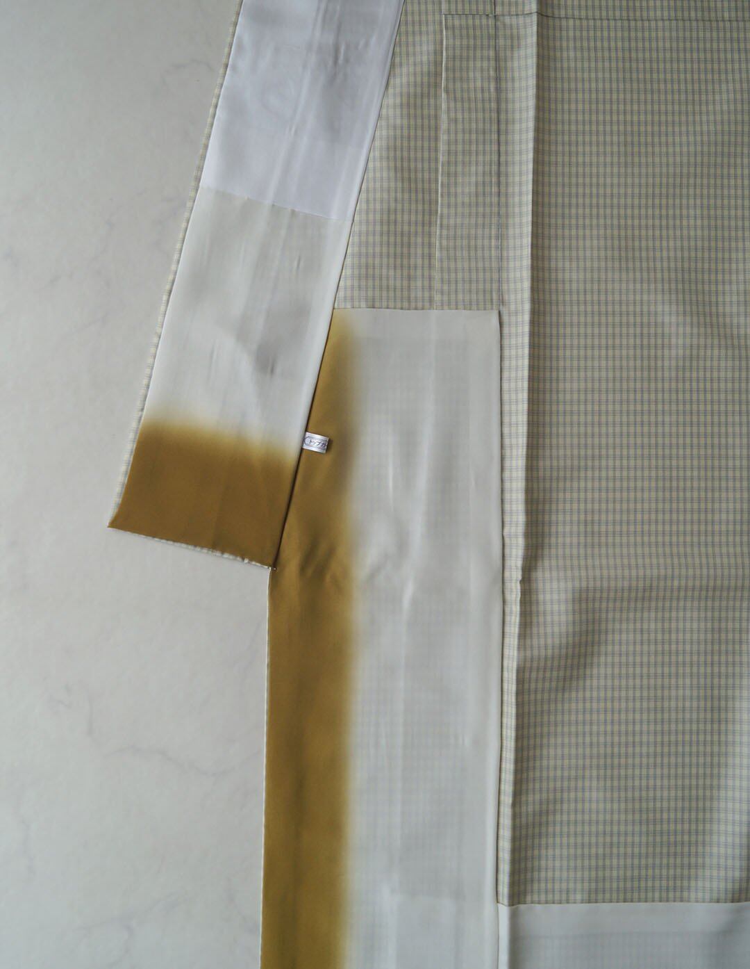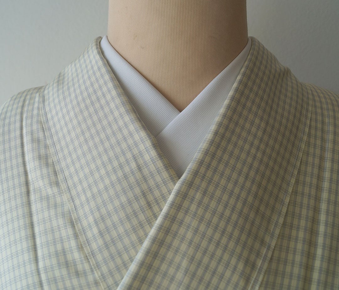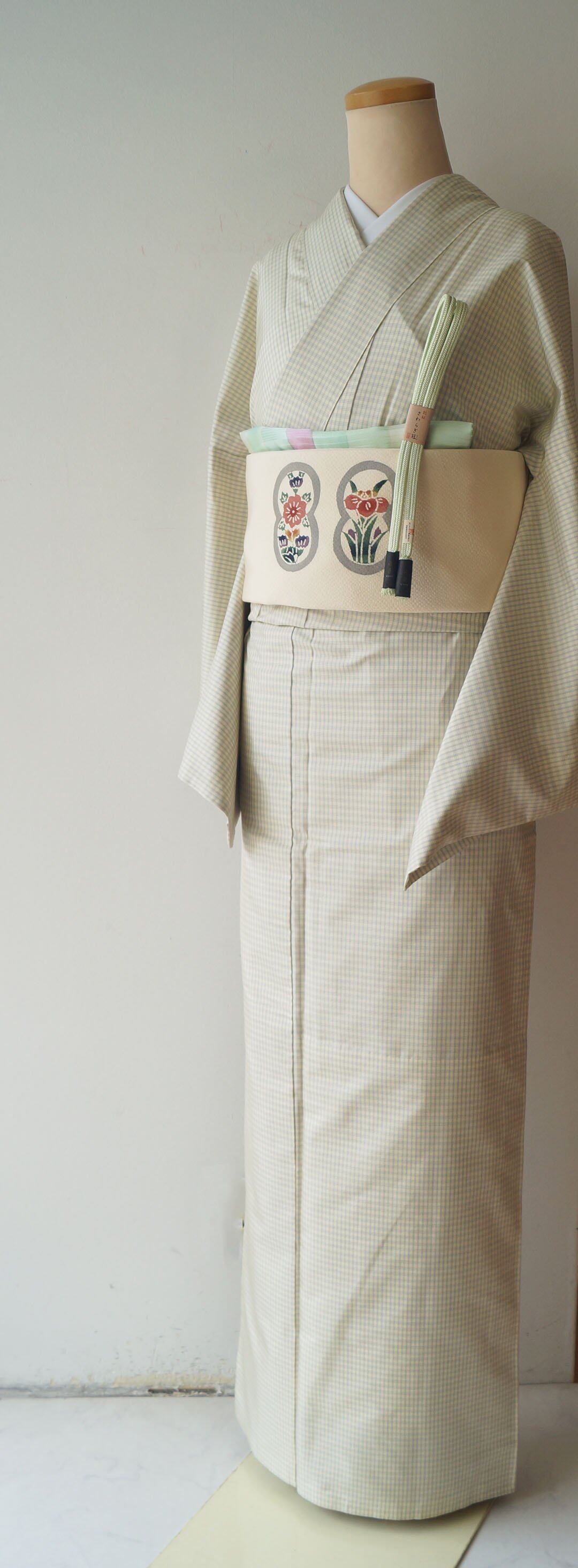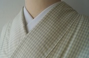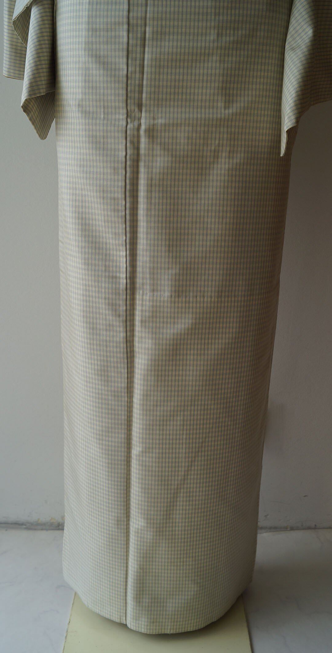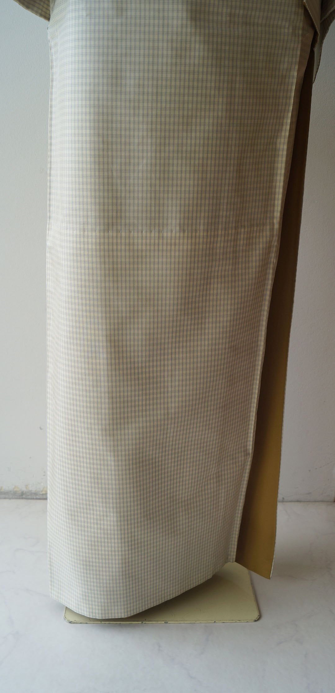 【袷】ゆとりサイズ 生成り色 変わり格子文 大島紬 証紙あり