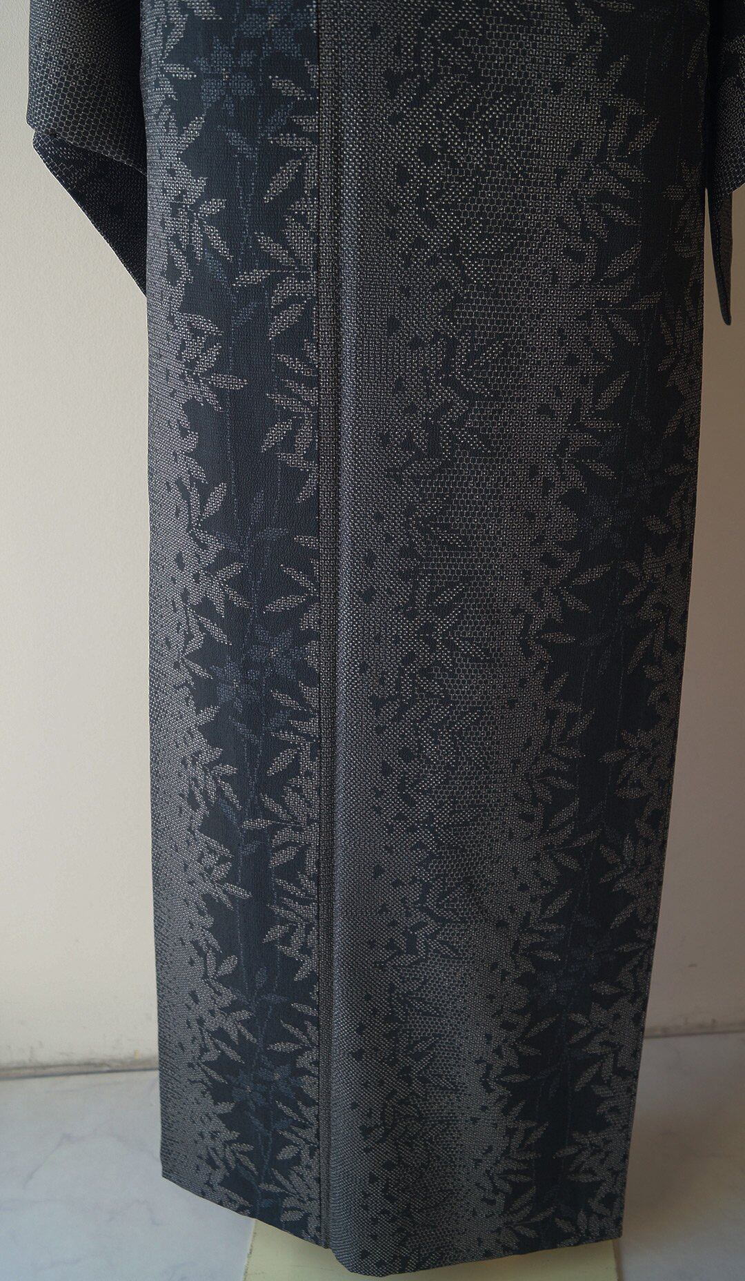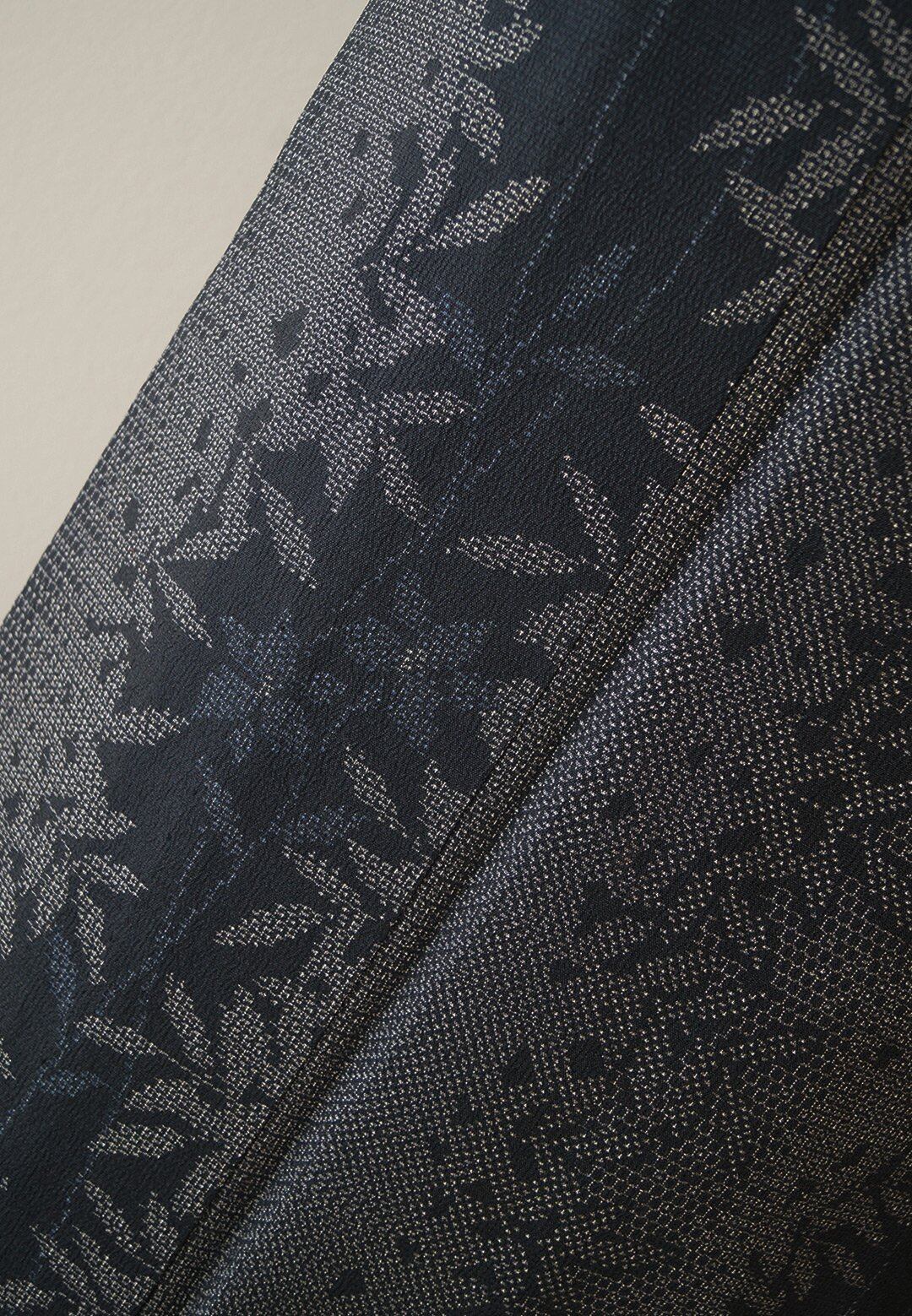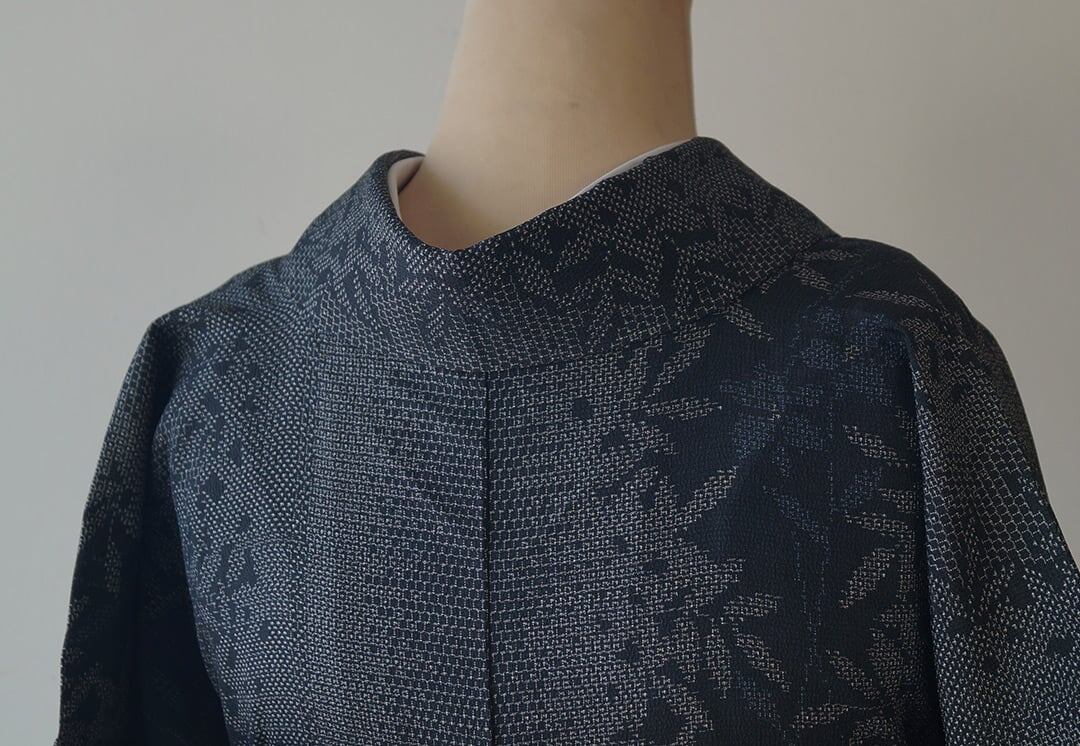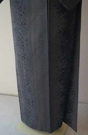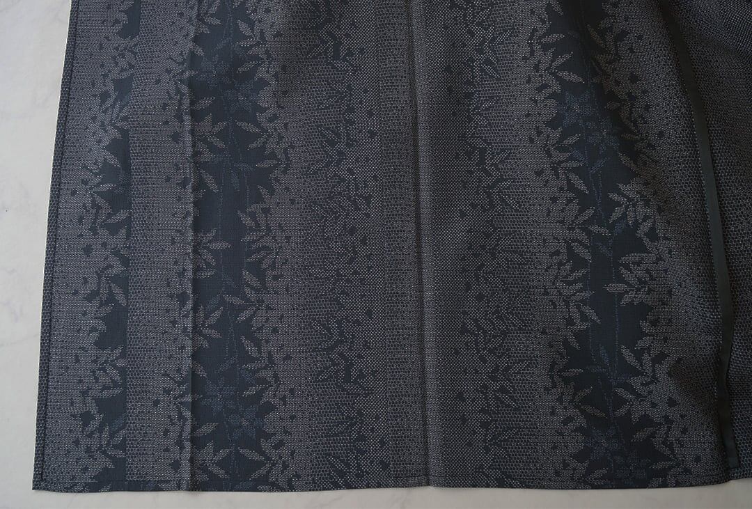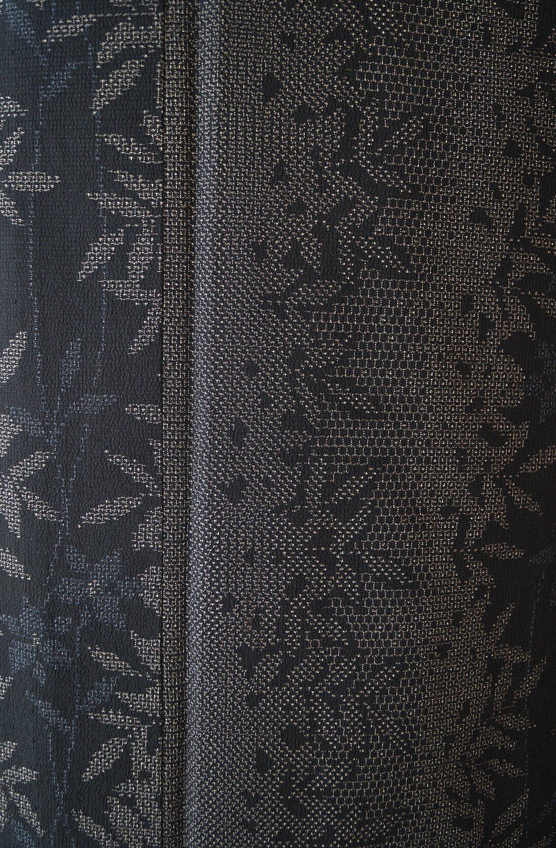 【単衣】濃紺地 植物文 本塩沢お召し 証紙付き
