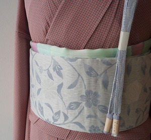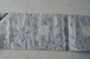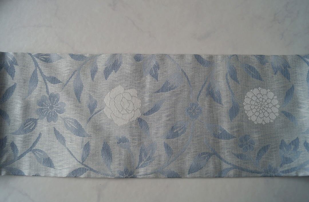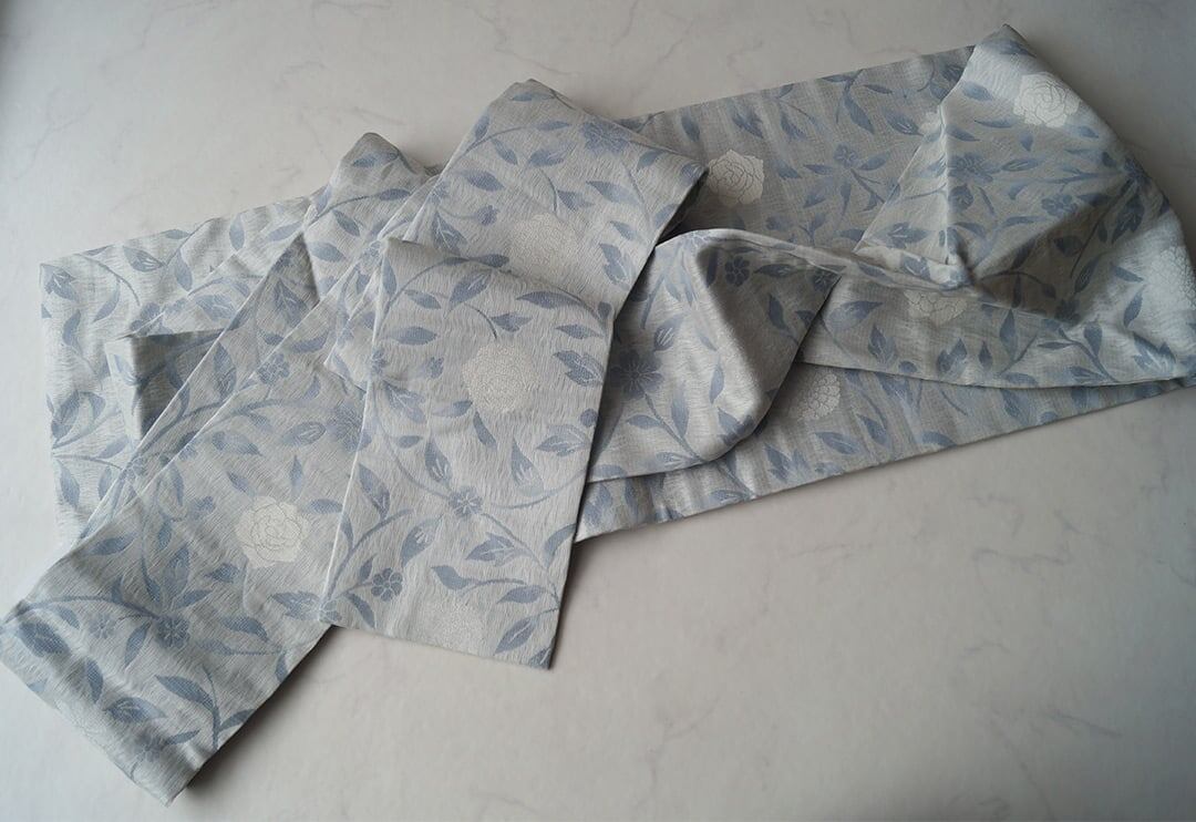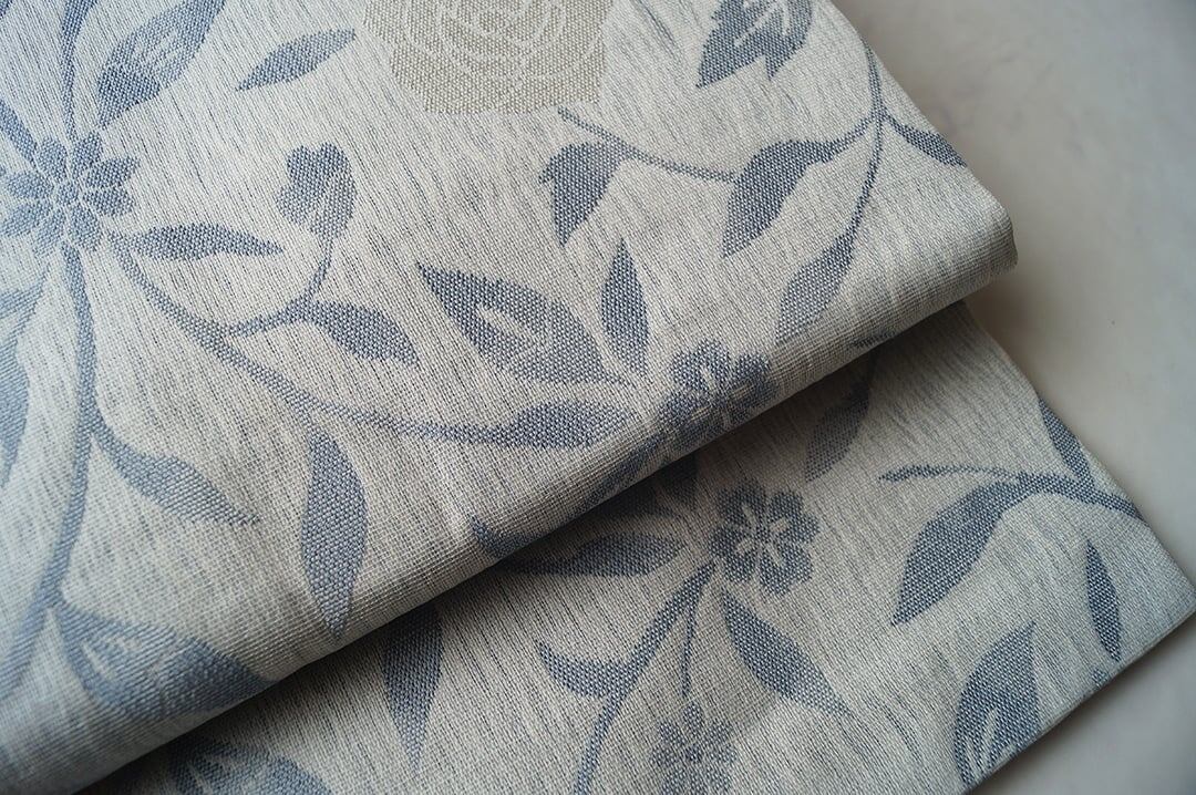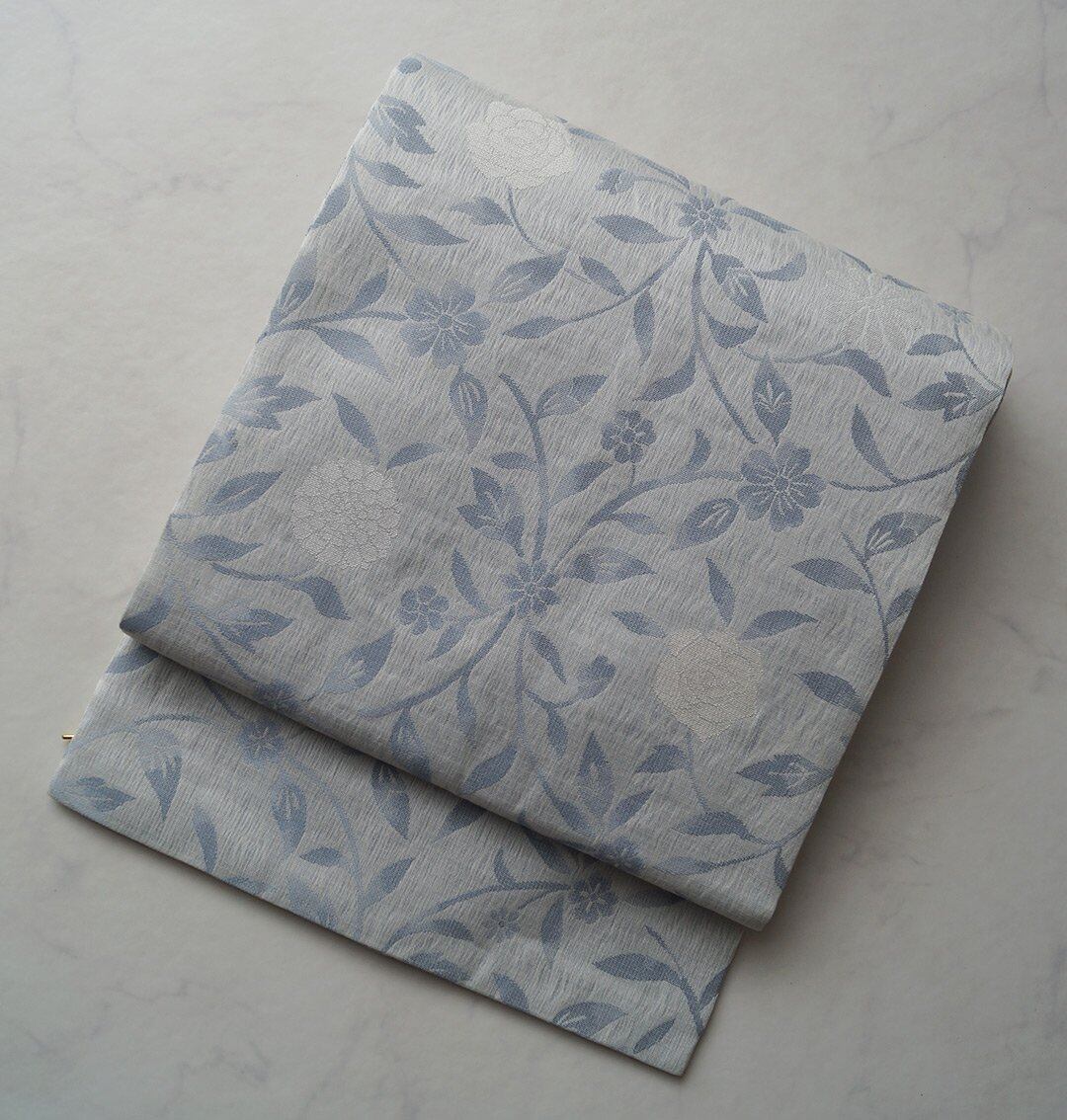 白灰色系の花唐草文のなごや帯です。