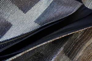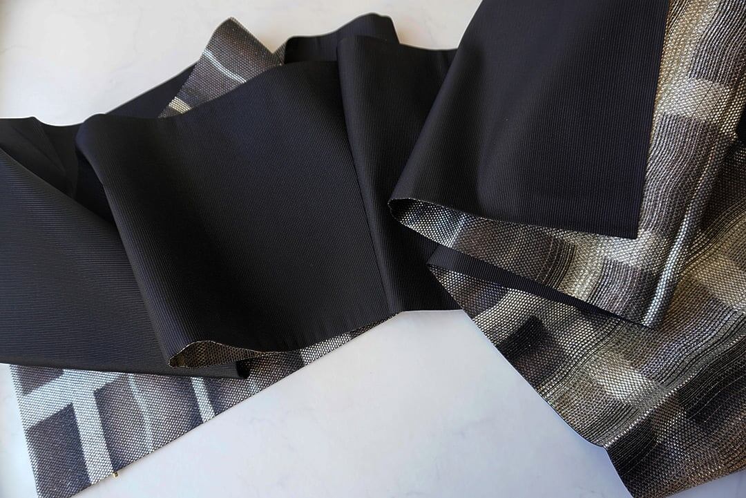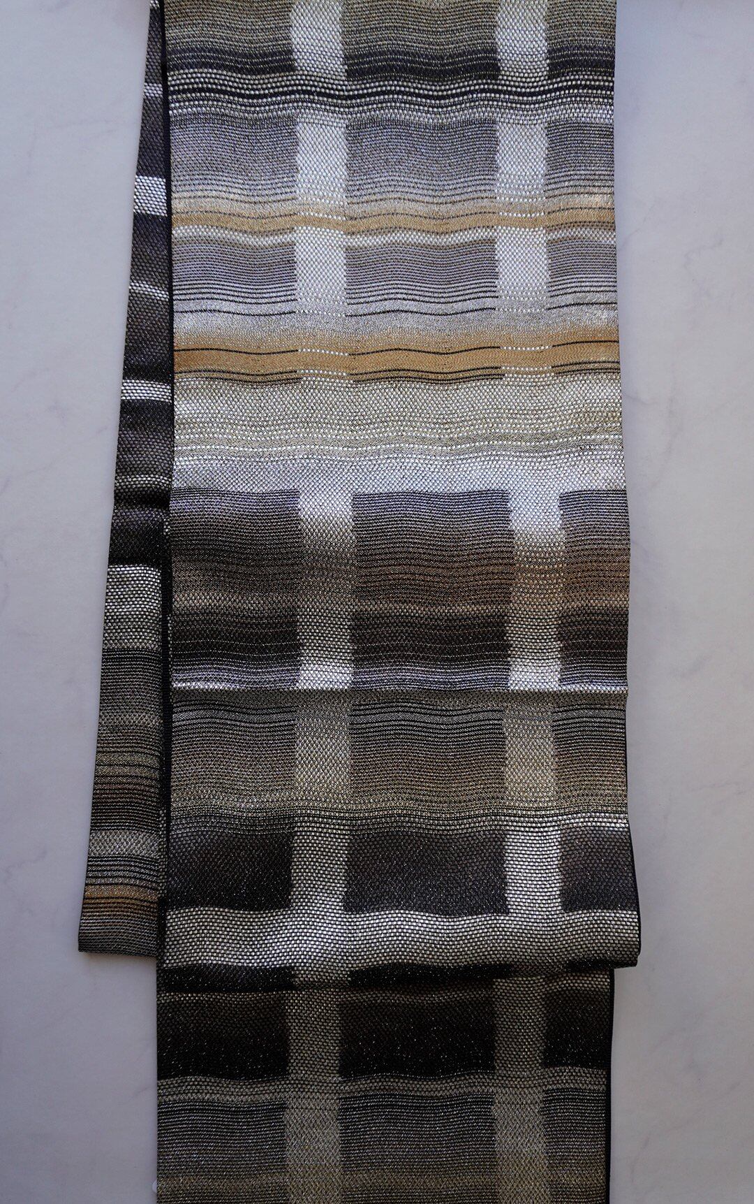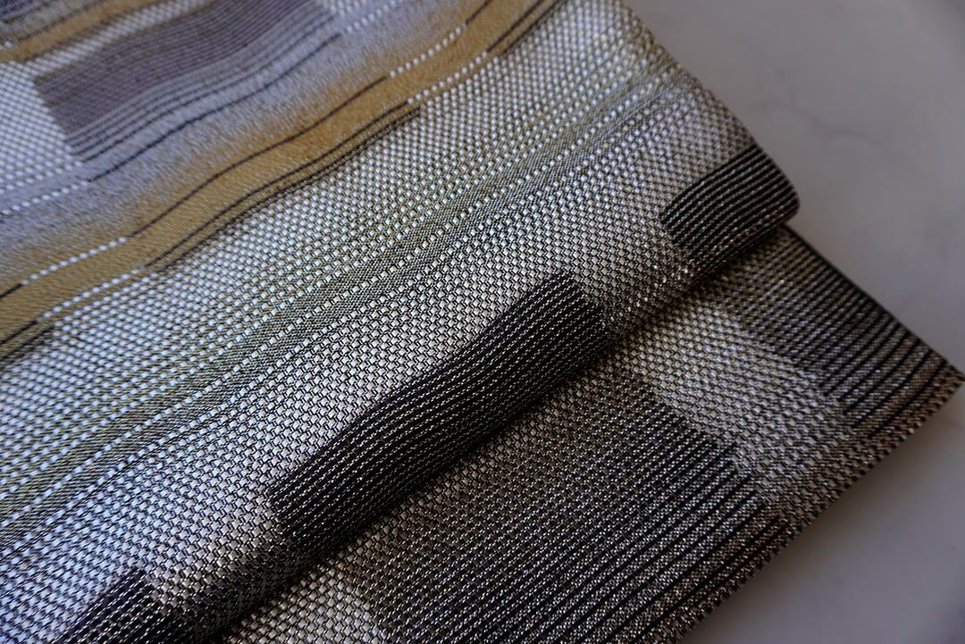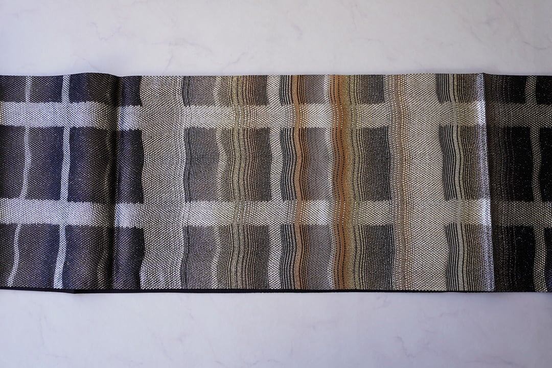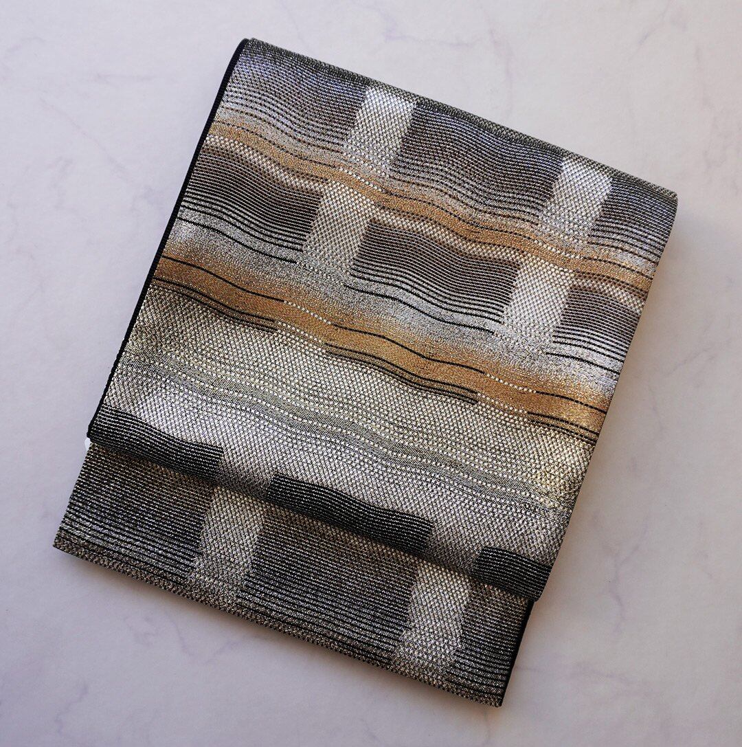 金、銀、黒の変わり格子のふくろ帯です。