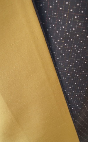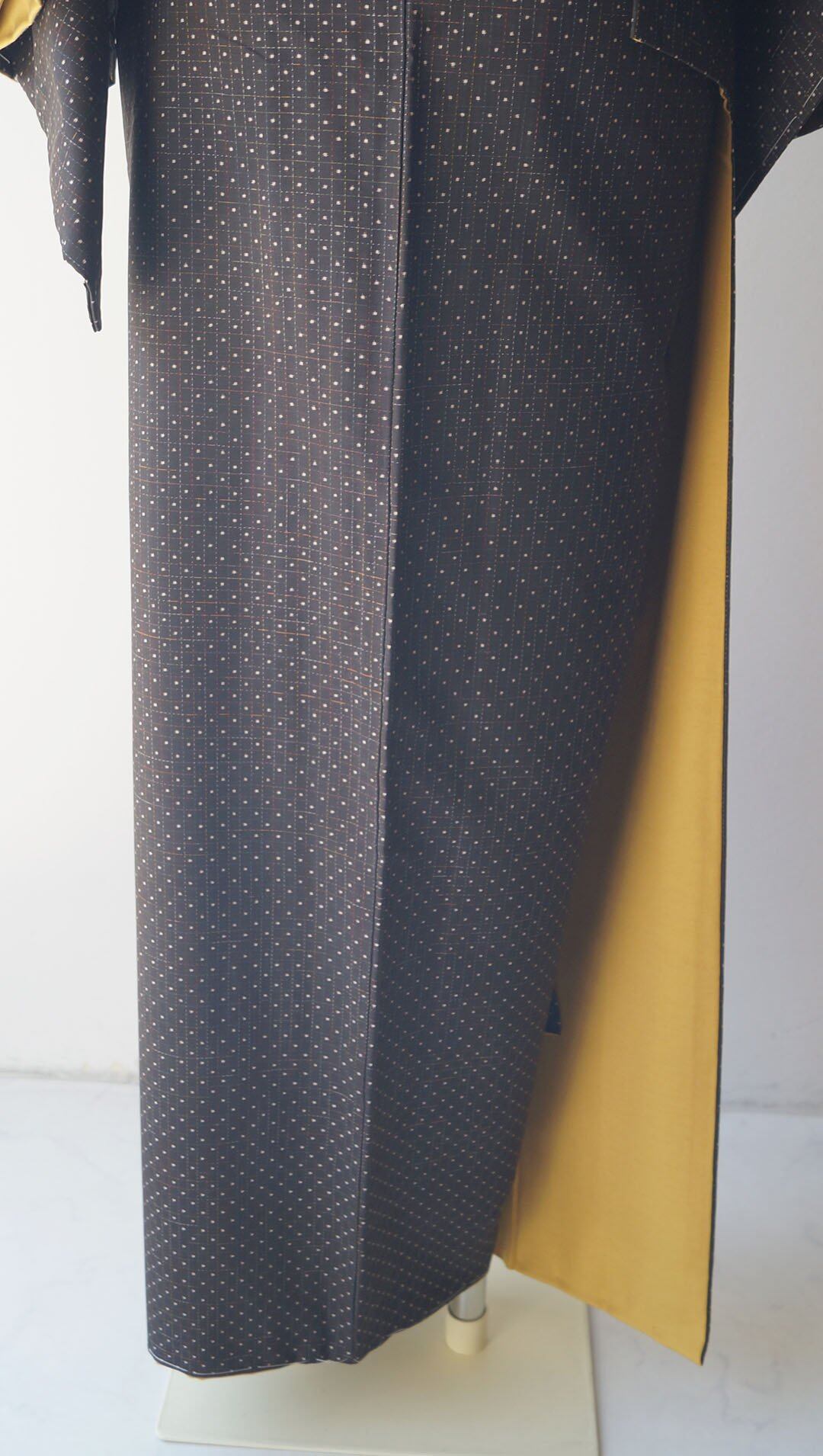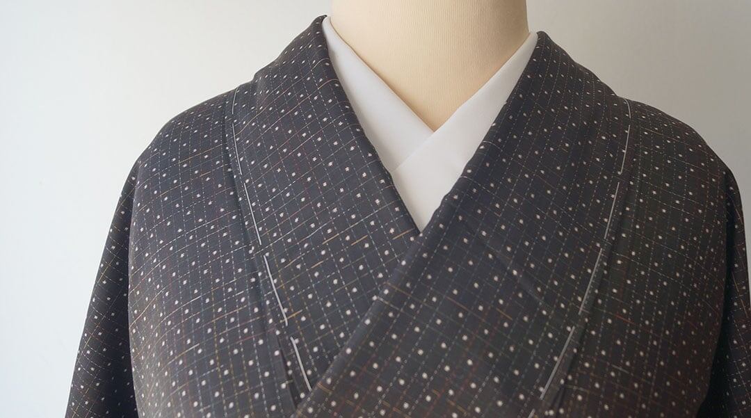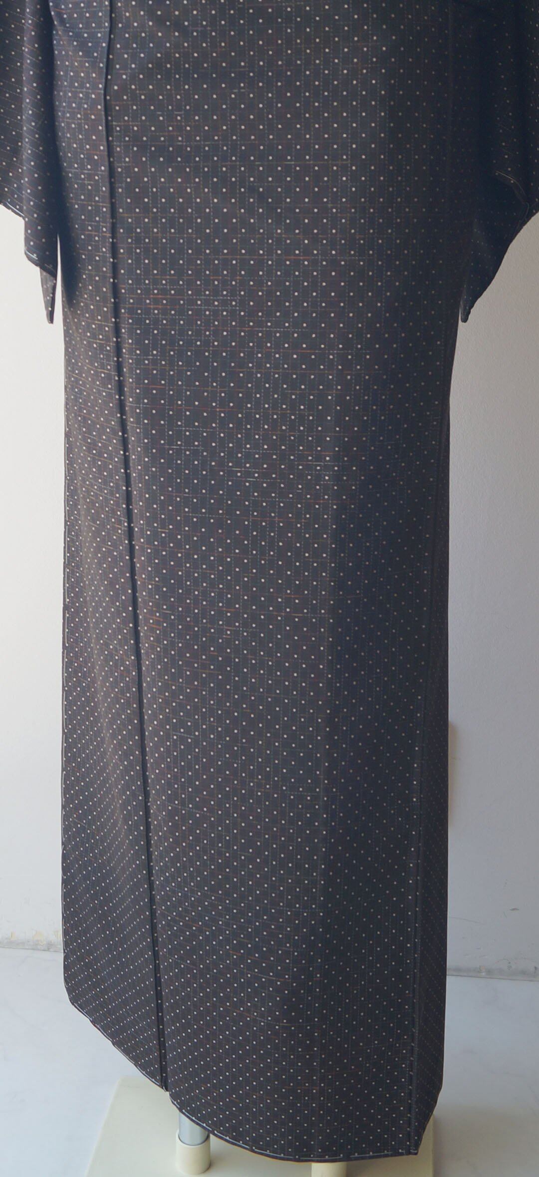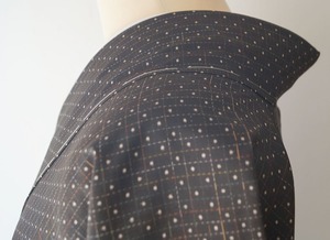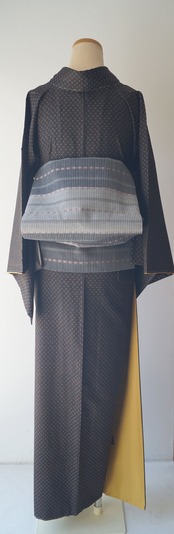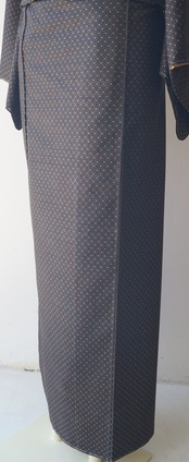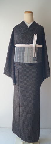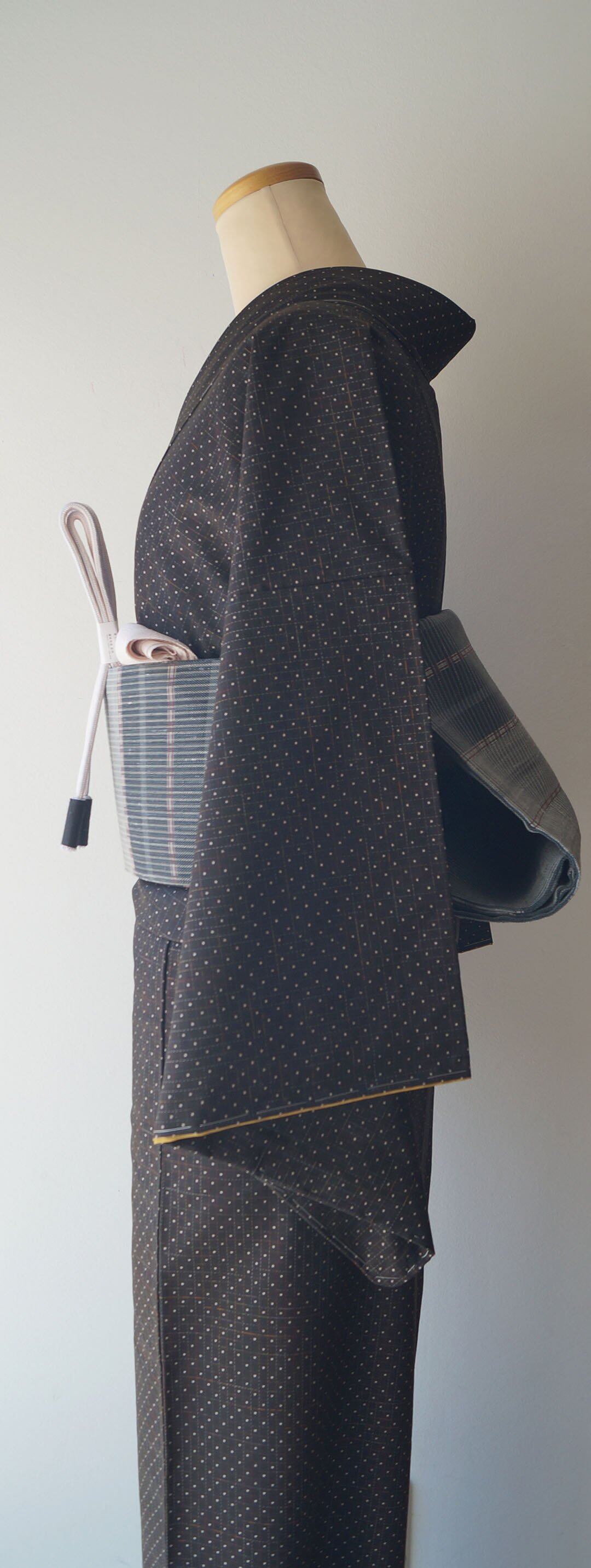黒茶地にドット絣文の大島紬です。
