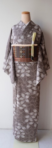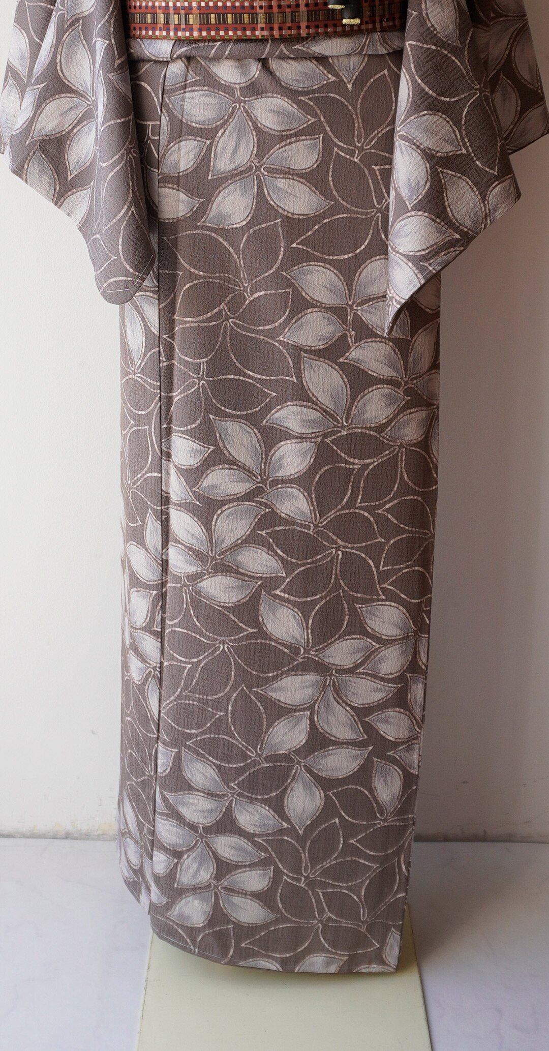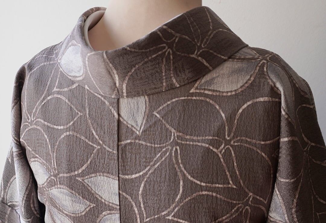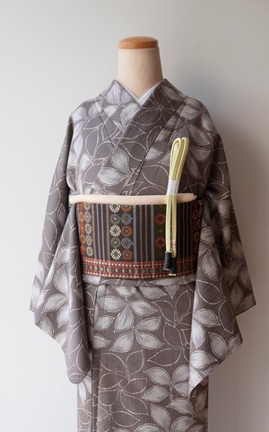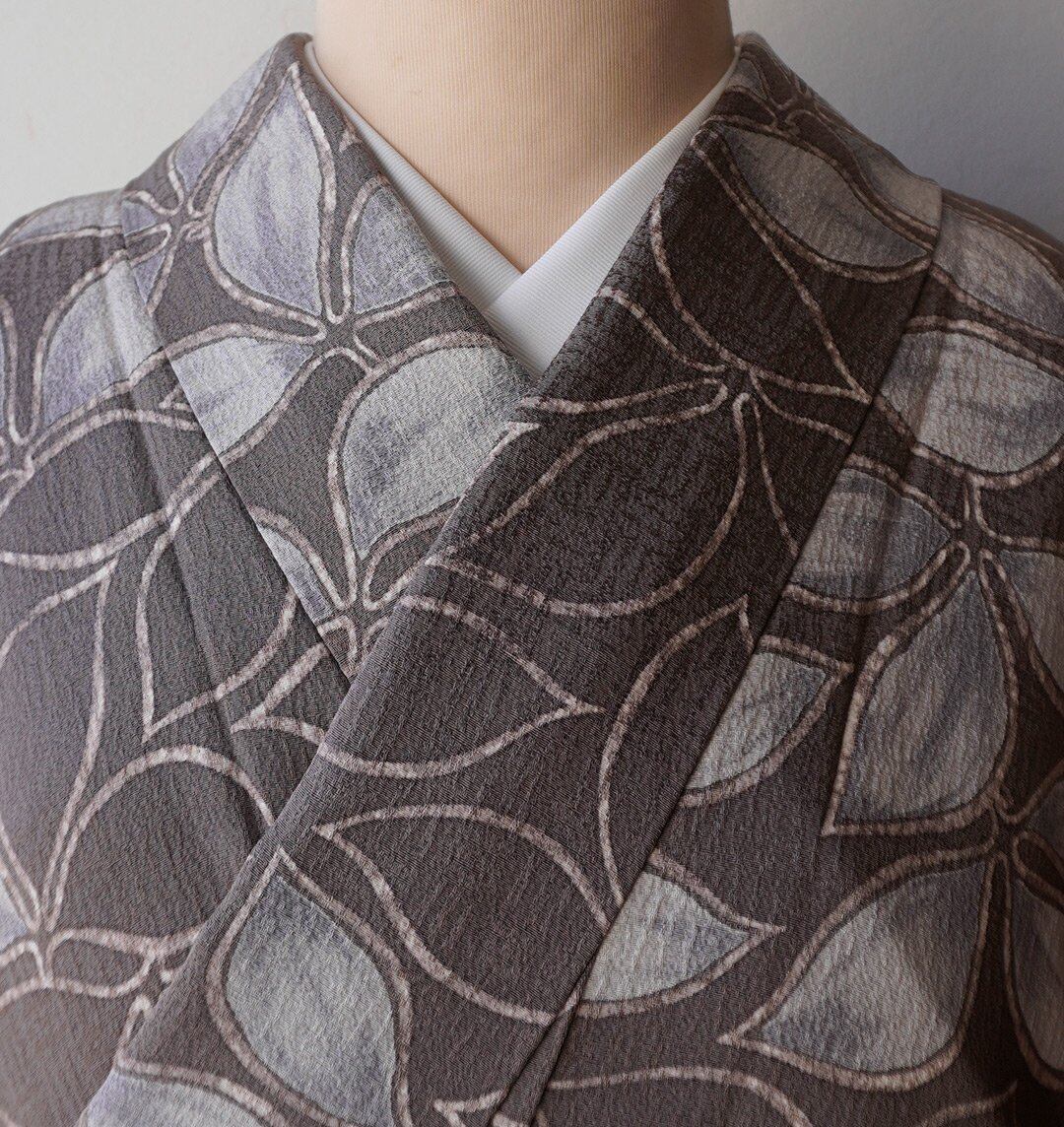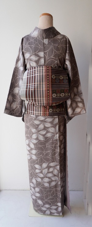 【袷】ゆったりサイズ 葡萄鼠地 抽象植物文 小紋