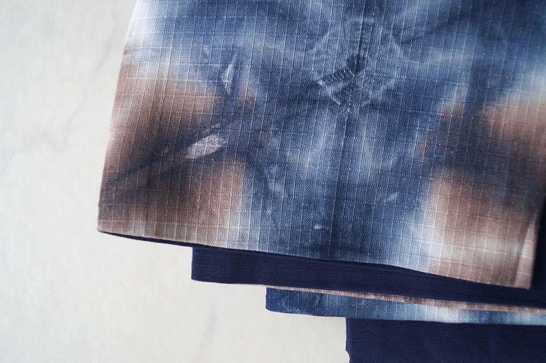 濃い藍色と赤みを帯びた茶色の雪花絞りには