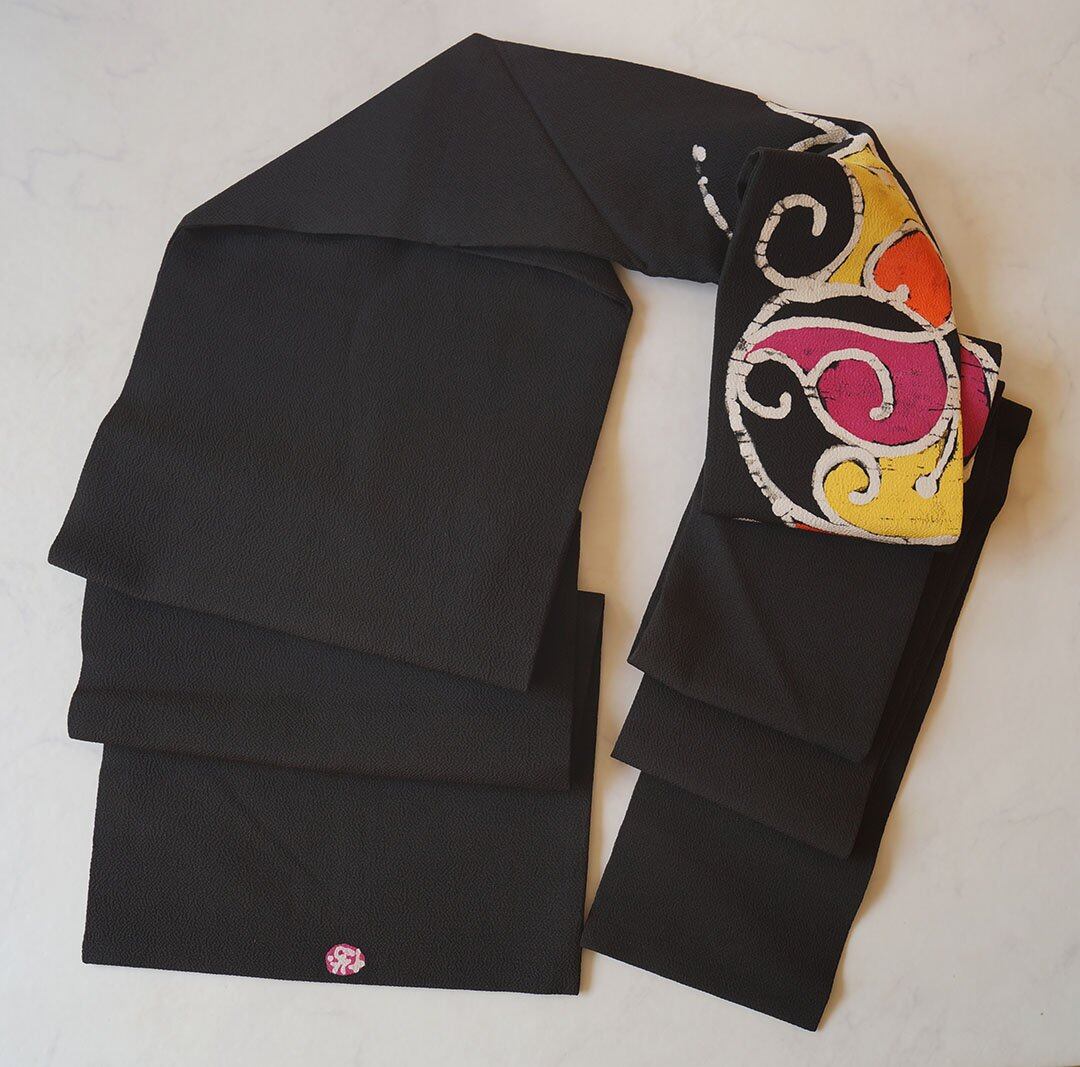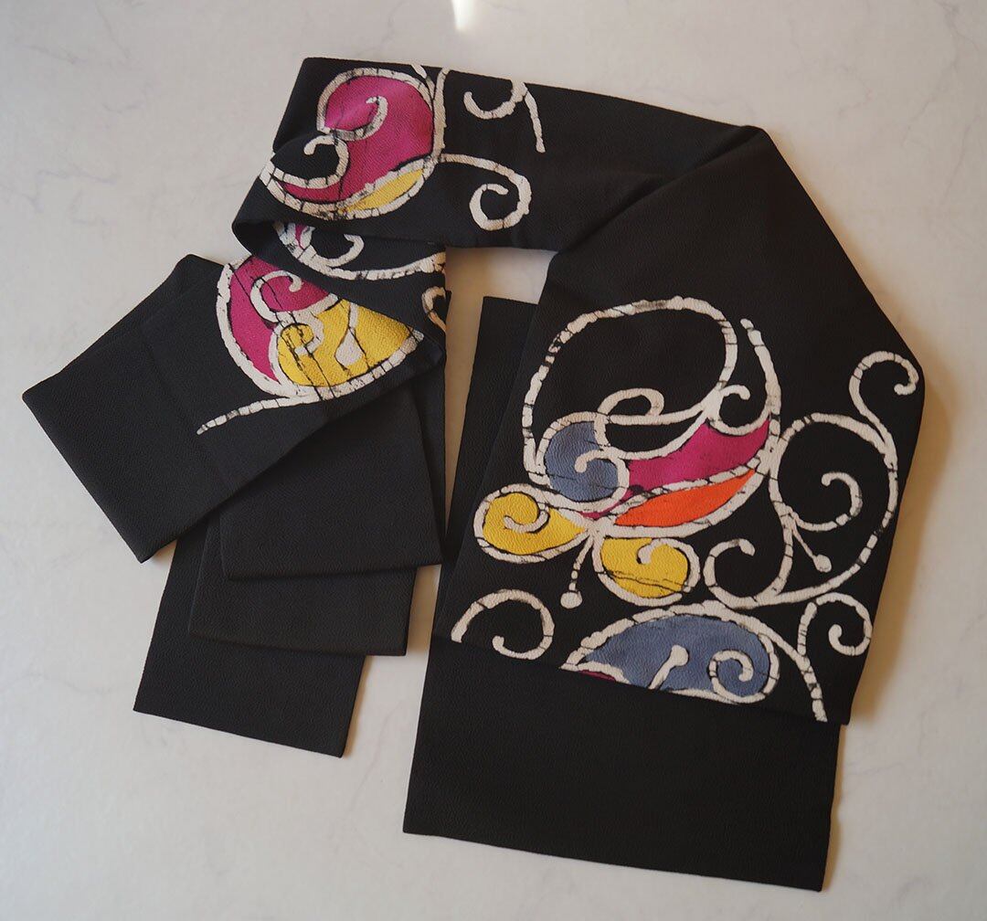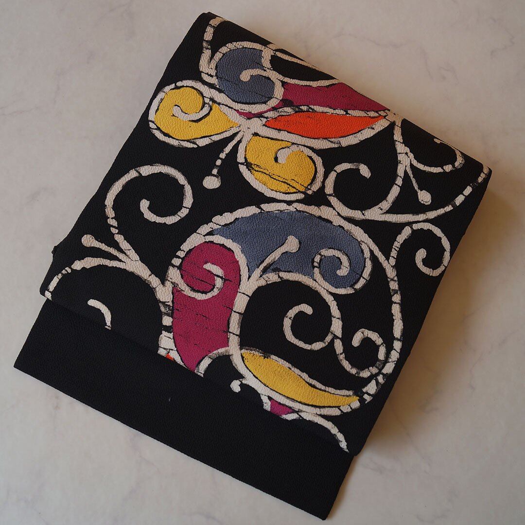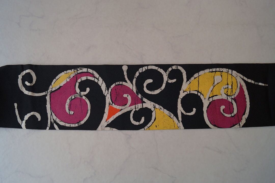 【なごや帯】黒地 抽象柄 ろうけつ染め 縮緬地 なごや帯