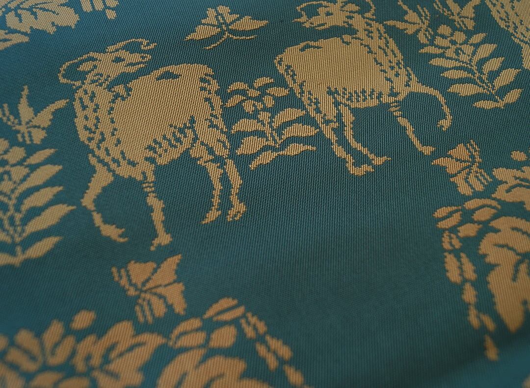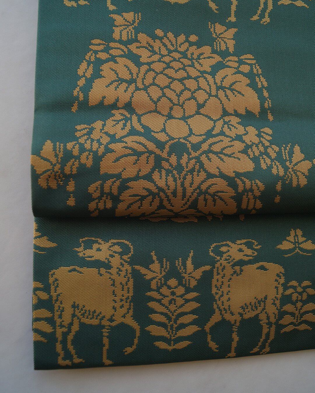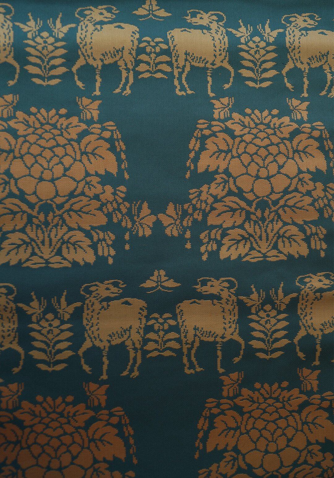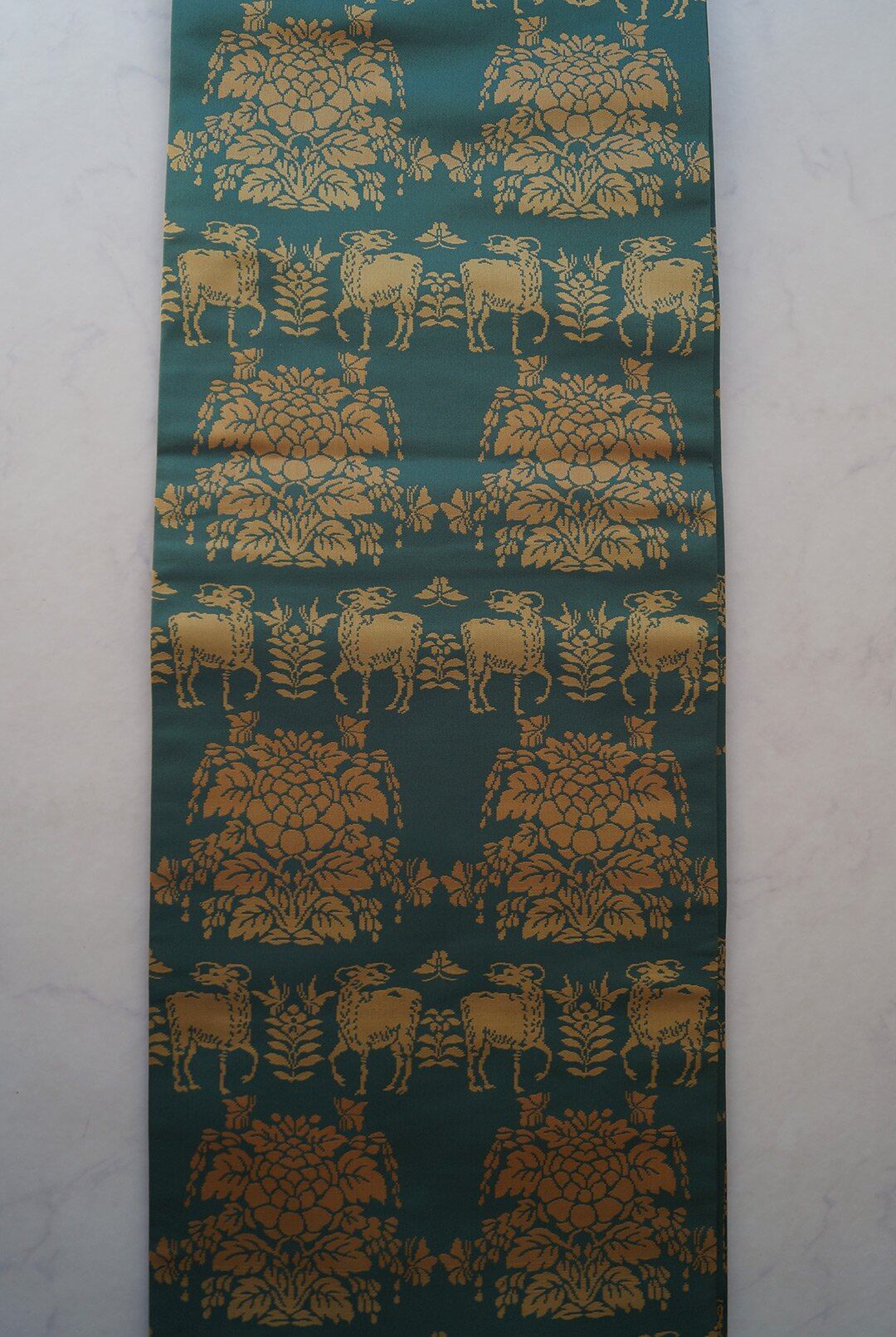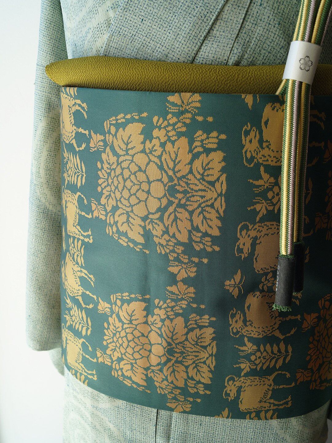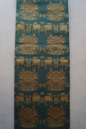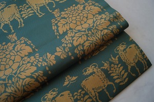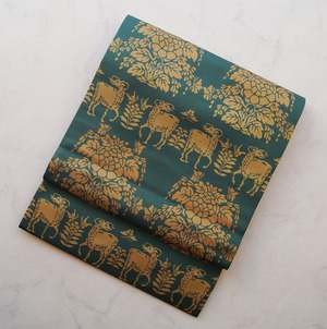虫襖色に鹿と植物文の開きなごや帯です。