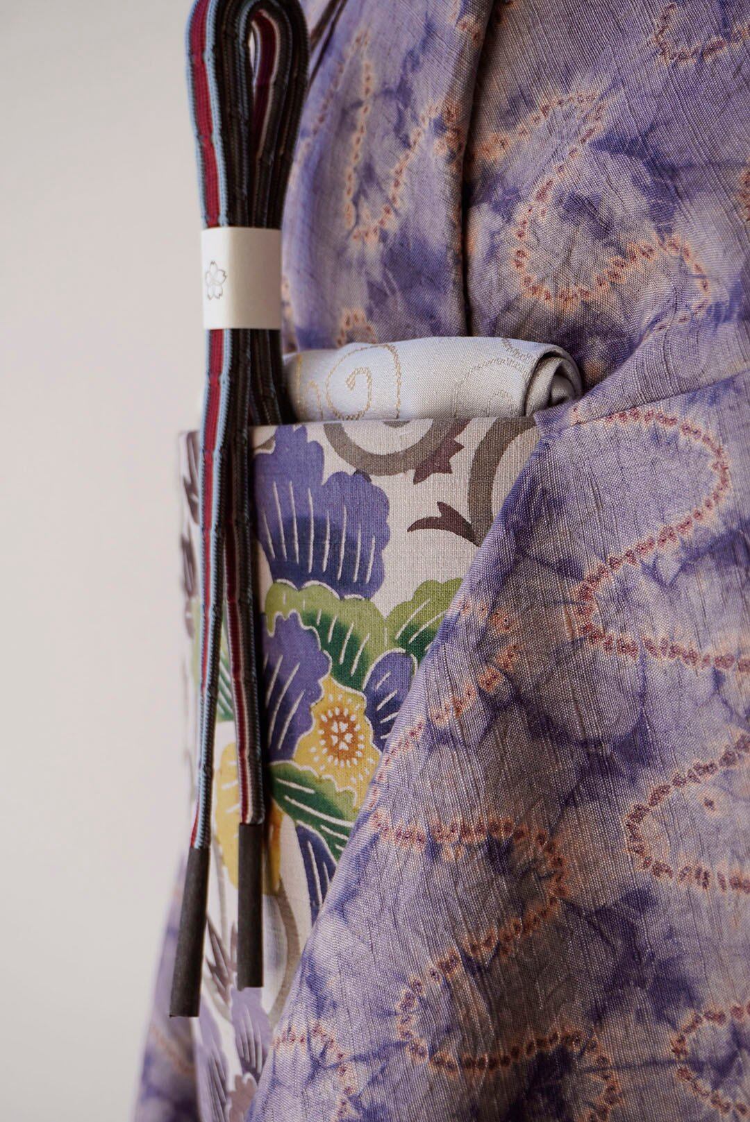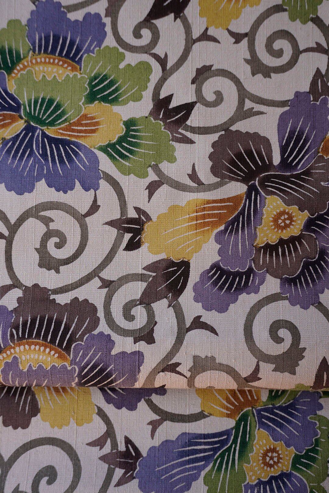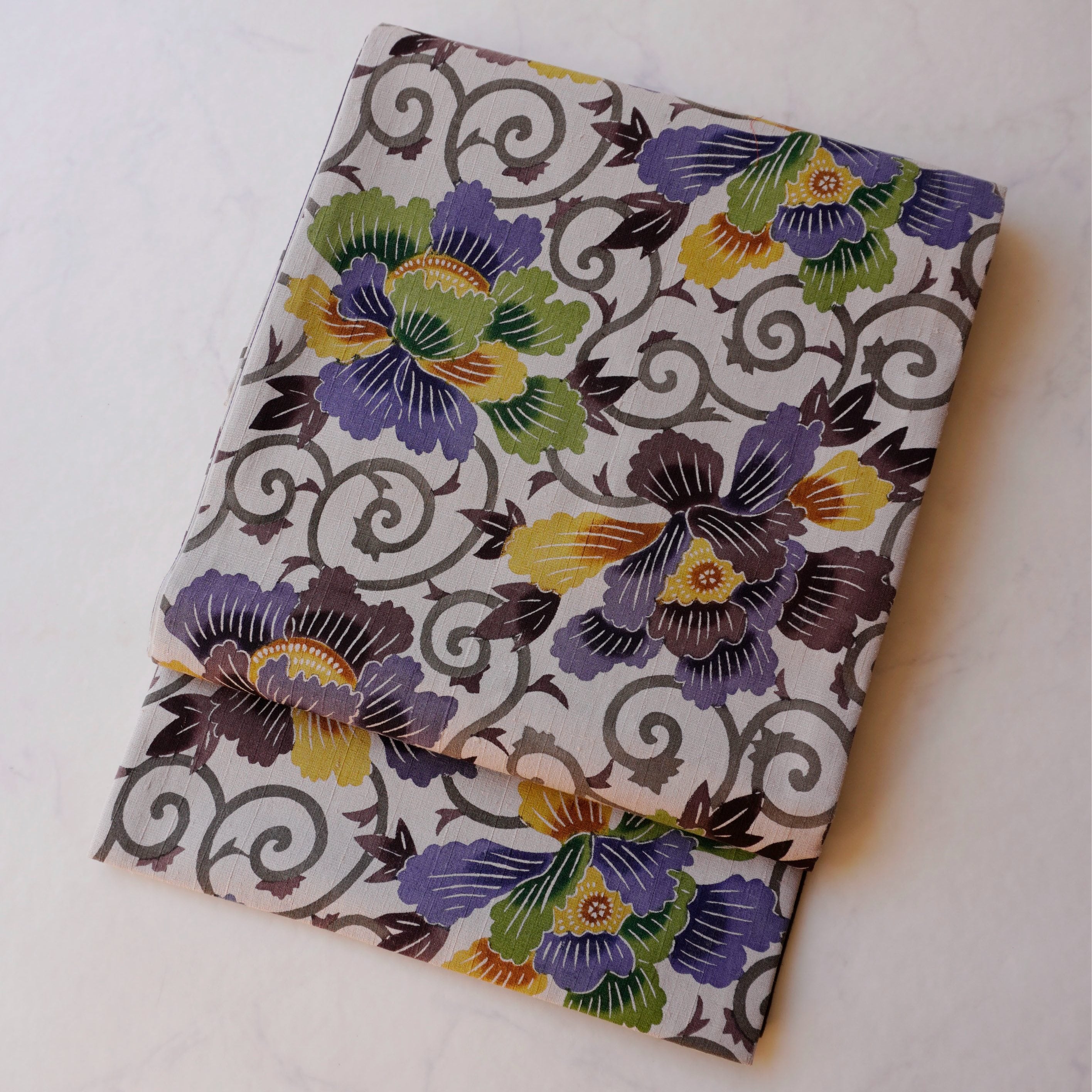 【ふくろ帯】牡丹唐草文 型染 紬地洒落ふくろ帯
